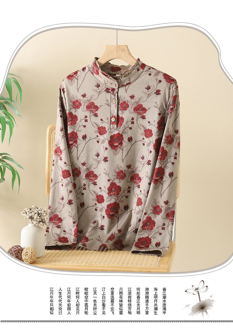 秋冬装新款印花立领套头打底衫上衣民族风时尚长袖妈妈T恤老太太 商品图3