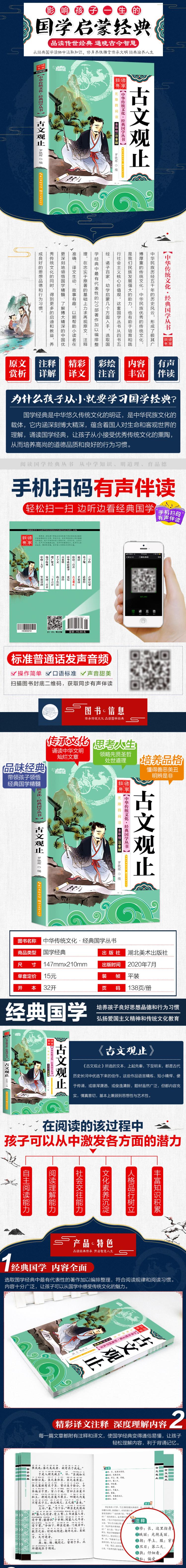 《古文观止》所选的文本,上起先秦, 下至明末, 都是古代历史长河中优选下来的佳作。这些作品语言精炼、短小精悍、便于传诵,或雄浑潇洒,或俊逸清新,题材虽然广泛,但都内容充实,情真意切,基本上兼顾到思想性与艺术性。