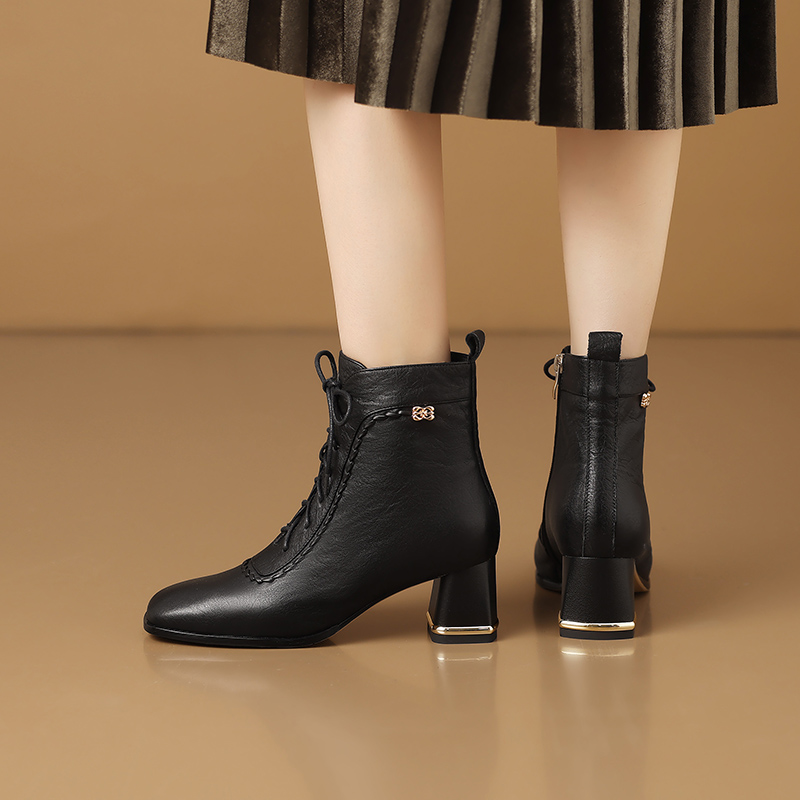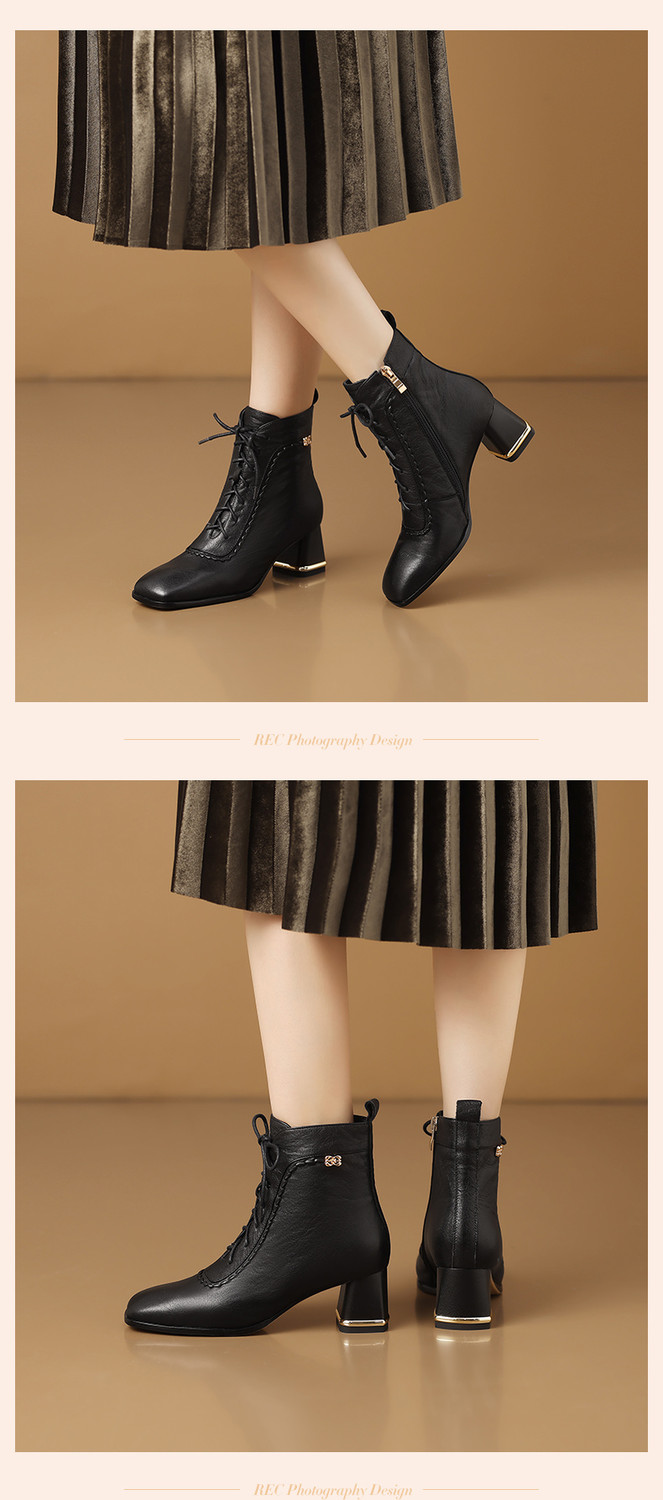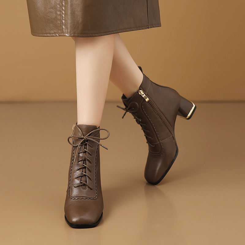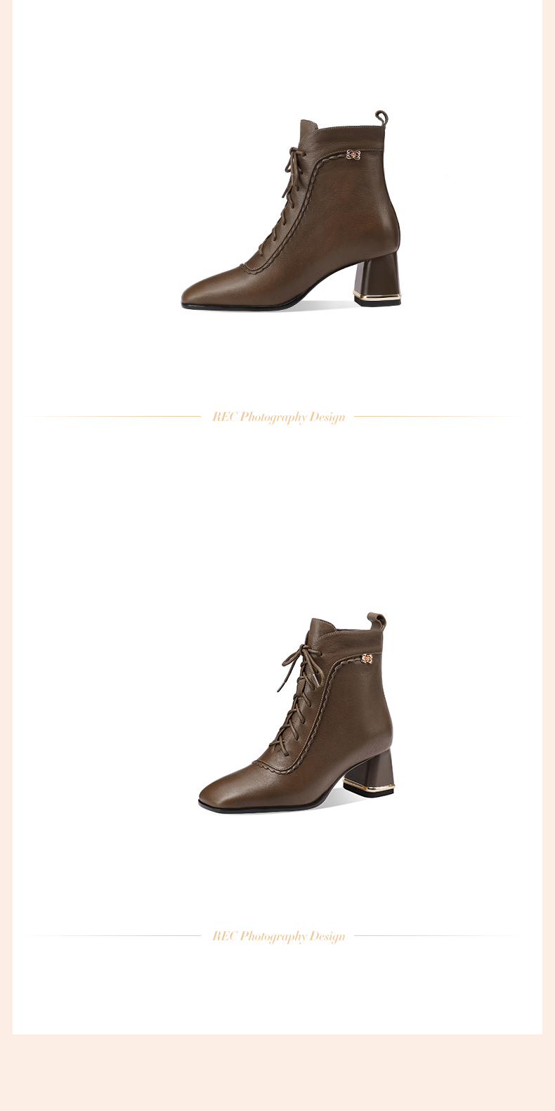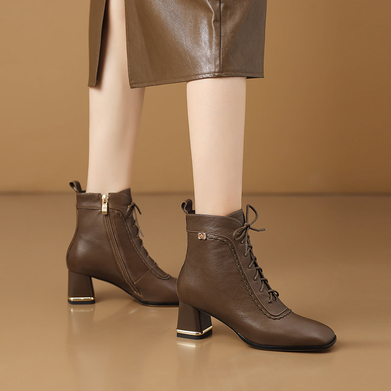 【预售5天】新款牛皮时装短靴女秋冬加绒粗跟棕色气质方头高跟系带马丁靴HY&H3742