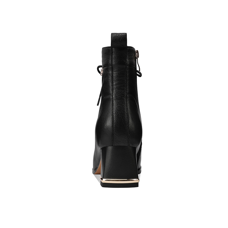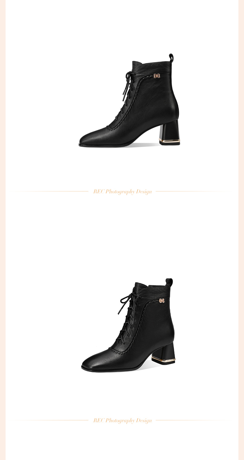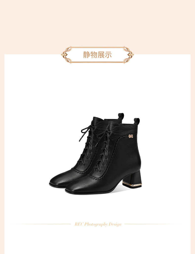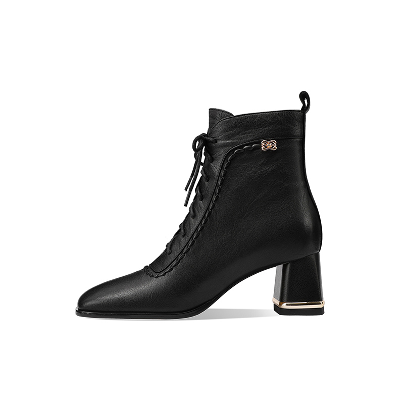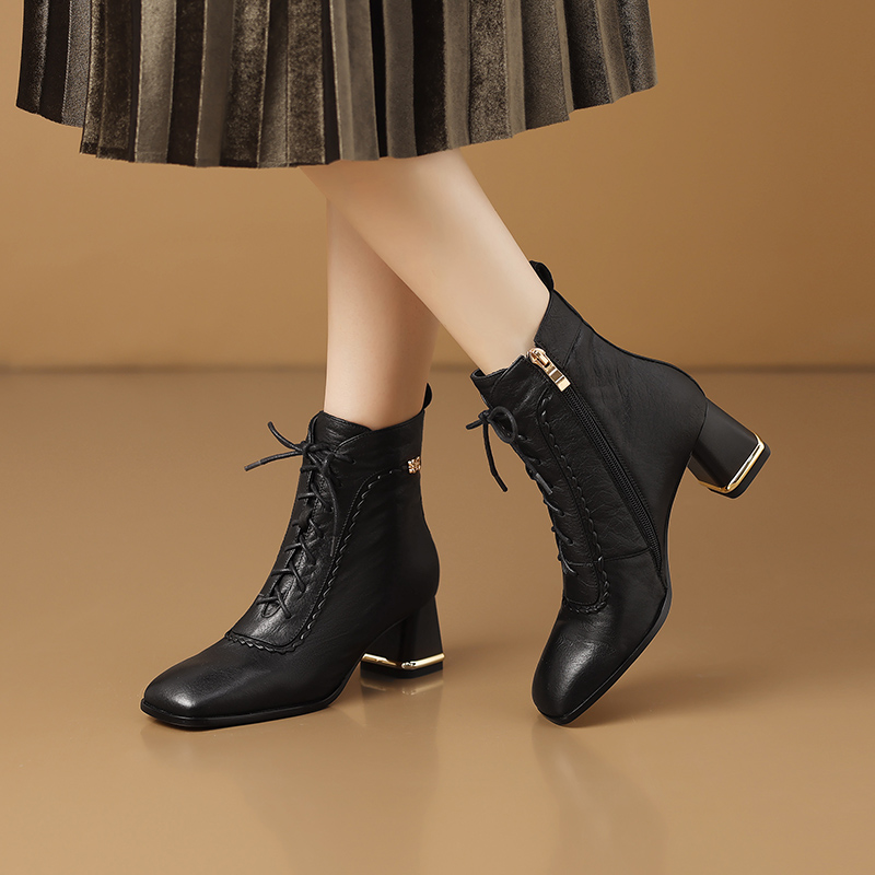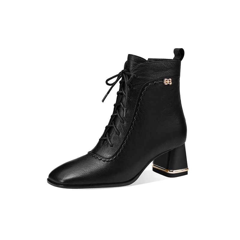 【预售5天】新款牛皮时装短靴女秋冬加绒粗跟棕色气质方头高跟系带马丁靴HY&H3742
