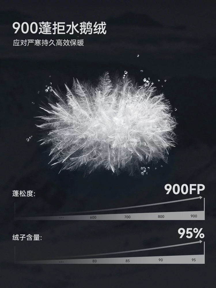 • 900蓬高品质拒水鹅绒,绒子含量高达95%,轻盈且提供强大保暖力,无惧湿冷雨雪及运动汗湿,持久高效保暖!