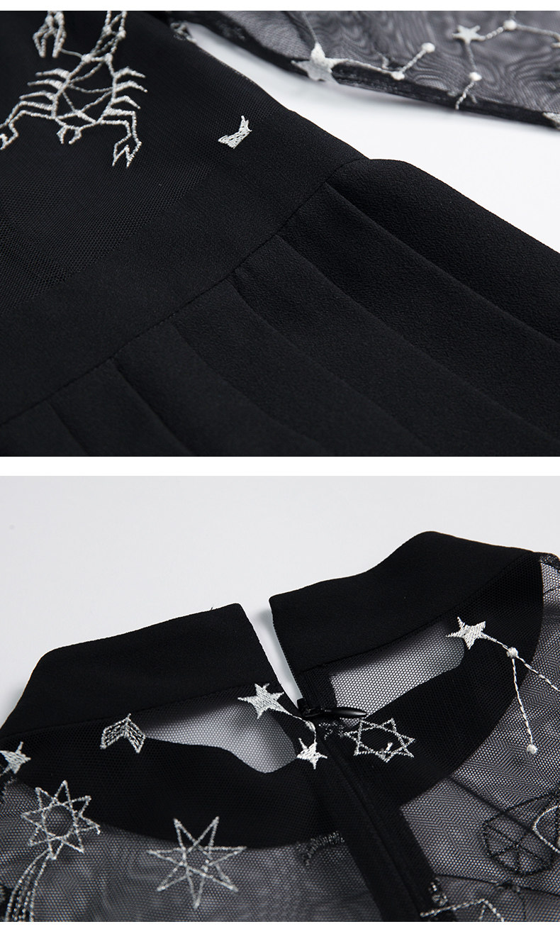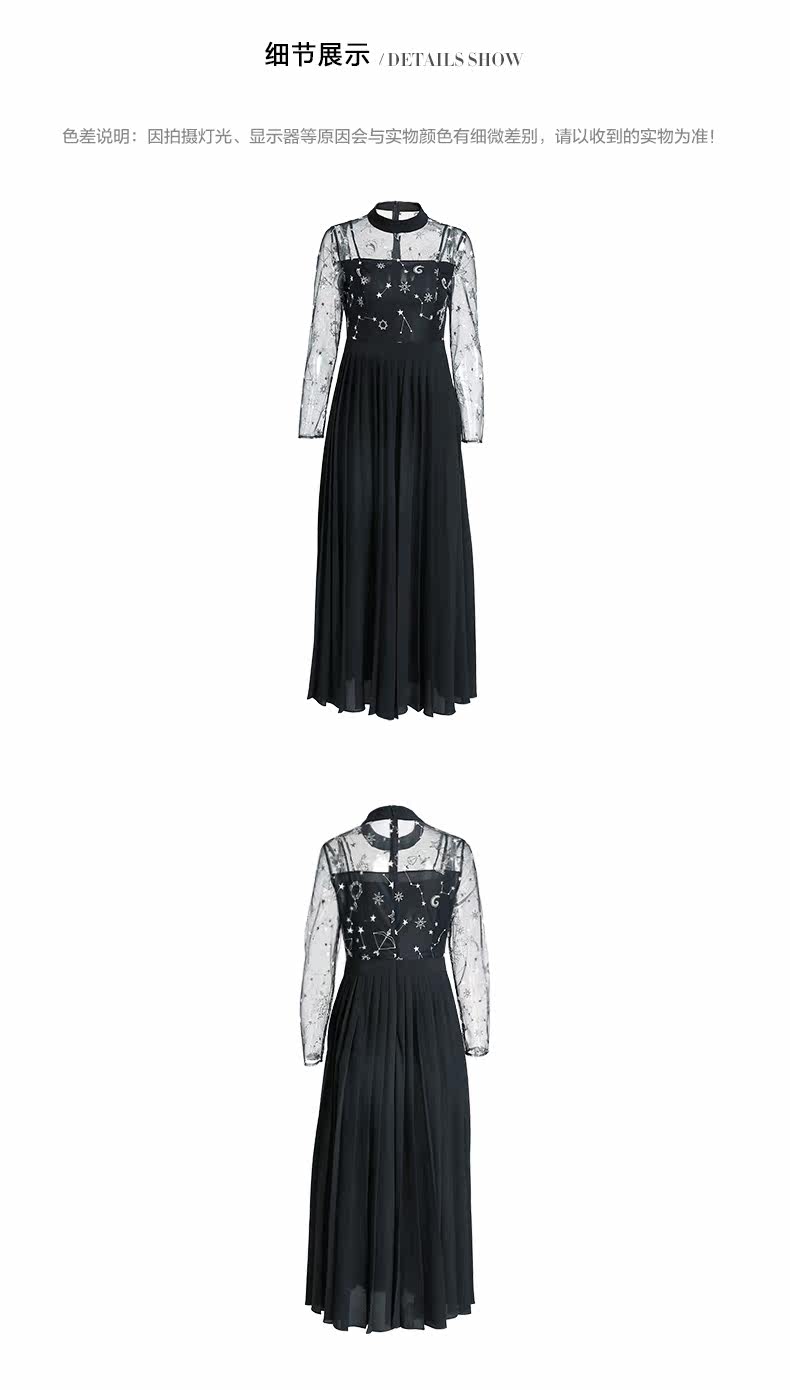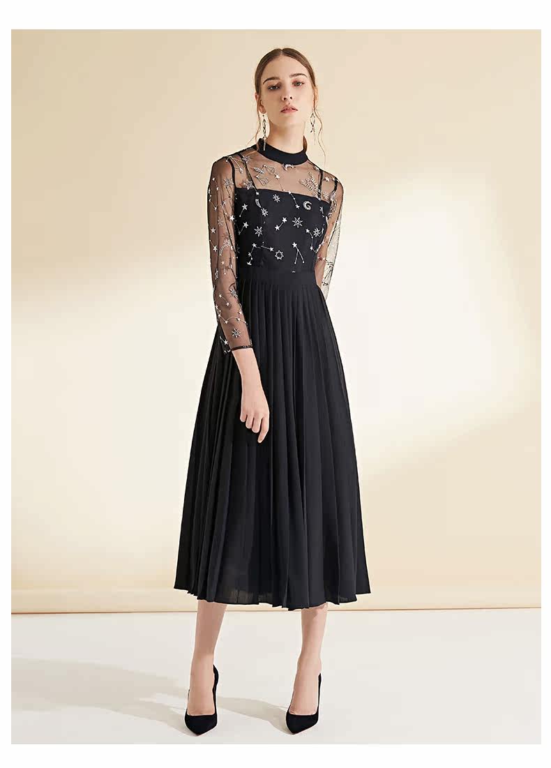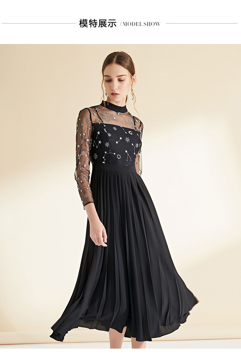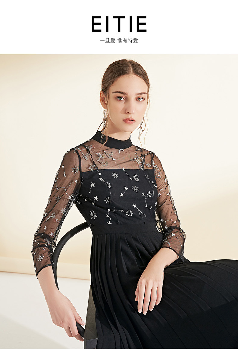 EITIE爱特爱女装初秋新款网纱绣花性感气质蓬蓬连衣裙长款黑C1907314