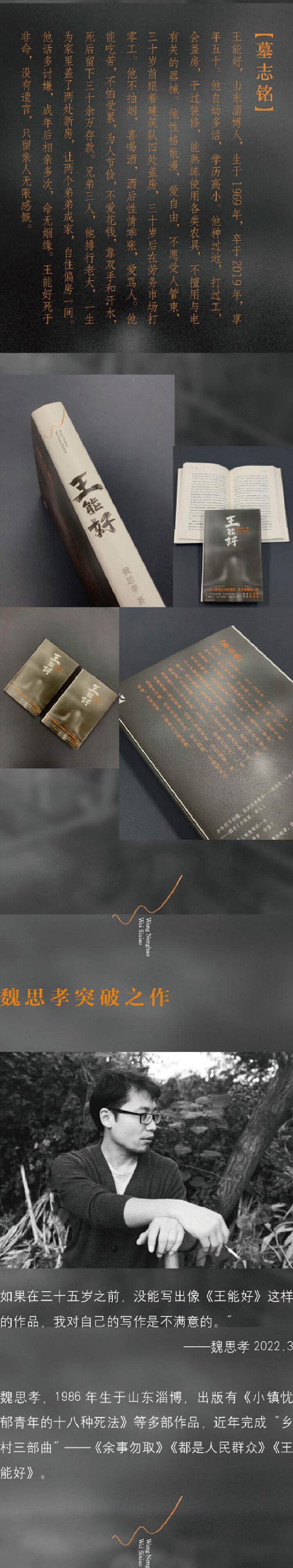 魏思孝,1986年生于山东淄博,出版有《小镇忧郁青年的十八种死法》等多部作品,近年完成“乡村三部曲”——《余事勿取》《都是人民群众》《王能好》。