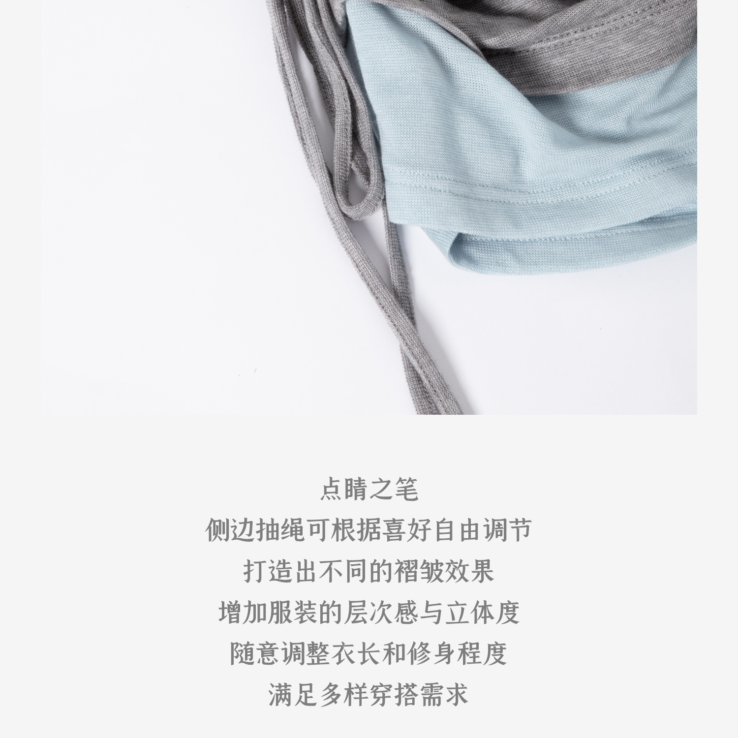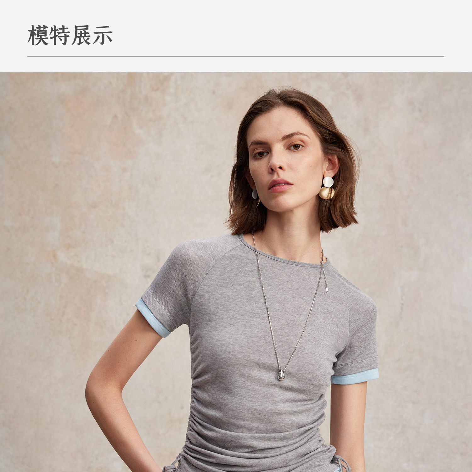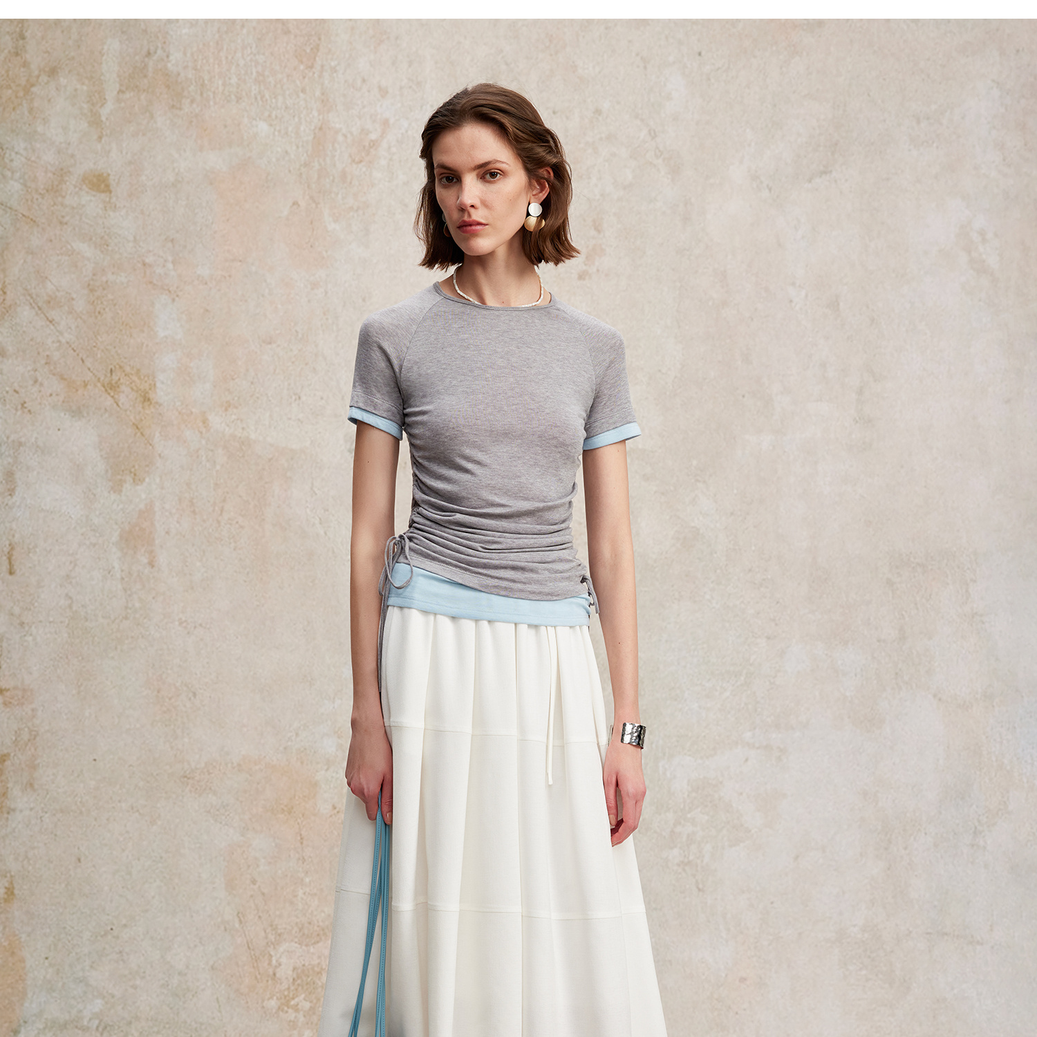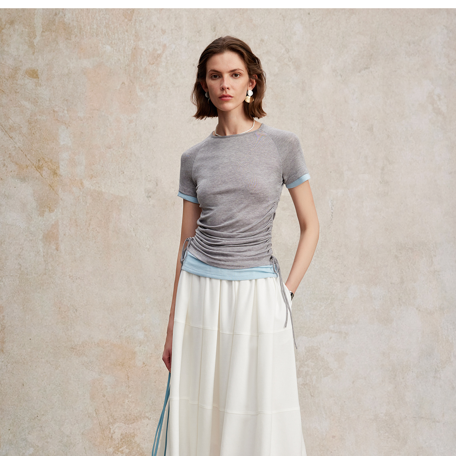 兰精天丝羊毛假两件抽绳修身T恤2025夏新T2502001