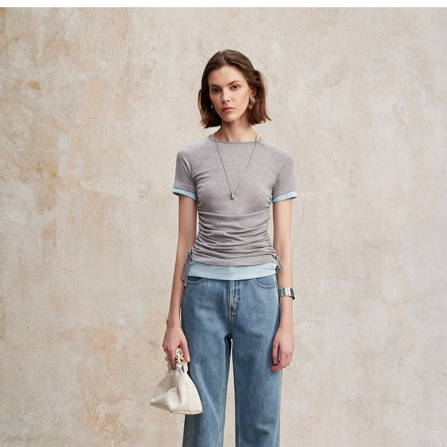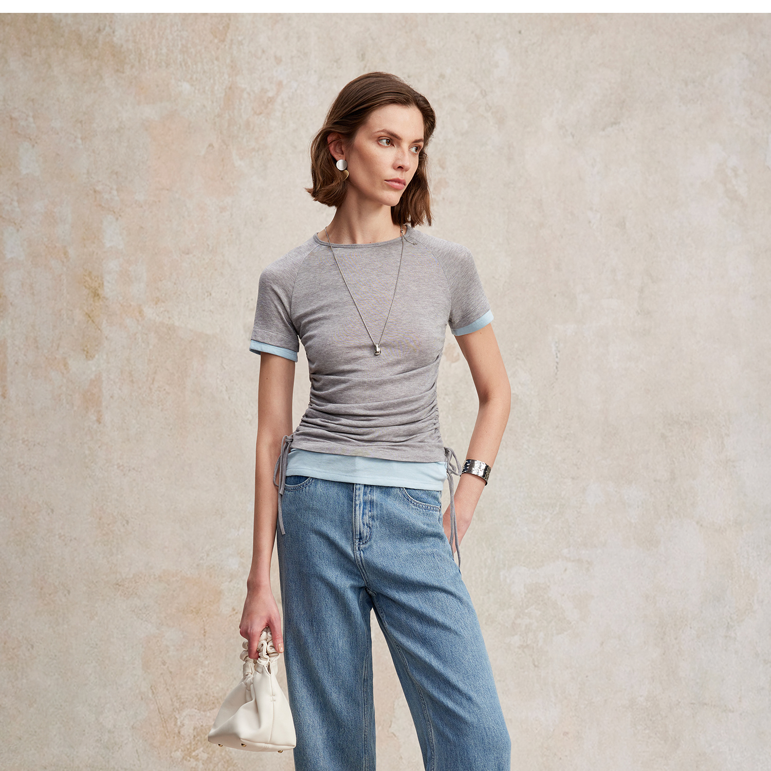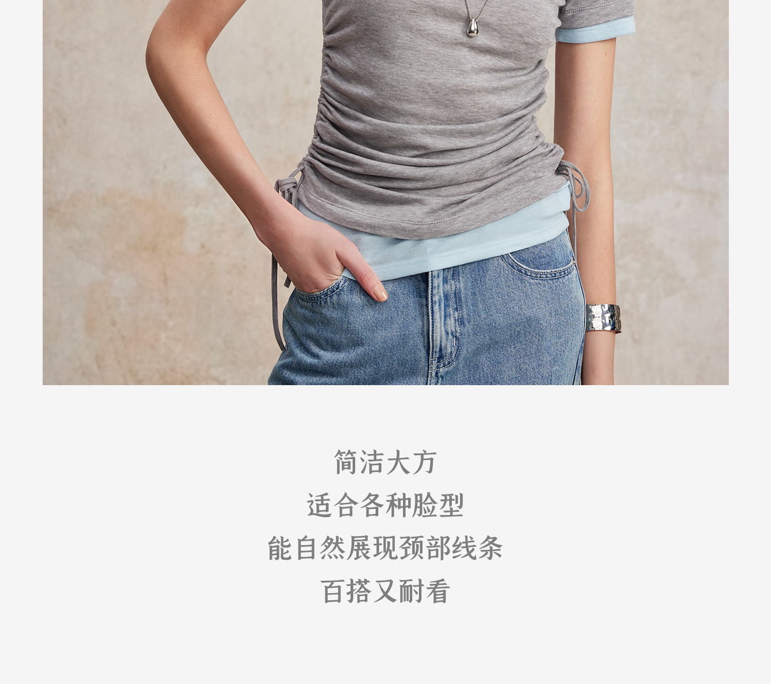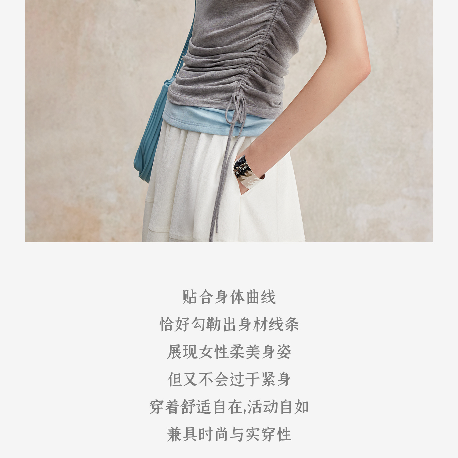 兰精天丝羊毛假两件抽绳修身T恤2025夏新T2502001