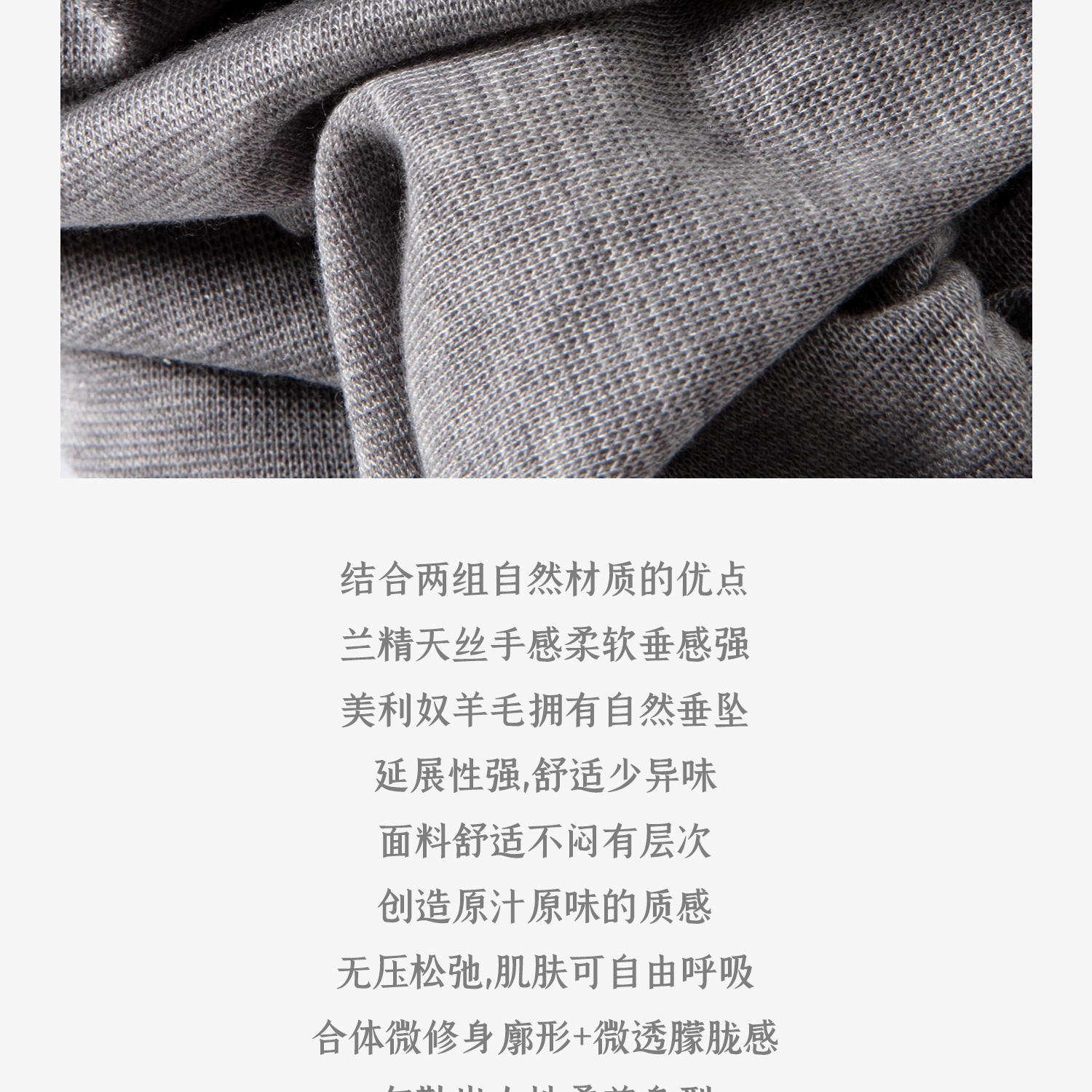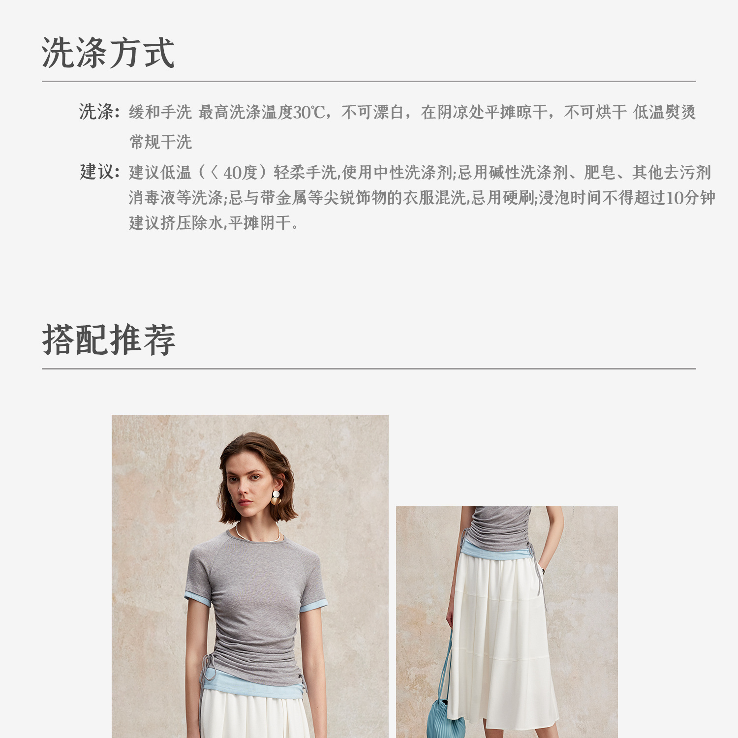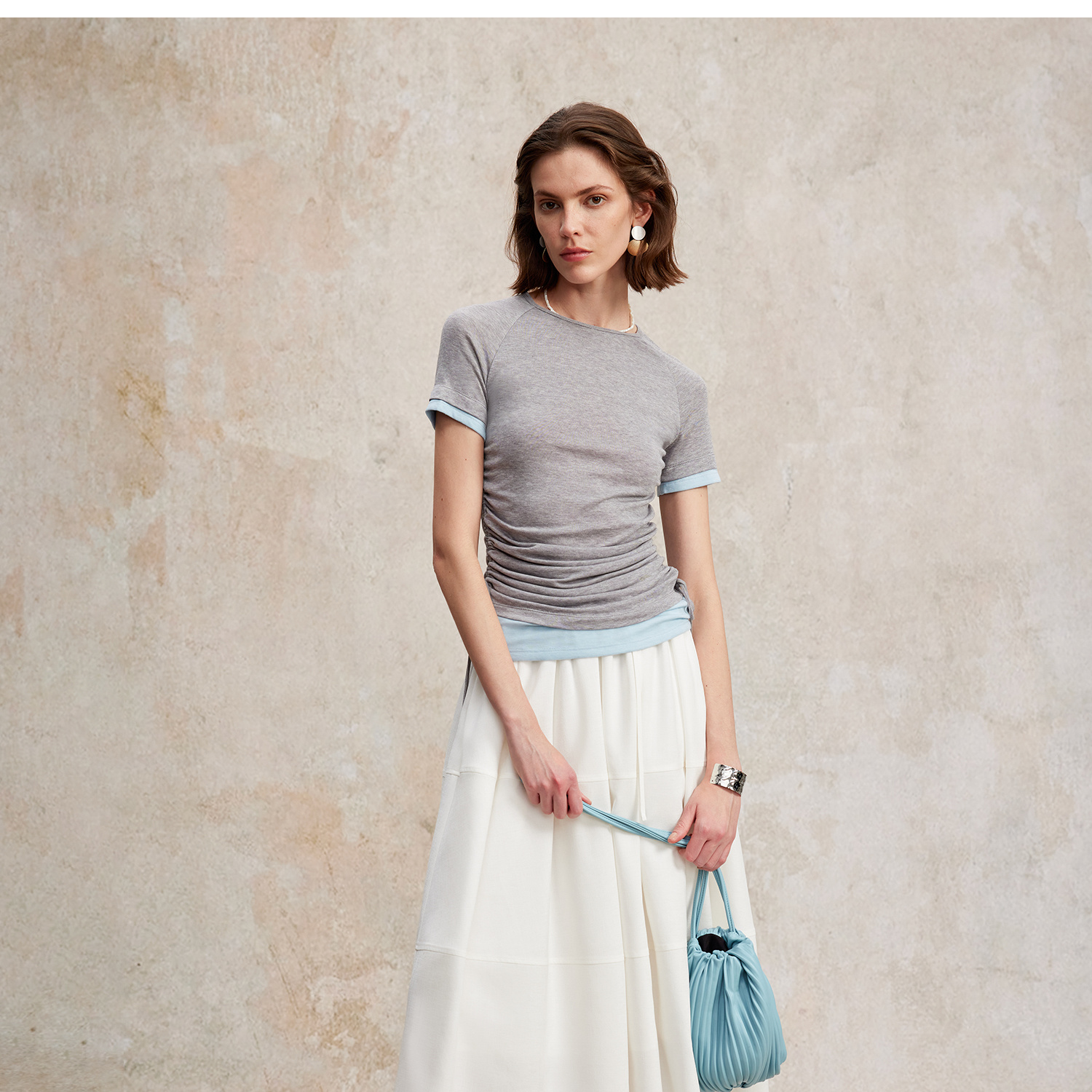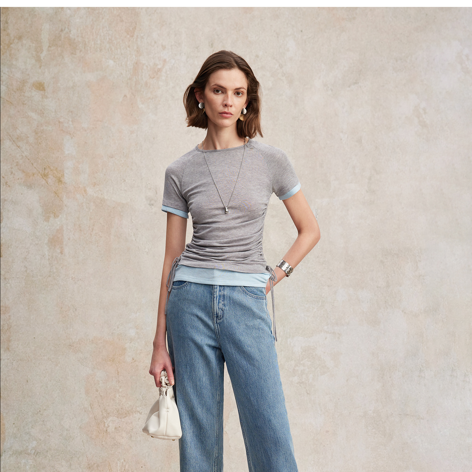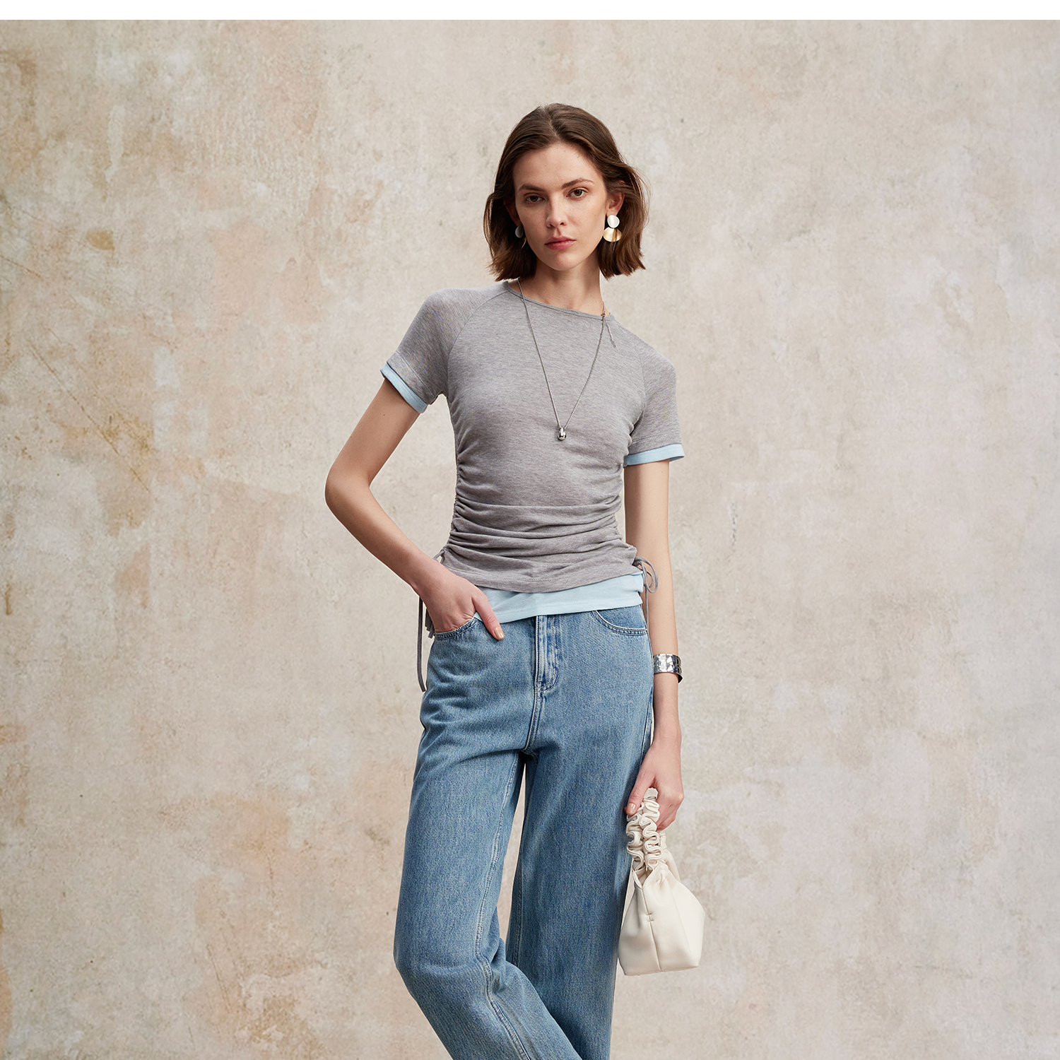 兰精天丝羊毛假两件抽绳修身T恤2025夏新T2502001