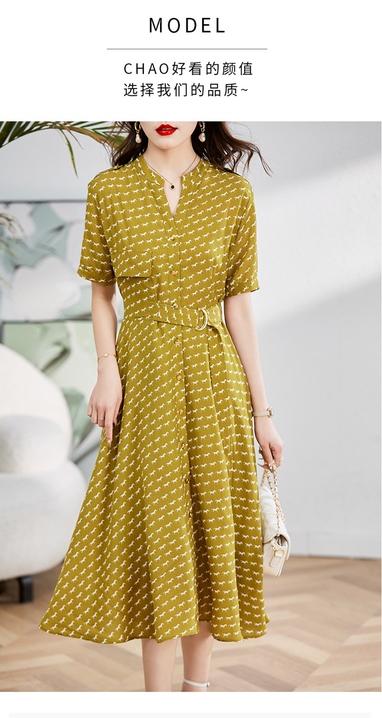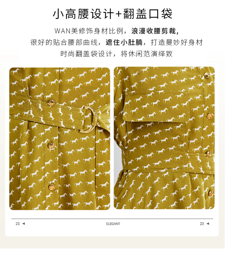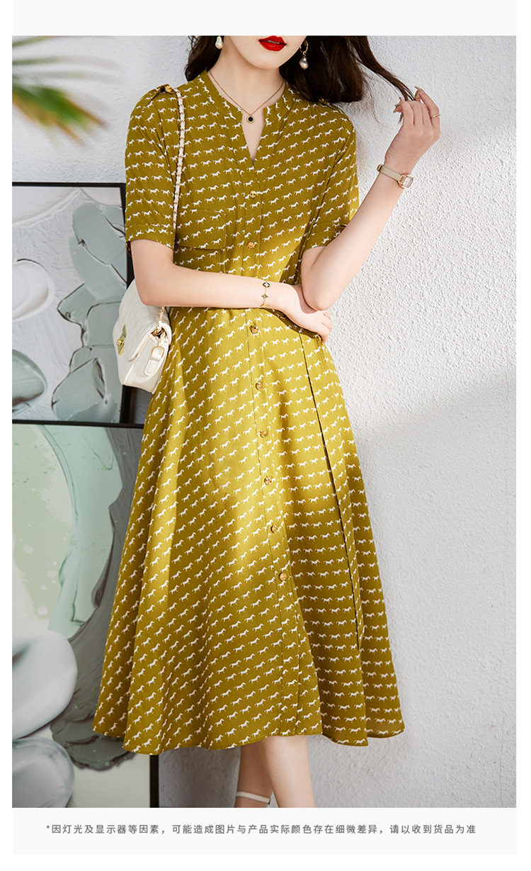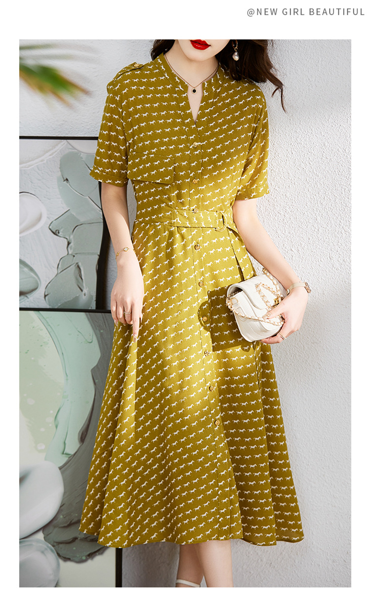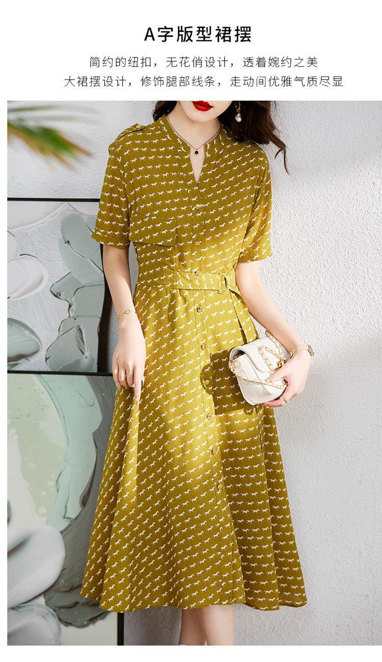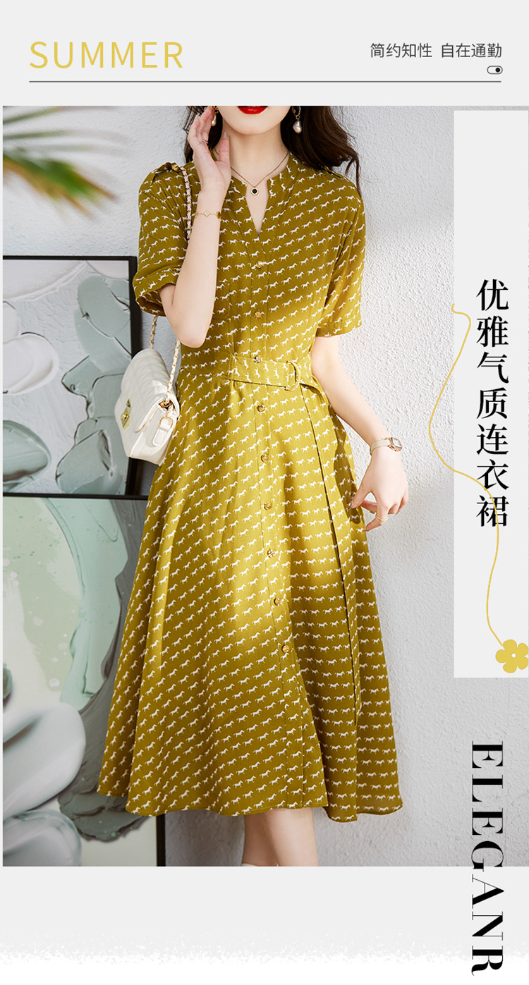 气质修身,V领印花束腰显瘦中长款裙子单排扣连衣裙HR-WL6159