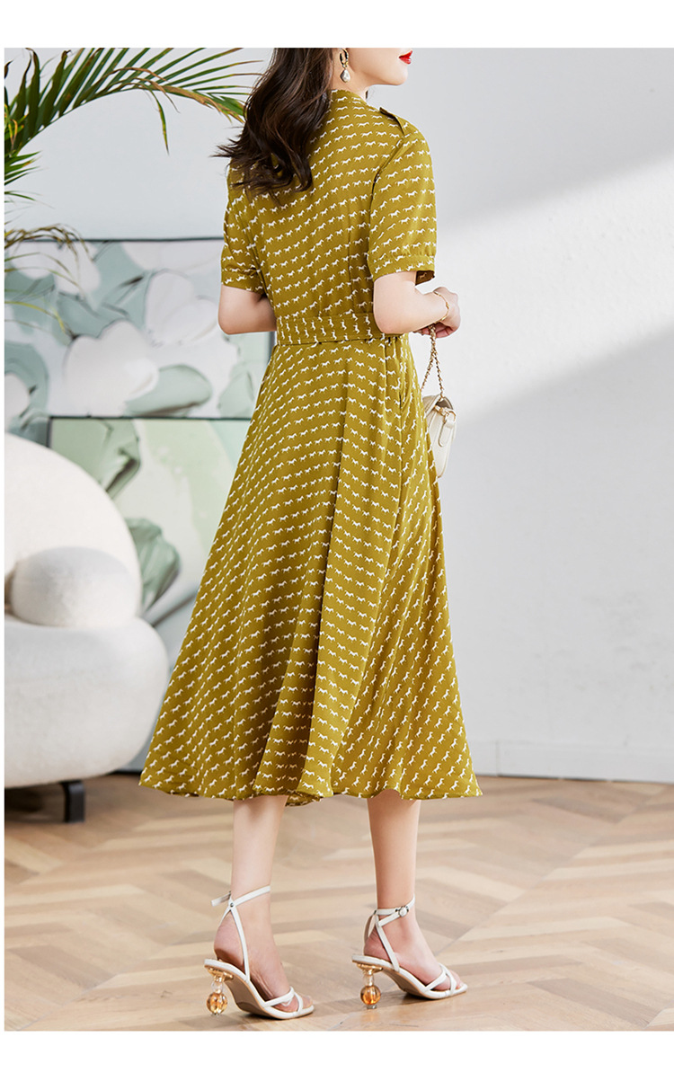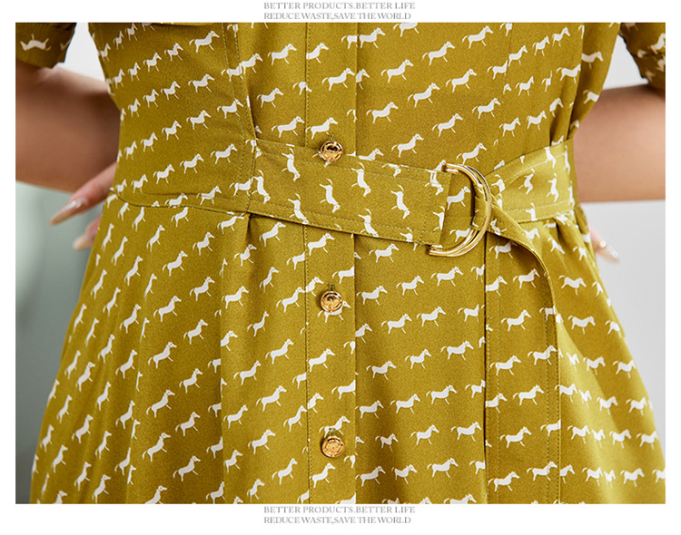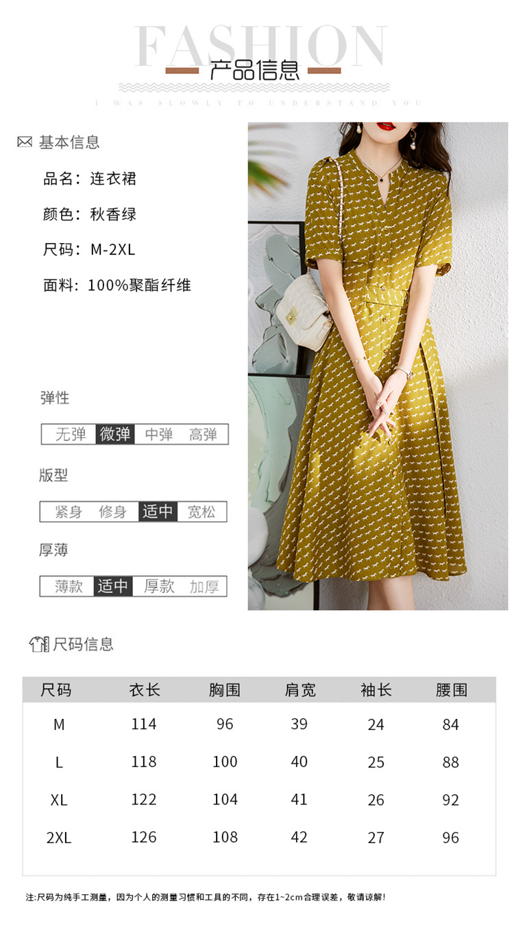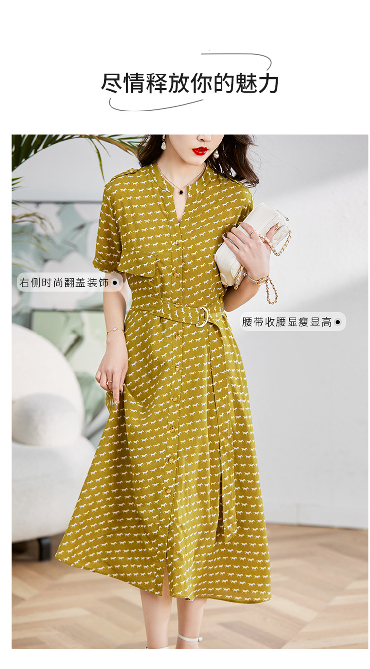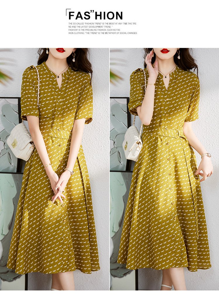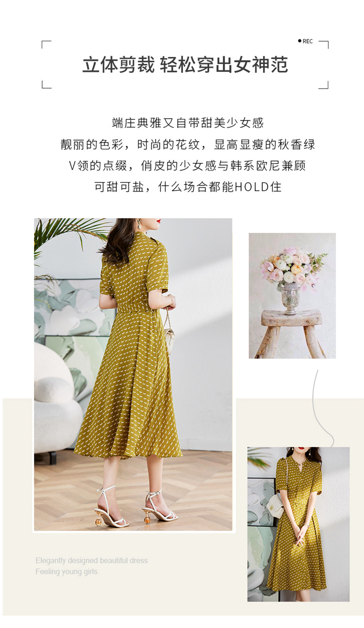 气质修身,V领印花束腰显瘦中长款裙子单排扣连衣裙HR-WL6159