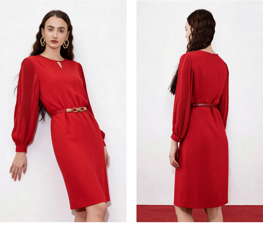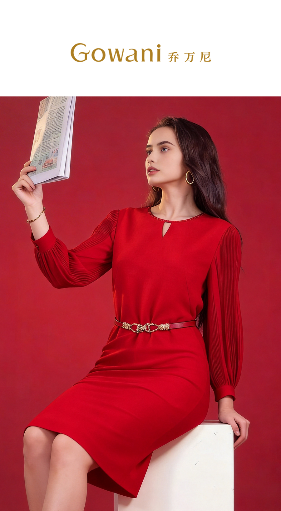 乔万尼新品精致钉珠设计拼接长袖收腰连衣裙ED1E906