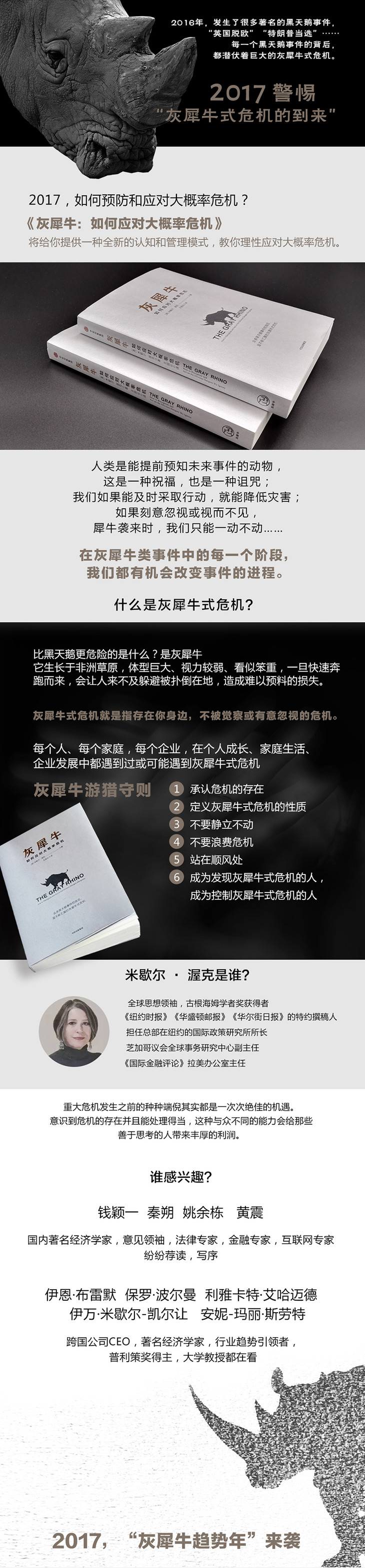 shijie目前亟须转变危机管理范式。这部著作能很好地解决我们自己造成的、一点一点忽视的或是决定彻底无视的常见危机。当你看到你犀牛来到你面前的时候,就已经太晚了。灾难和黑天鹅已经进入我们的常用词汇序列。不久,灰犀牛也会成我们的常用词汇之一。