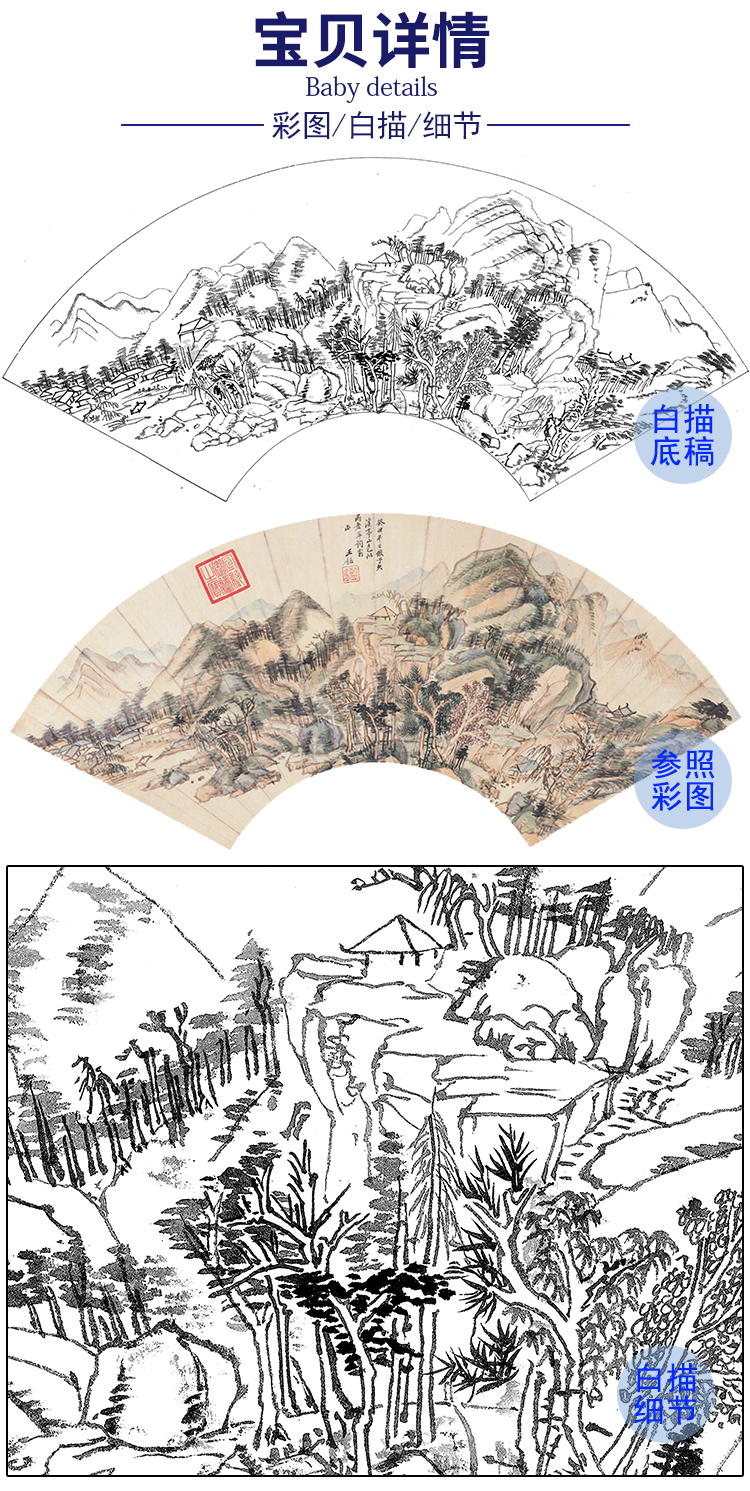 工笔画白描底稿 扇面小品 清 王鉴 山水图 SR40