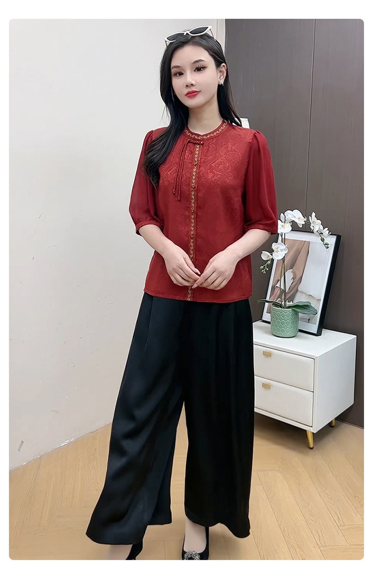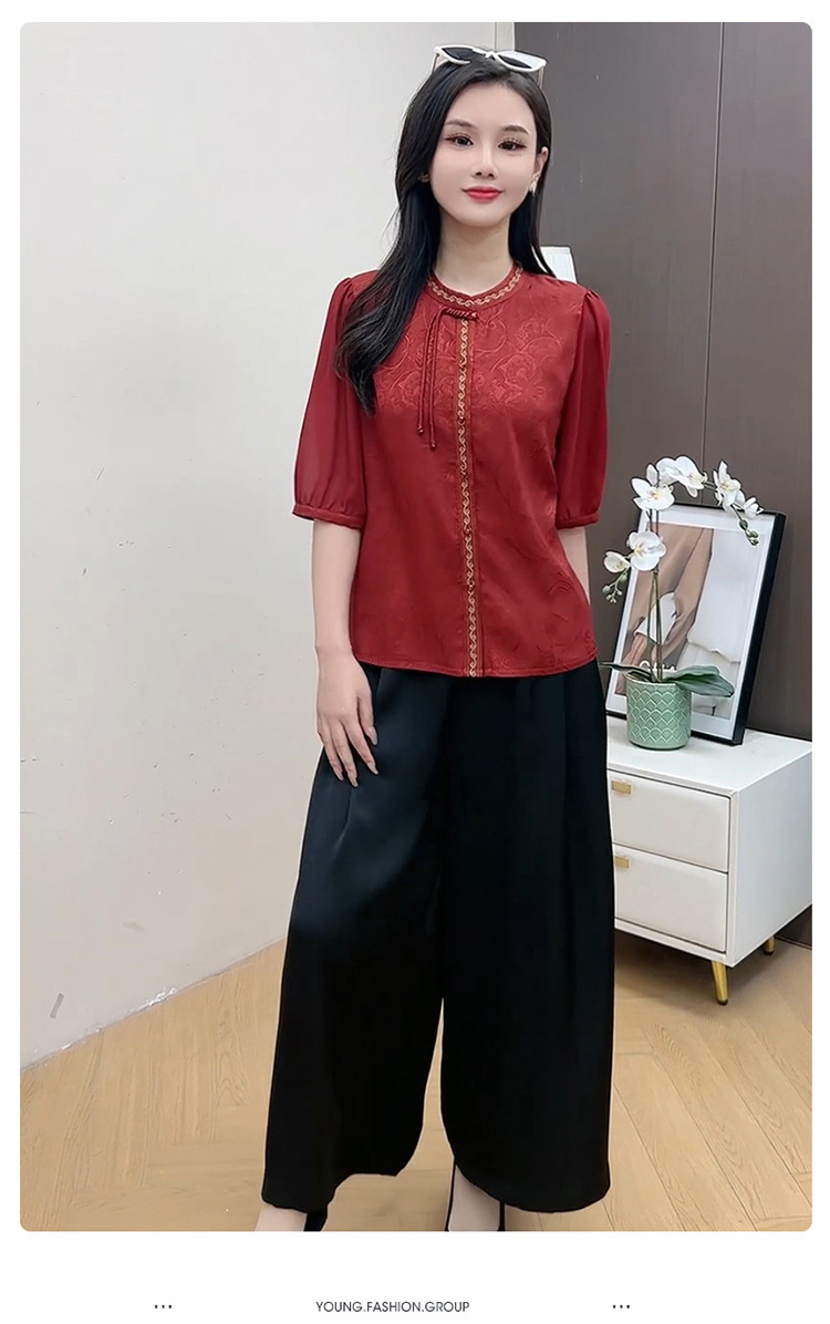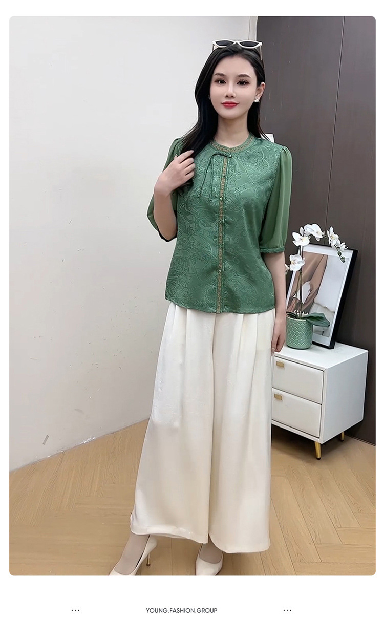 QYMYJ-25DS629-L 2025夏季新款新中式气质优雅中袖小衫垂感宽松阔腿裤妈妈装两件套 商品图0