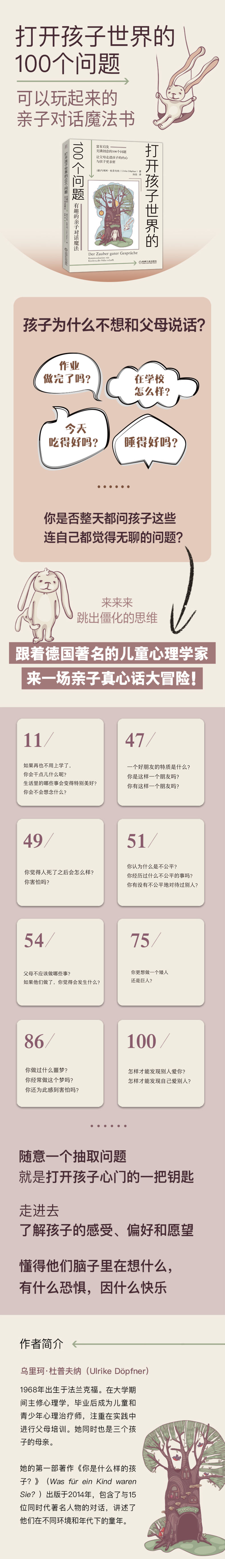 本书卖点及核心观点:1. 孩子不愿意和你说话?德国著名儿童和青少年心理学家写给父母和孩子的对话魔法书2. 话题无聊不想谈?用新奇的问题回应孩子的好奇心和想象力,用孩子的思维与孩子对话4. 孩子苦恼不想说?转一个弯,用心理学设计问题,看到孩子的恐惧、烦恼和愿望……