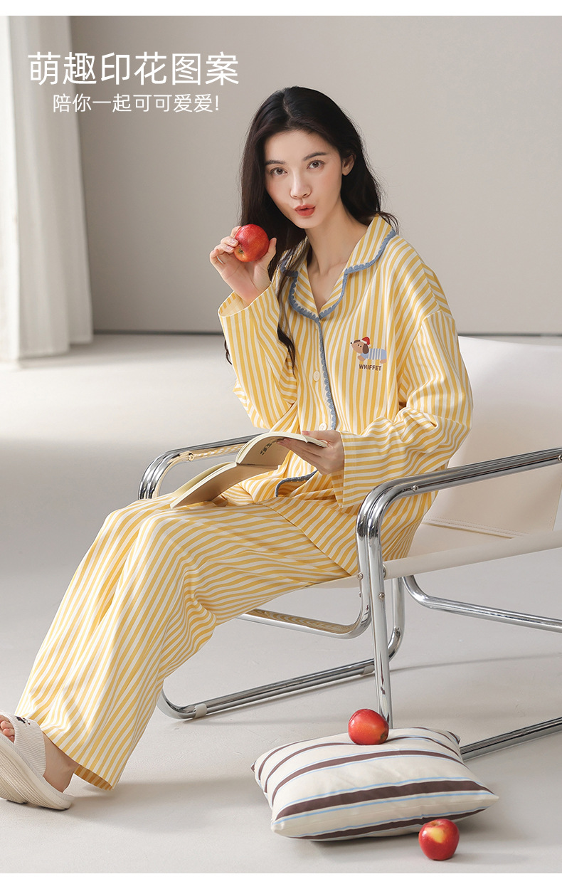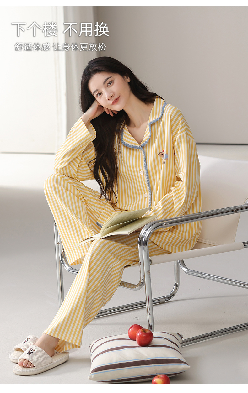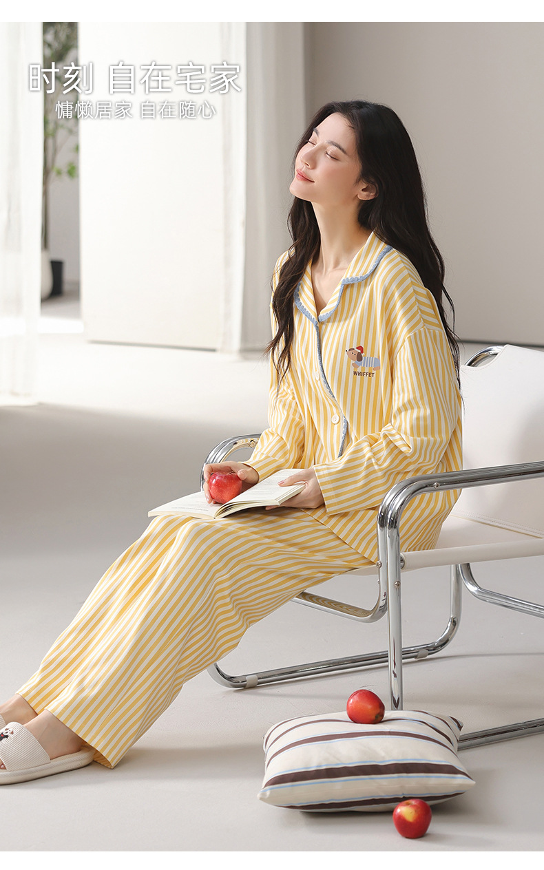 雀说纯棉睡衣女春秋季长袖开衫翻领家居服套装简约休闲可外穿ALW02G412345