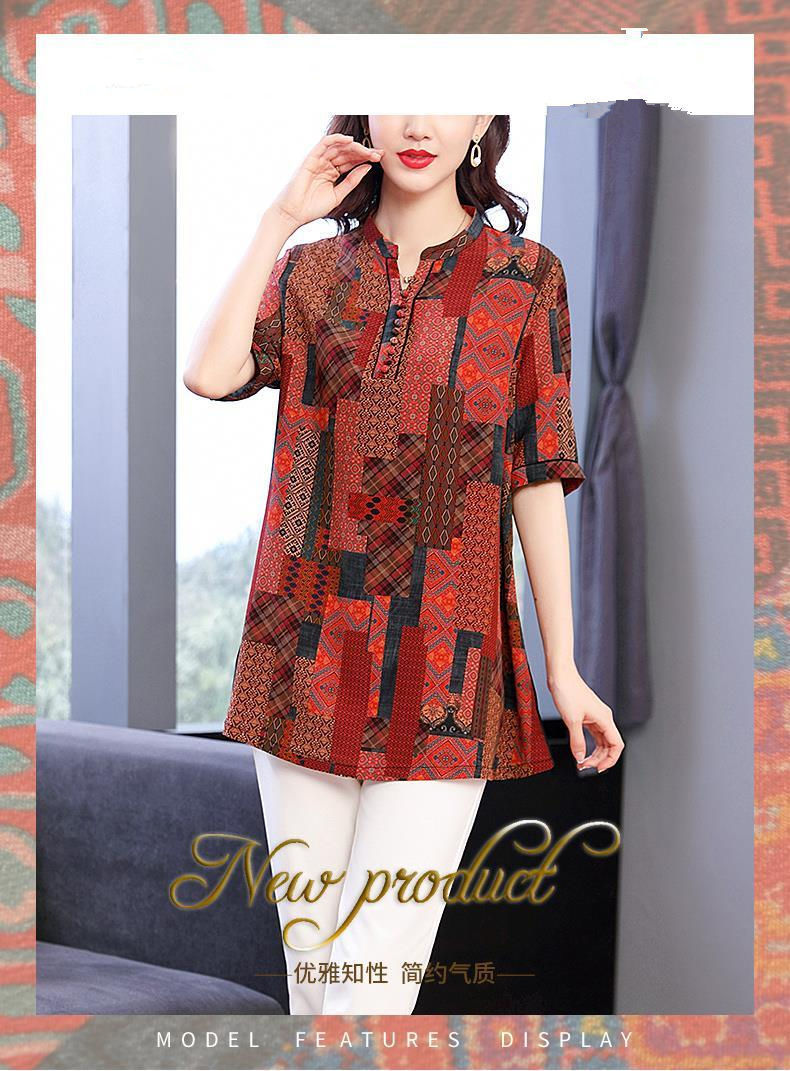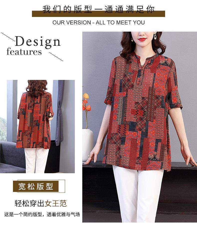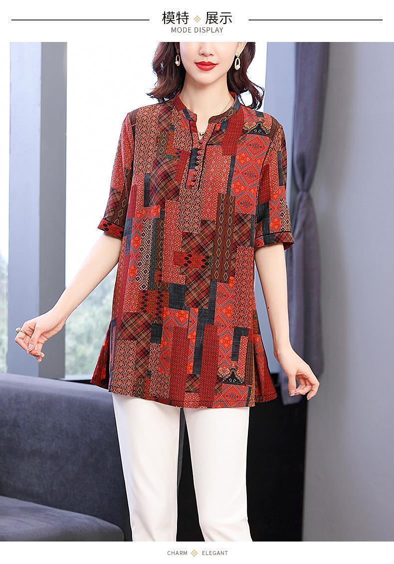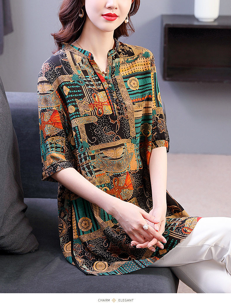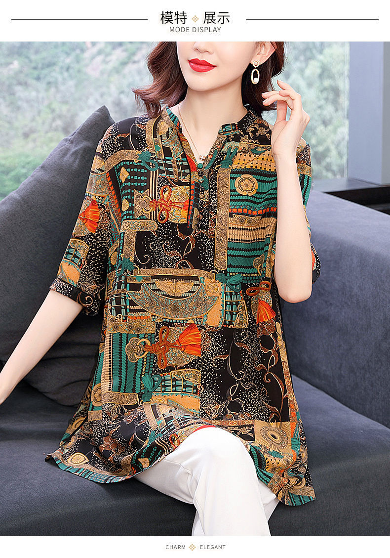 dp3104 胖妈妈时尚印花桑蚕丝中长款T恤2022夏季新款中老年宽松遮肚上衣