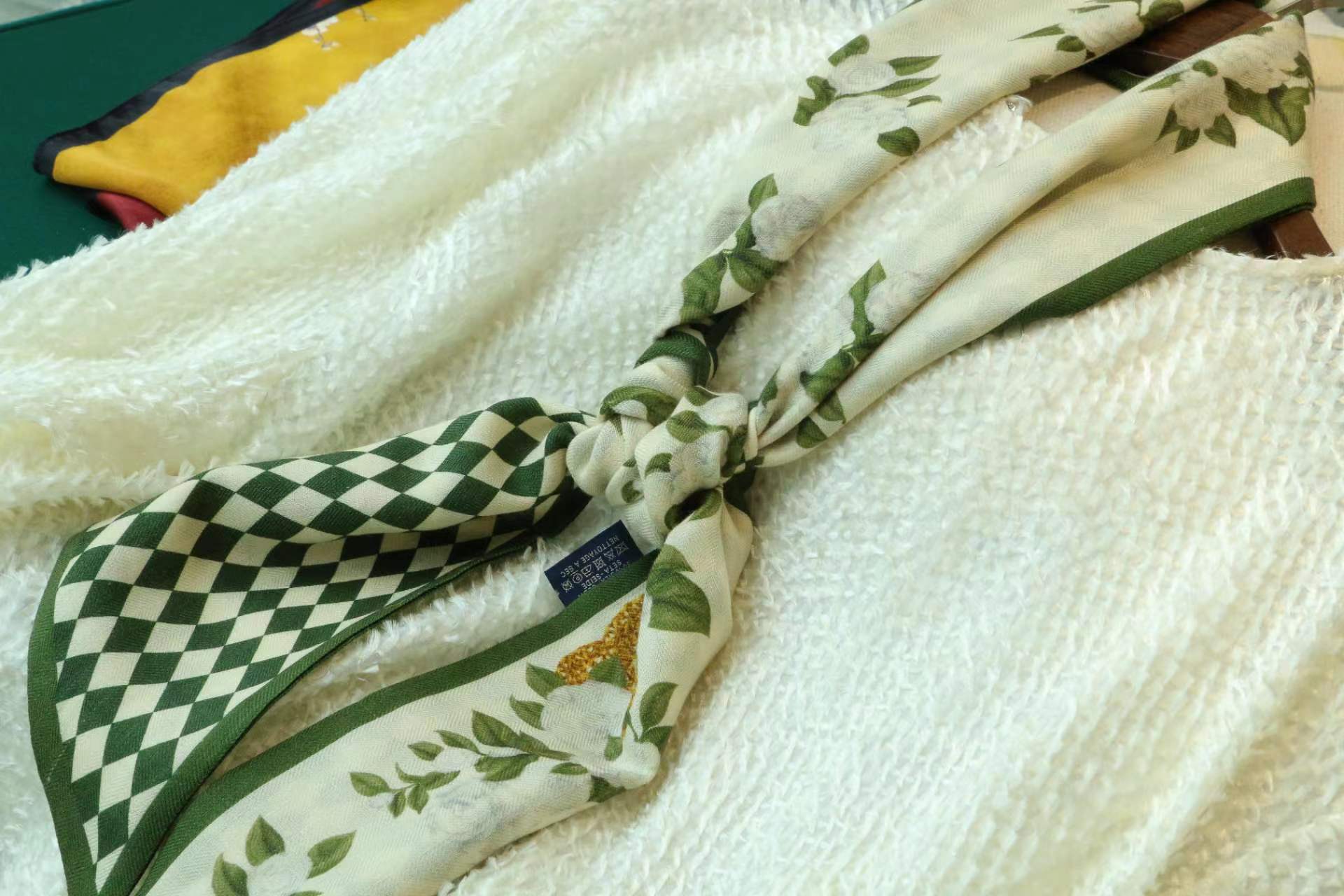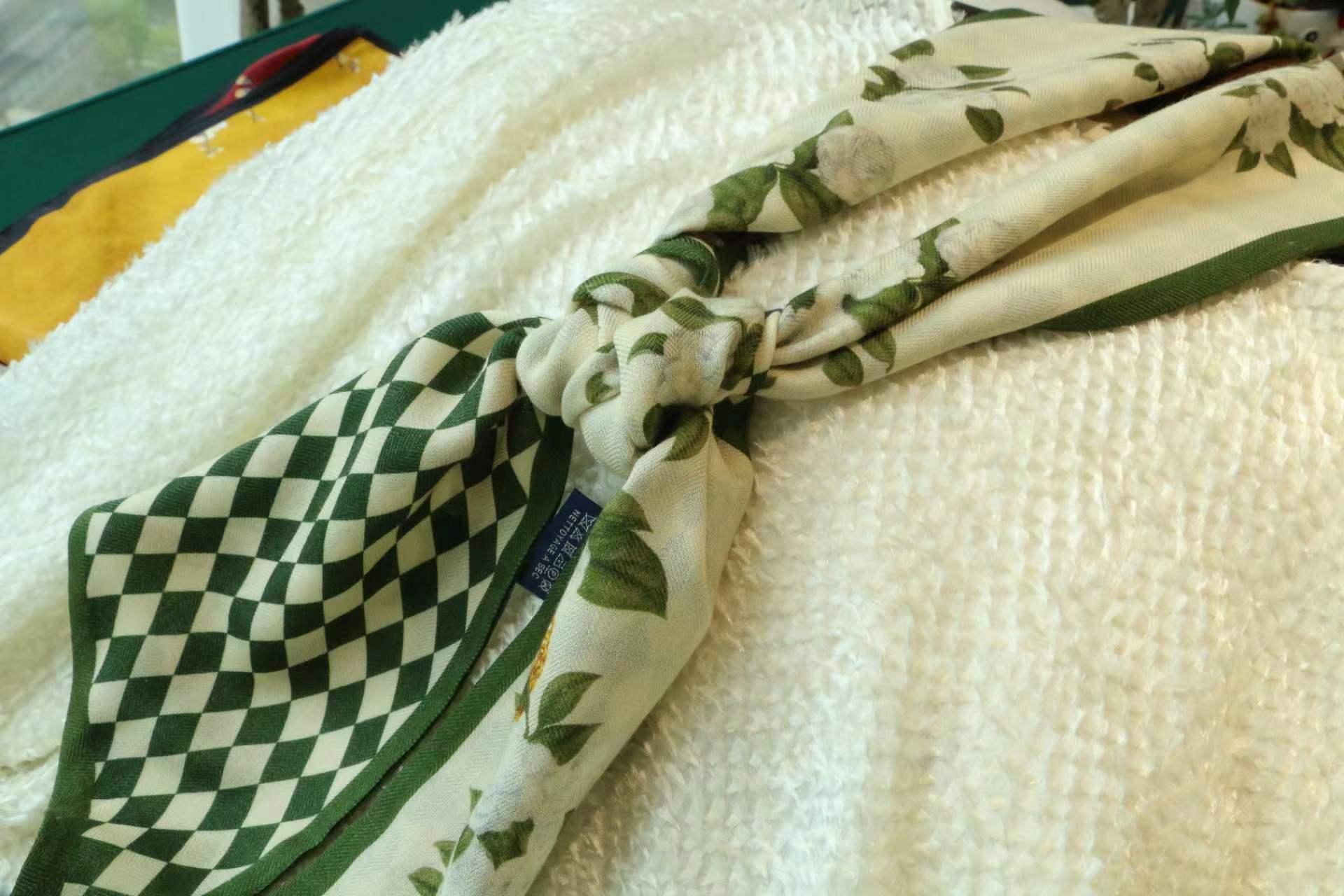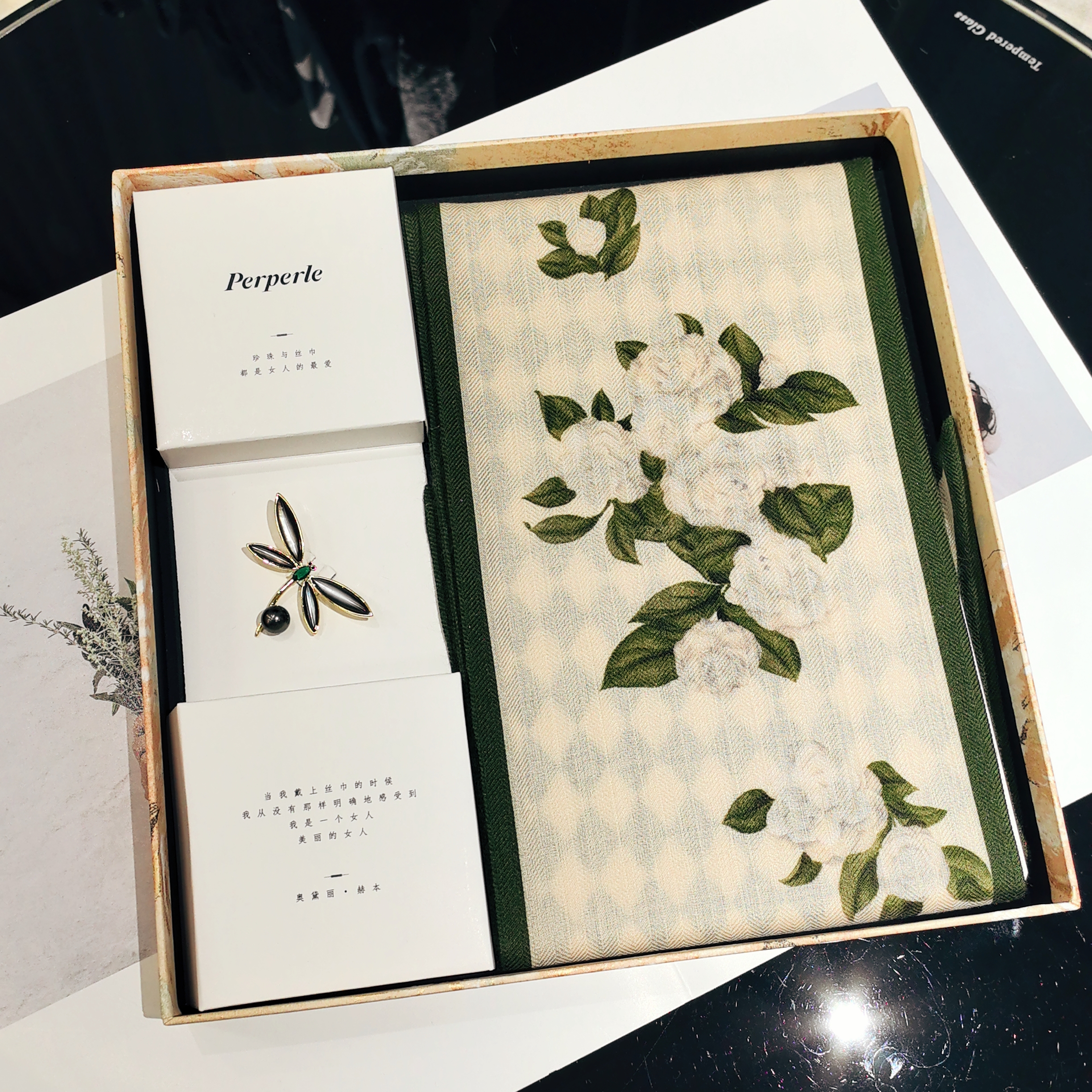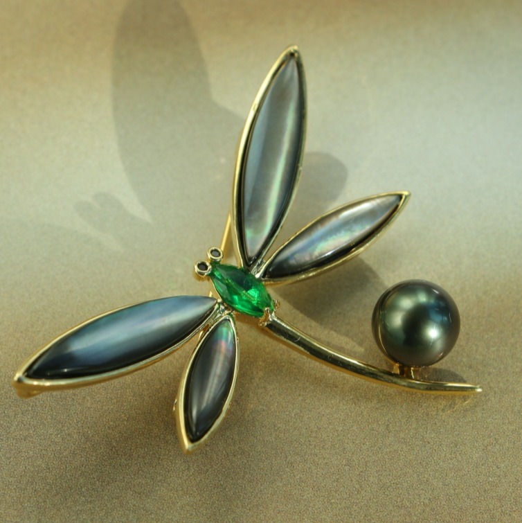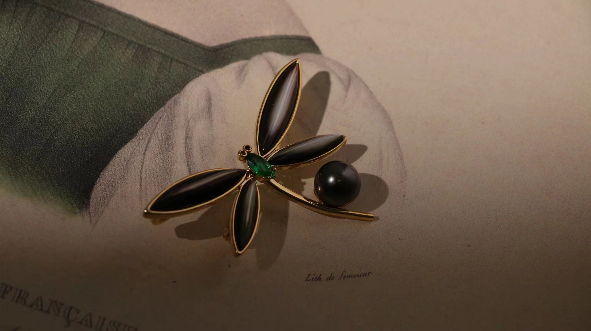 搭配了黑贝大溪地黑珍珠蜻蜓胸花,低调奢华。中间一抹绿宝,很好的呼应了丝巾的绿色。