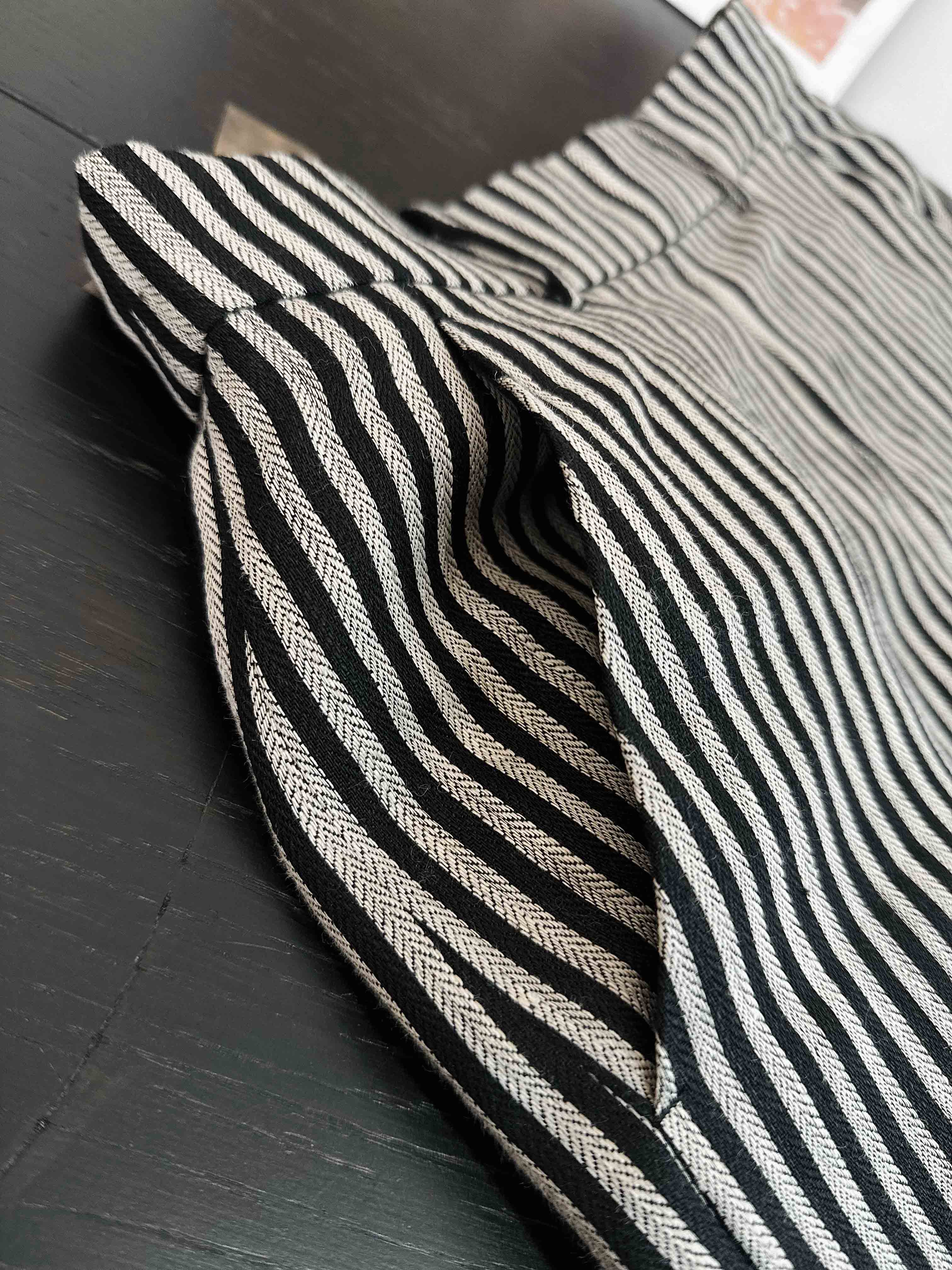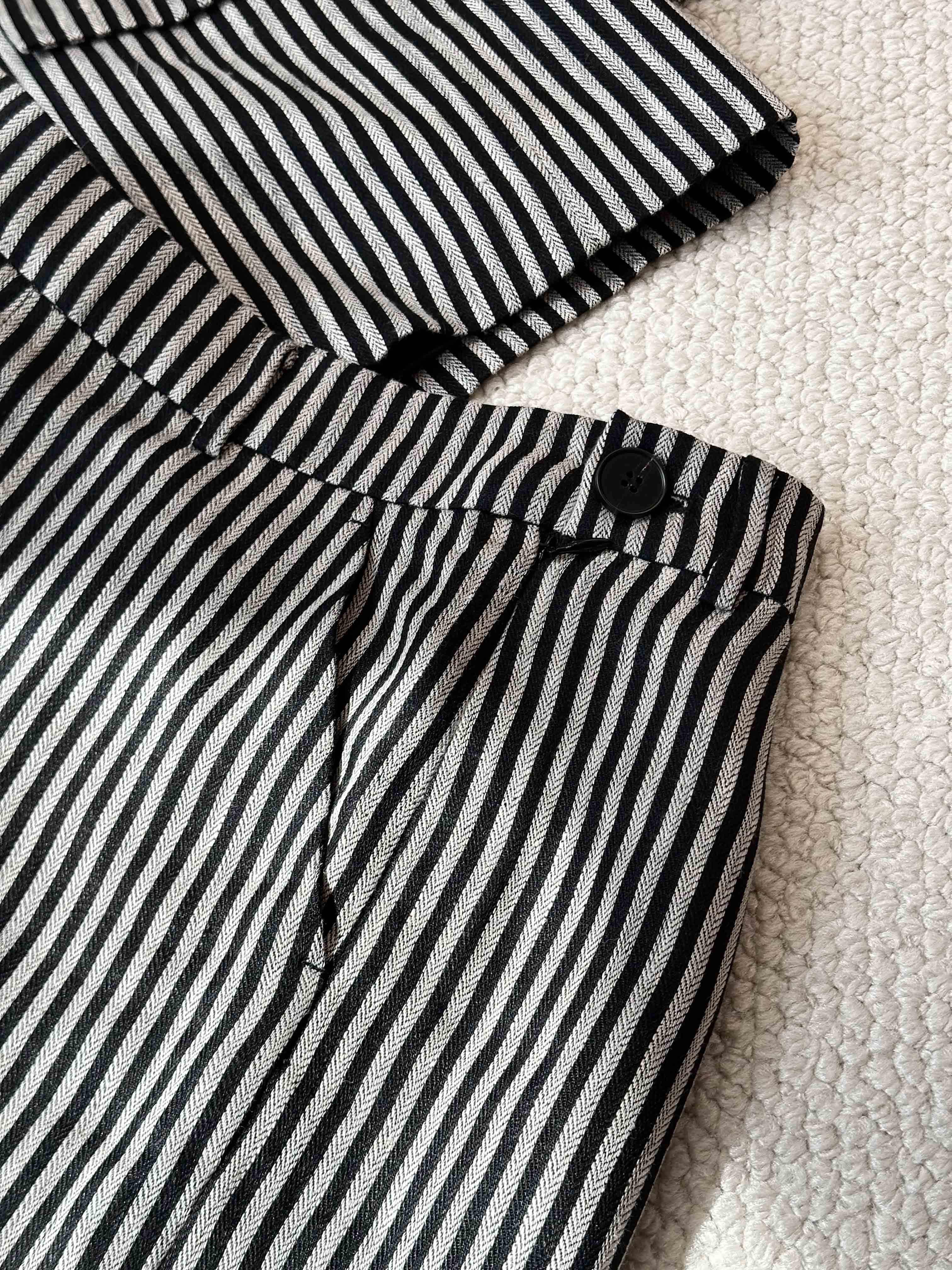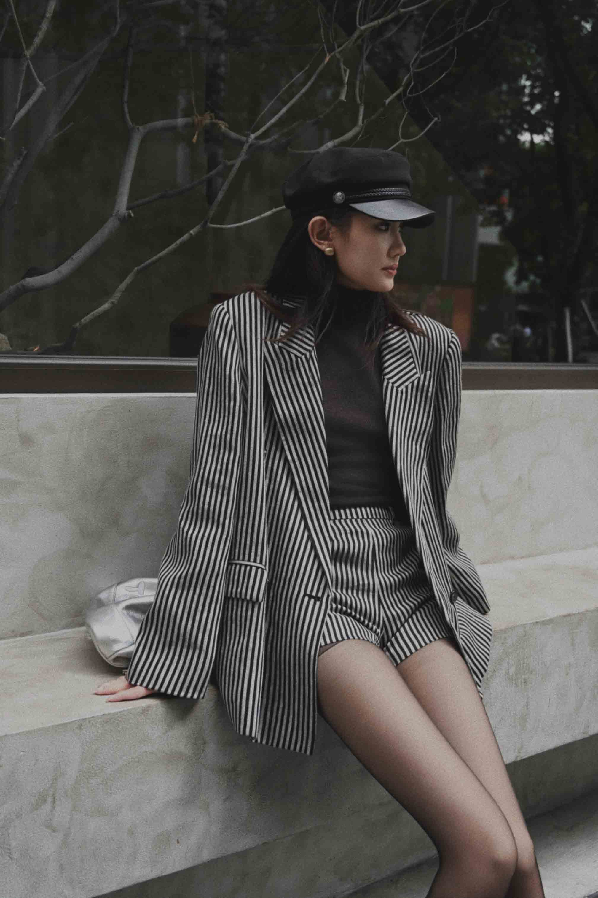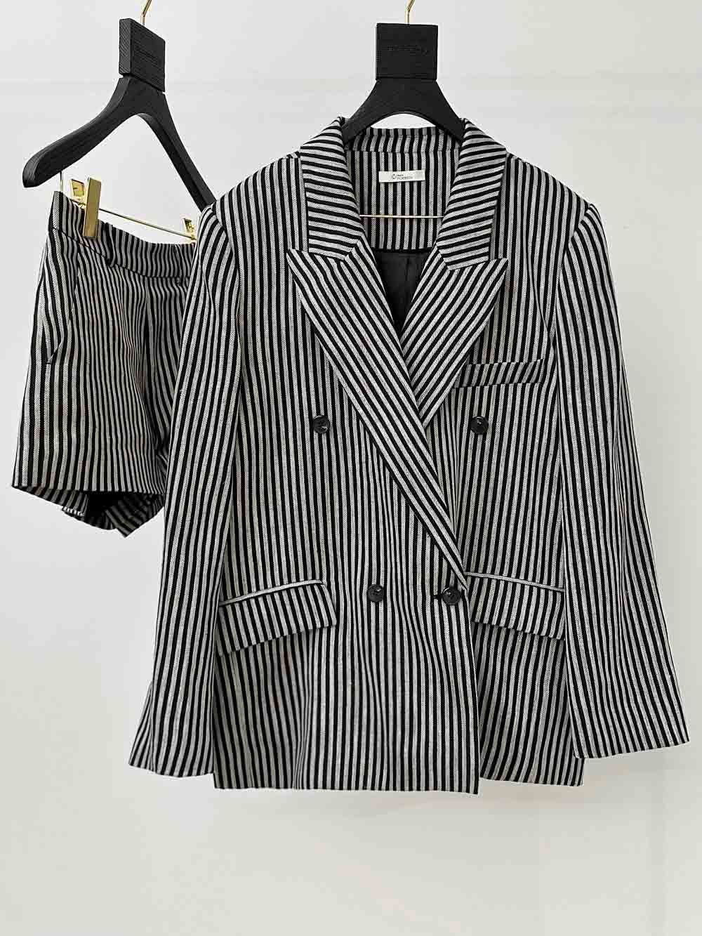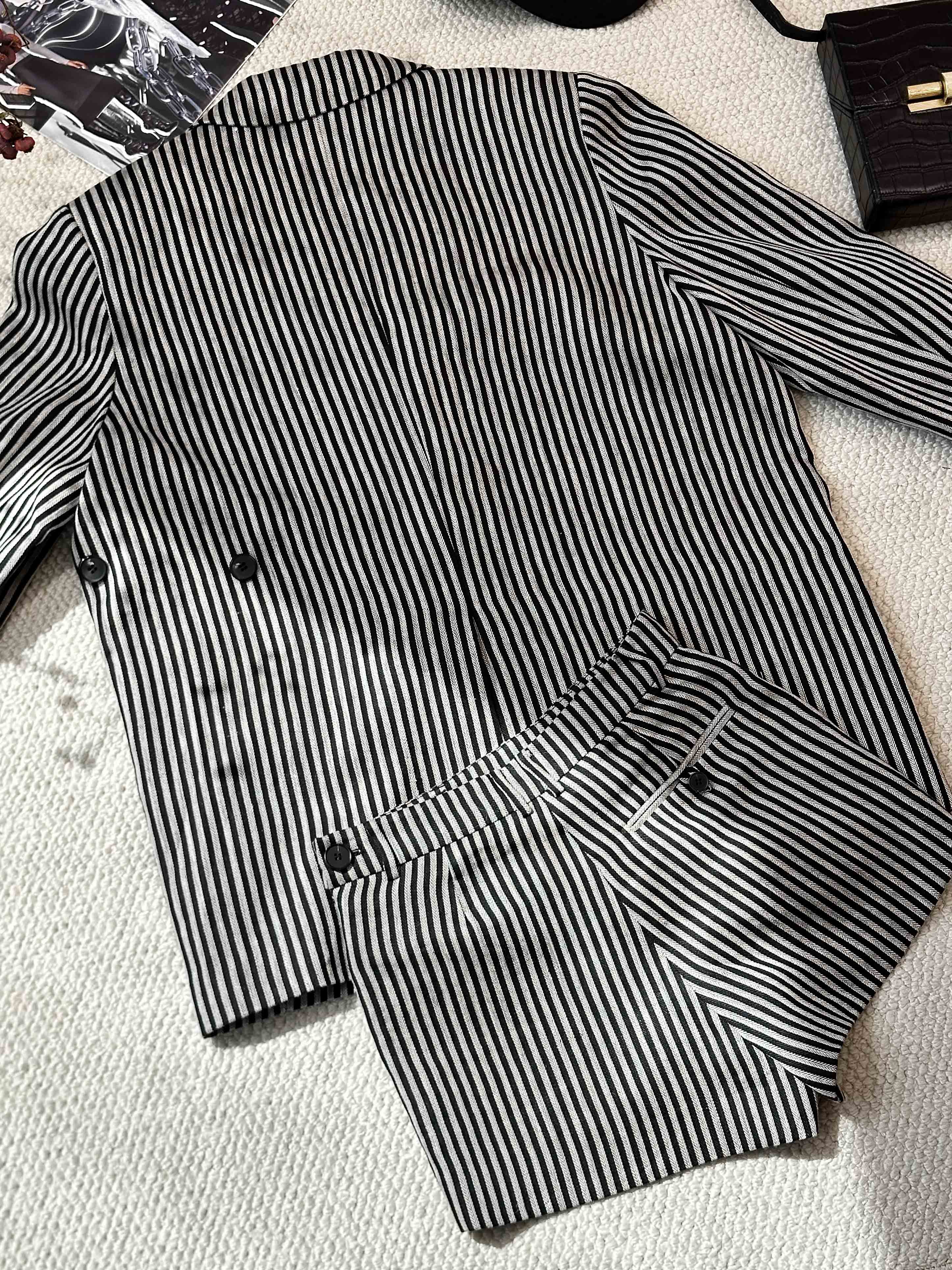 “复古亚麻老钱风 ”黑白条纹廓形西服+亚麻色织条纹时装短裤
