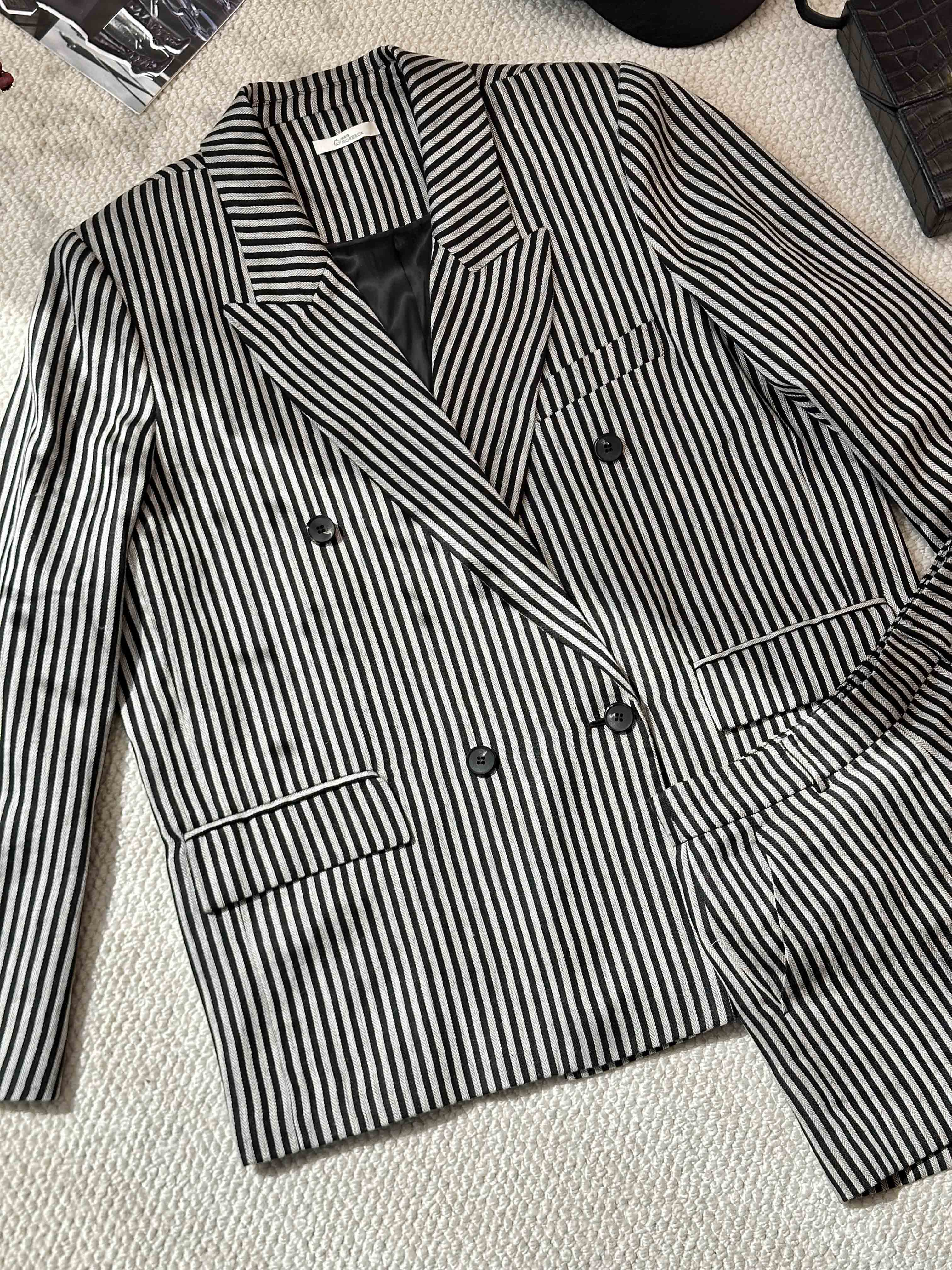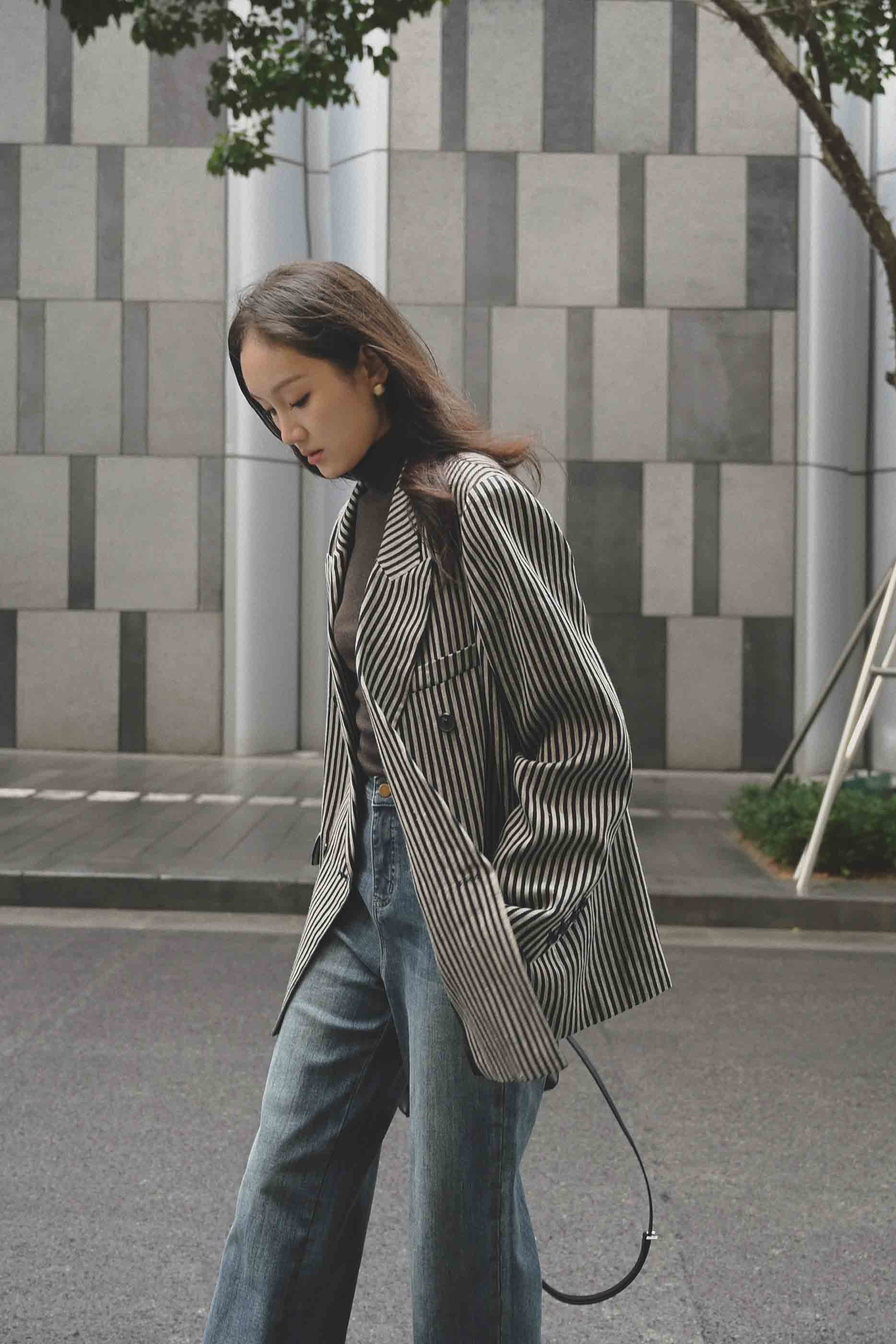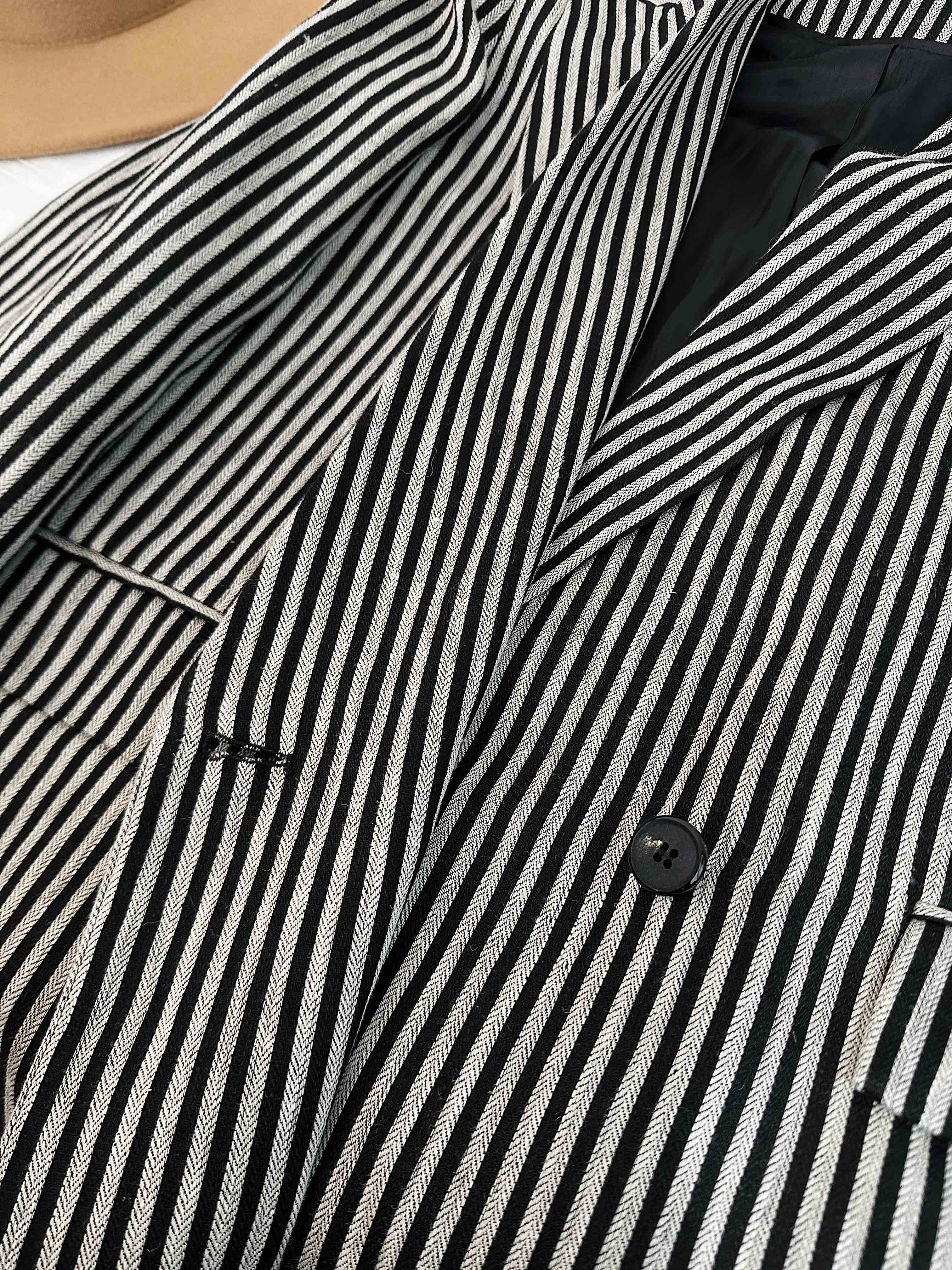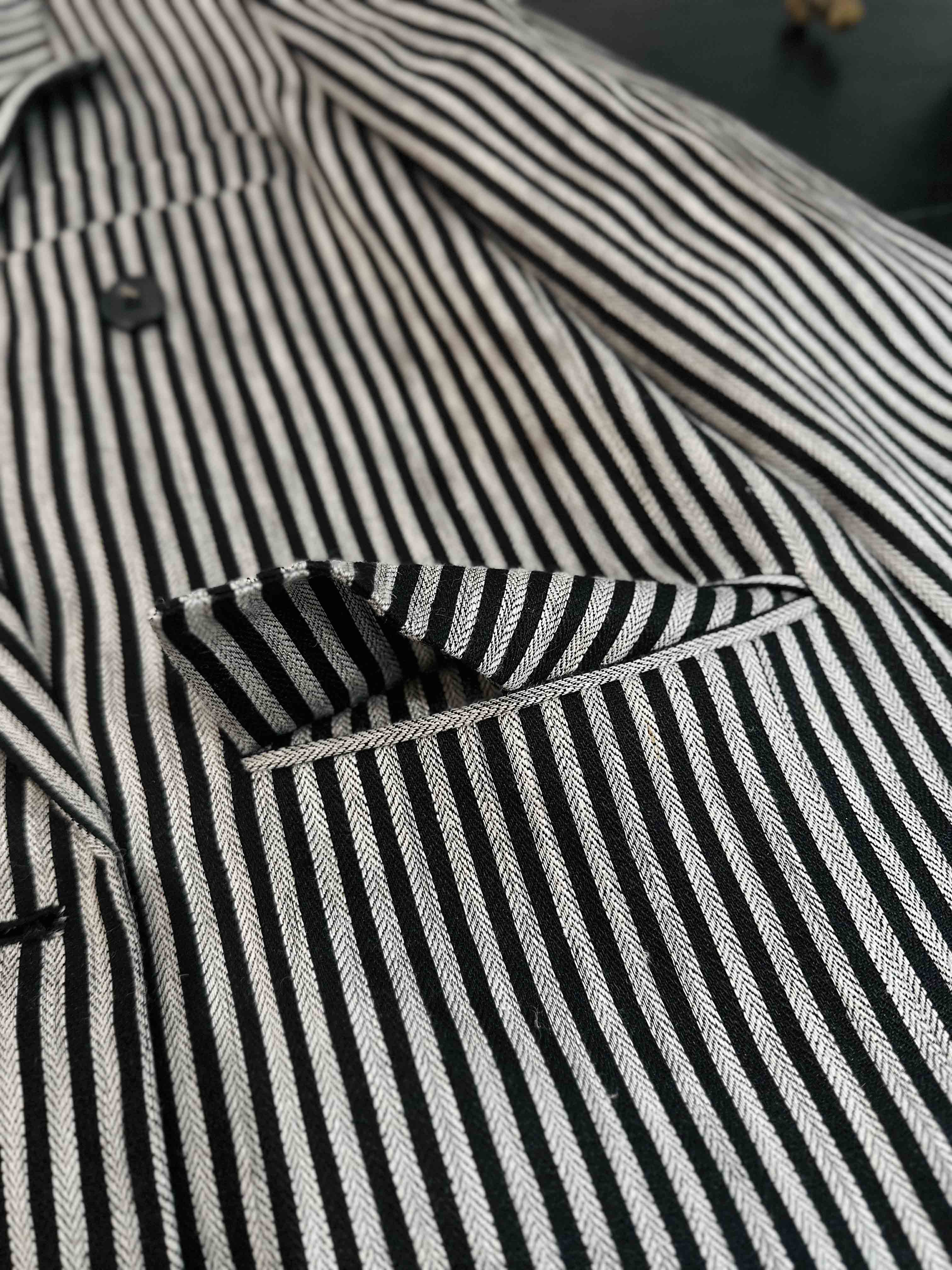 “复古亚麻老钱风 ”黑白条纹廓形西服+亚麻色织条纹时装短裤