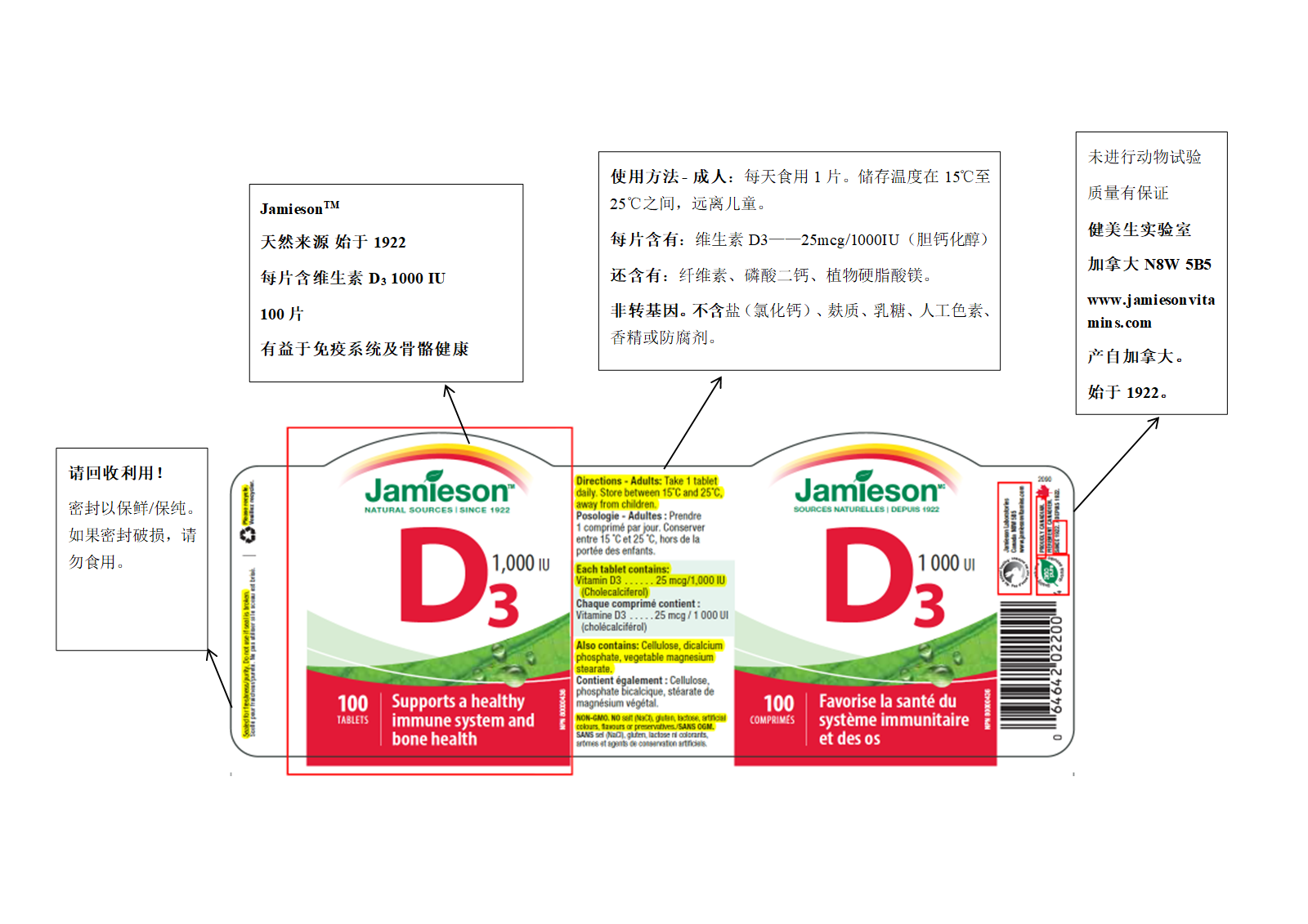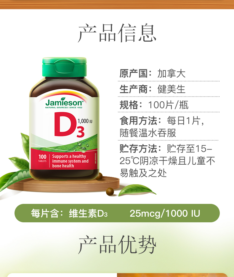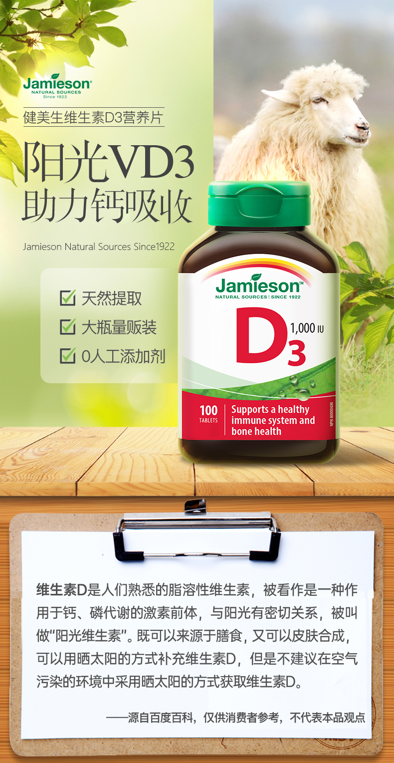 【保税直邮 义乌海关】Jamieson健美生维生素D3营养片100片健美生