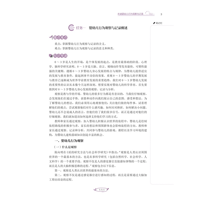 本书比较全面地探讨了对婴幼儿进行行为观察的基本理论与实践案例,全面具体地介绍了观察婴幼儿行为的知识以及记录方法,并提供实践的案例引导学习者结合现状思考和分析问题,培养学习者的观察记录以及分析解释的能力,并根据婴幼儿的发展水平提出适宜的指导方法。本书共分成五个项目,分别是:项目一走进婴幼儿行为观察与记录、项目二婴幼儿能力发展观察与记录、项目三婴幼儿一日生活活动观察与记录、项目四婴幼儿游戏活动观察与记录、项目五婴幼儿社会性发展活动观察与记录。每个项目吸收了当前国内外0-3岁婴幼儿发展的最新理论和研究成果,也收集了大量的家庭、幼儿园、早教中心的实例,具有较强的理论性、实践性和应用性。