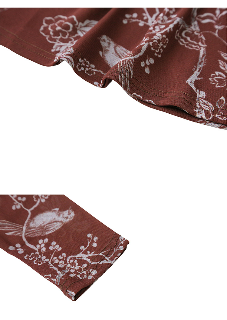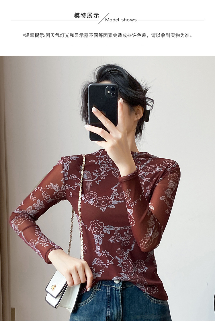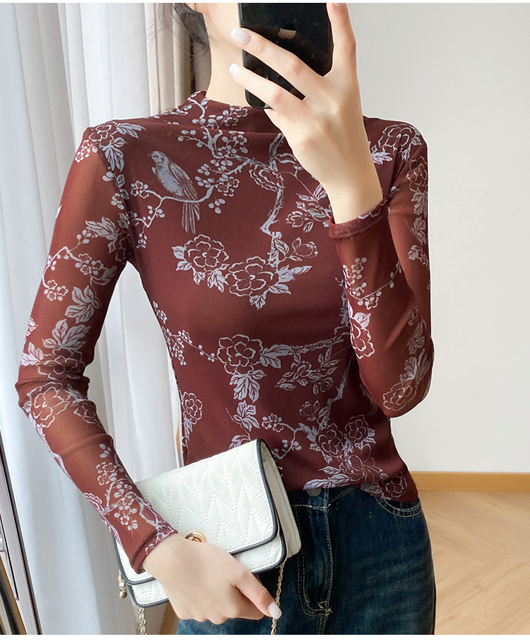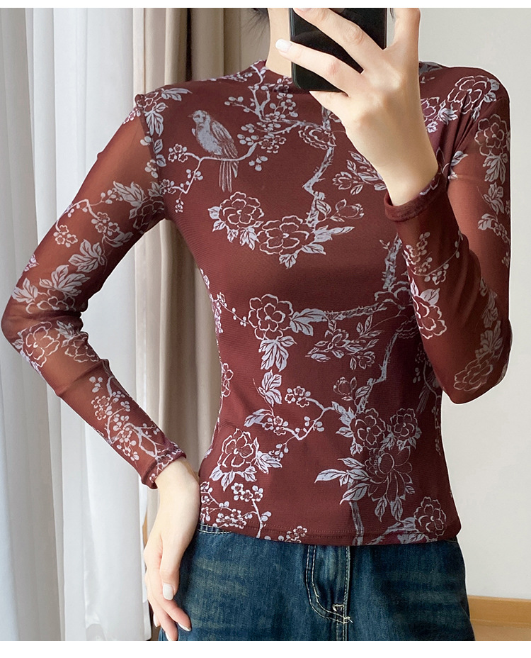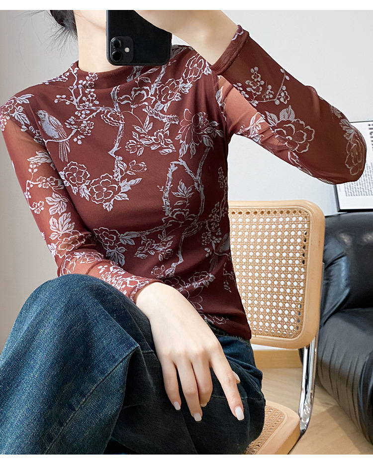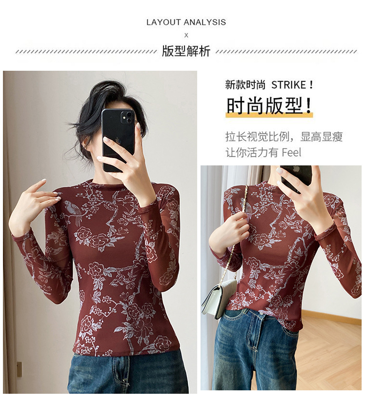 KQL A55F8569时尚洋气高弹网长袖印花T恤上衣