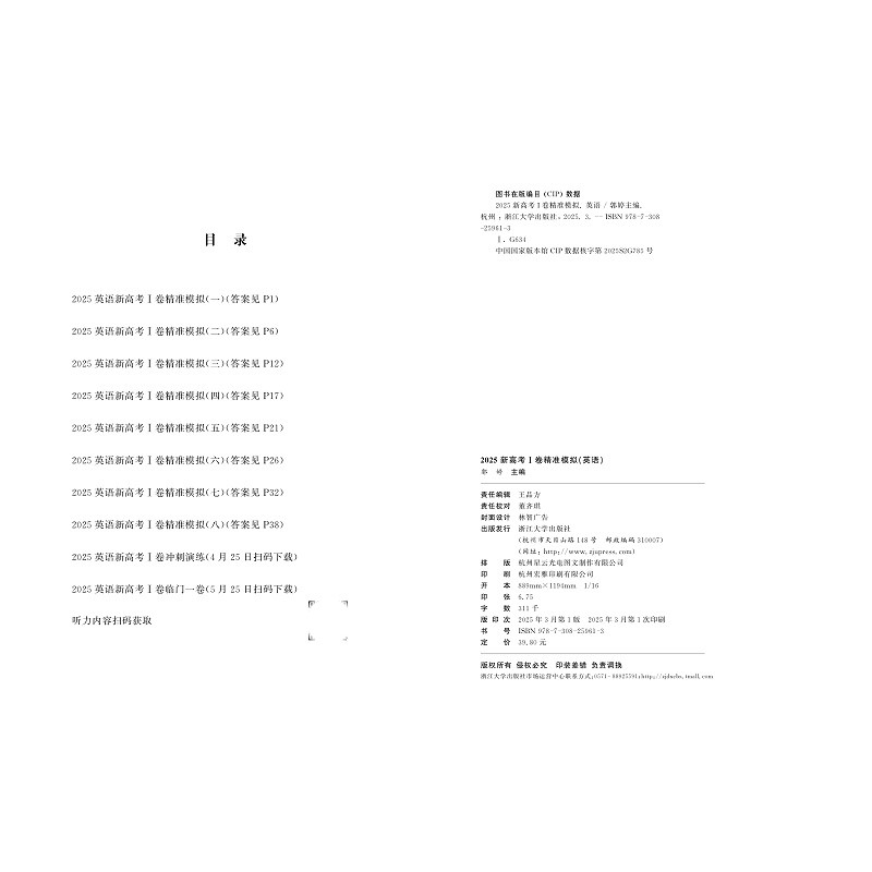 本书稿为英语分册,共811=10套卷,集合浙江省内优秀教师的原创试题为主,力图体现新高考全国卷的评价体系和高考内容改革的最新研究成果。同时,为了更有效地指导考生规范答题,在试卷解答题的答题过程中充分利用作者多年高考阅卷的经验和最新改革评分方案课题研究成果,结合语言表达能力,强化答题的规范性,让读者更明晰分步骤得分的内涵。本套书适用于考前冲刺训练使用,预计于2025年1月上市8套卷,3月赠送冲刺演练卷,5月赠送临门一卷。