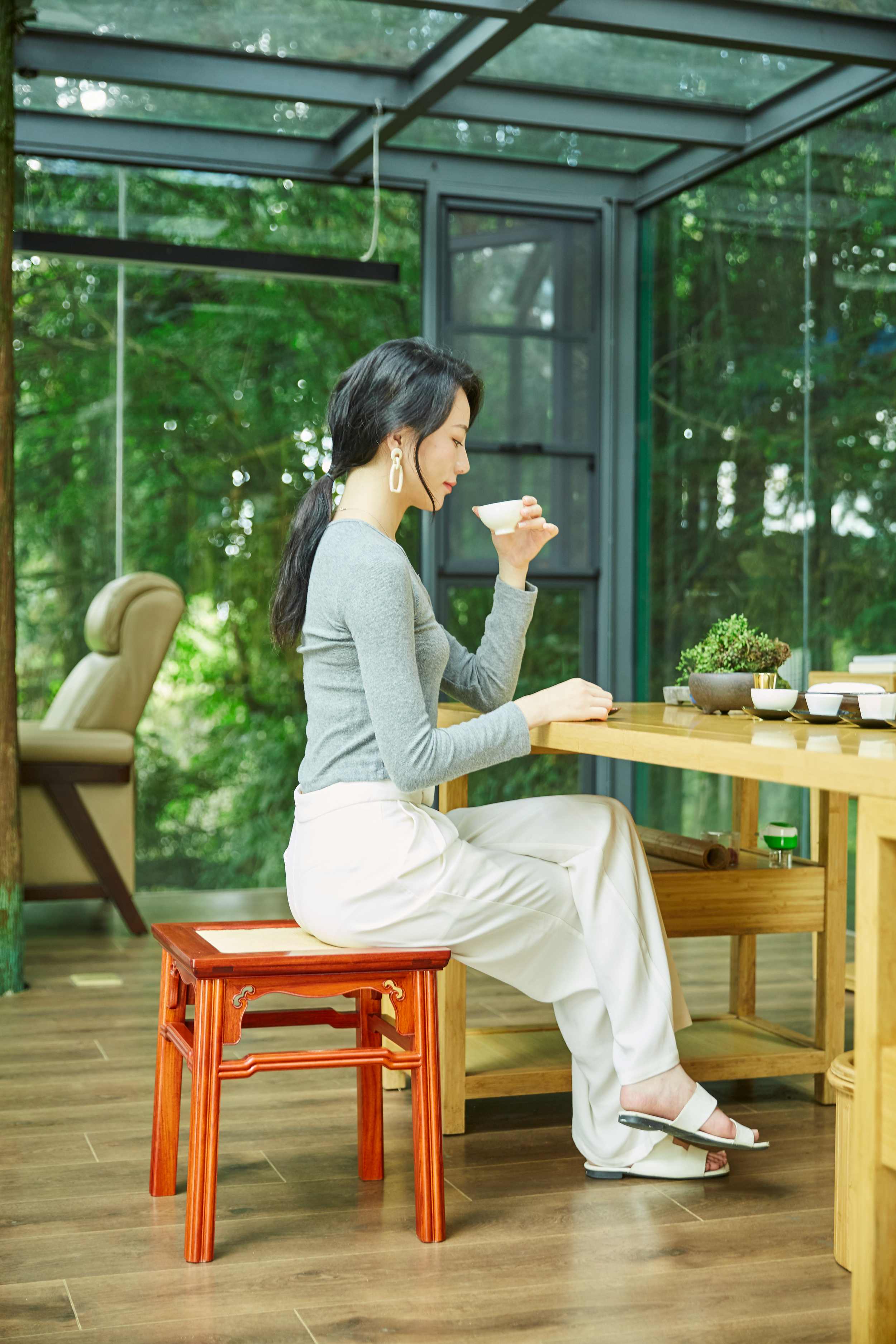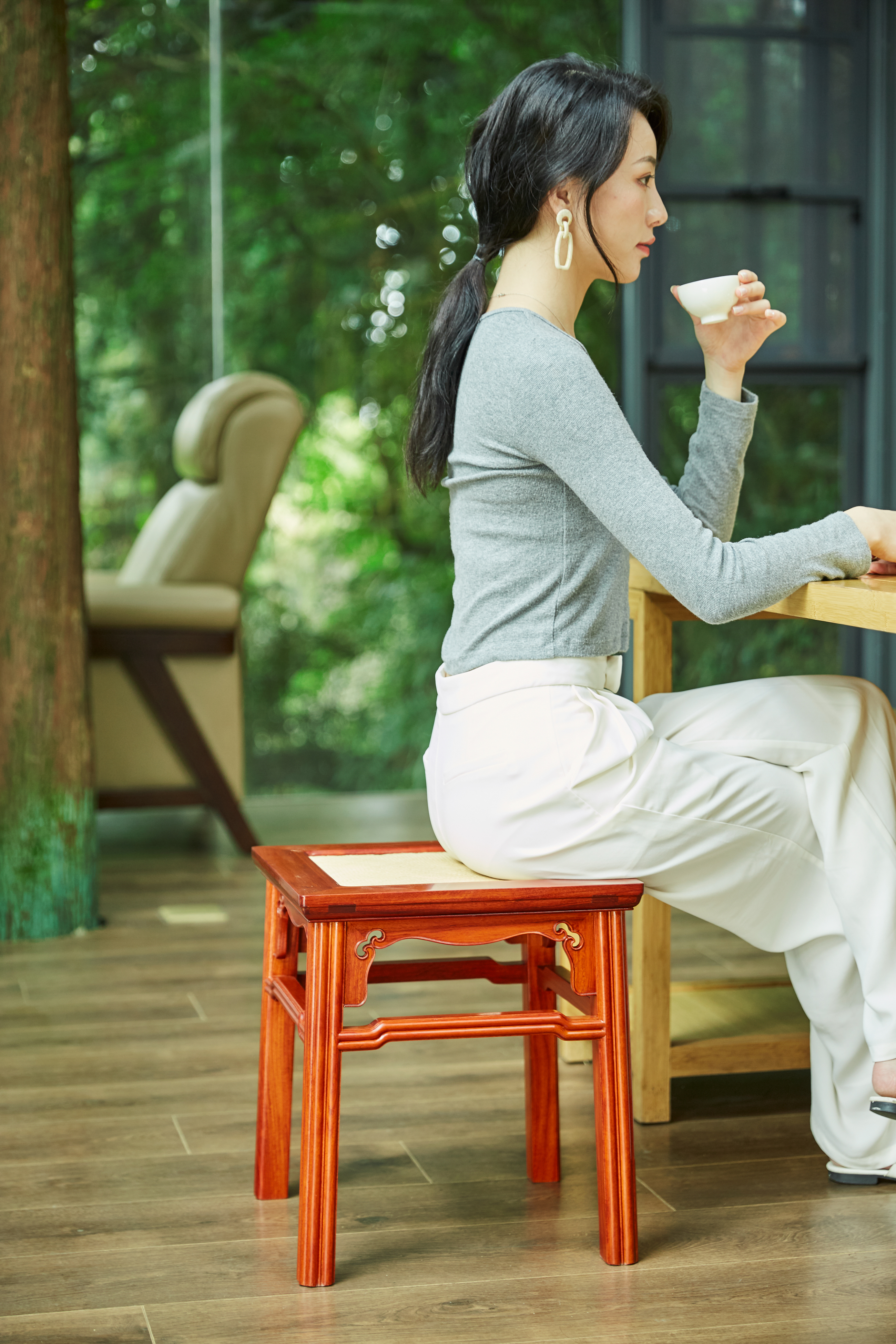 此凳因锼镂和线棱的应用,文秀的格调中显出犀利流畅的意趣,可搭配一般的茶桌,休闲桌或置于庭院之中闲坐,对弈,别有一番生活韵味。