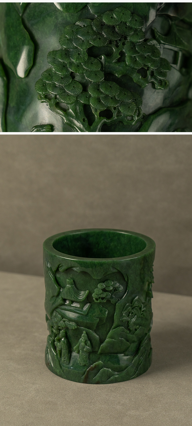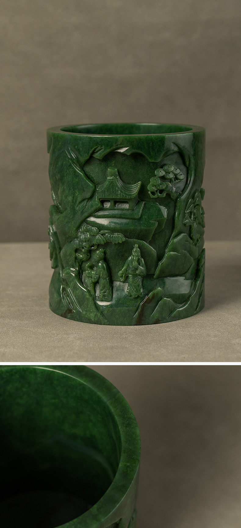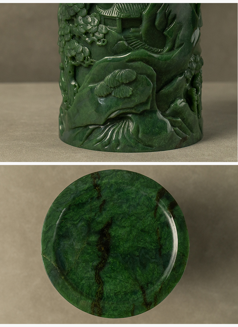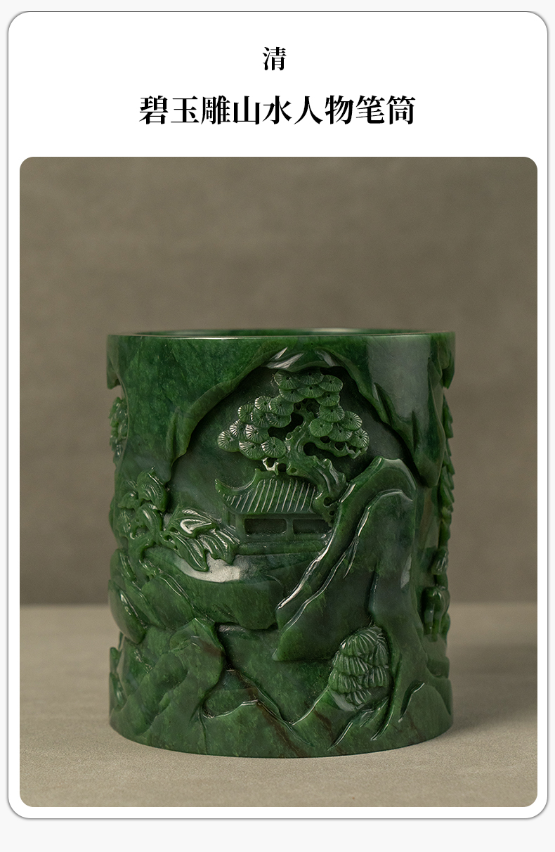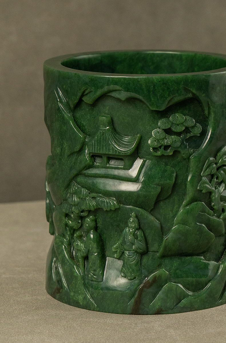 清 碧玉雕山水人物笔筒