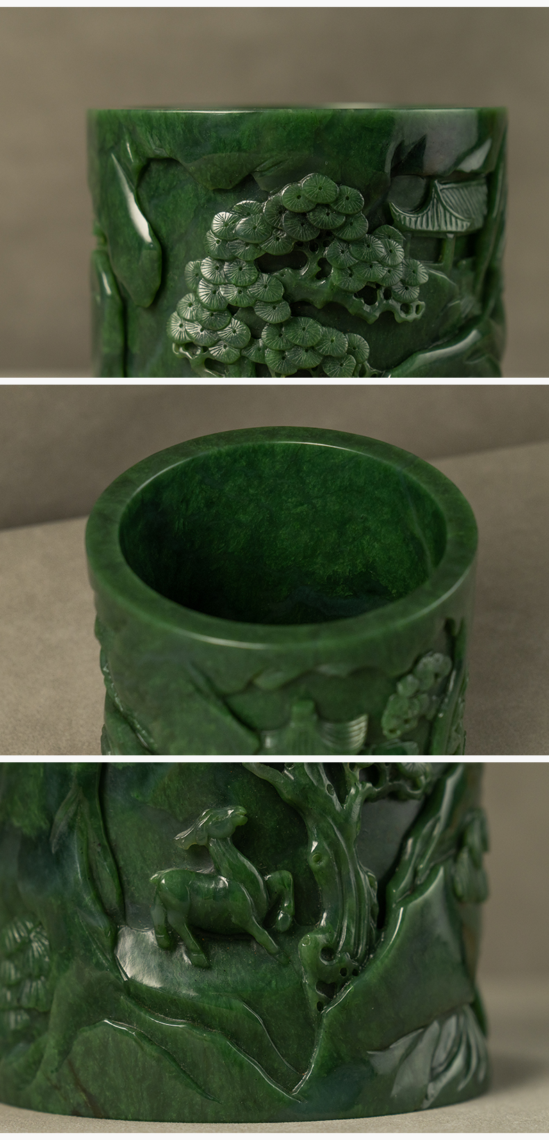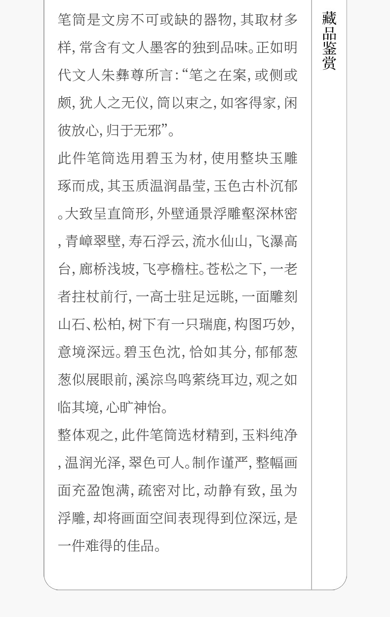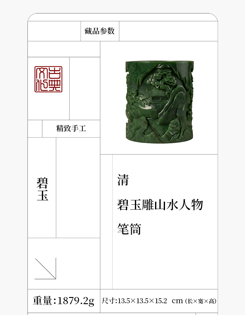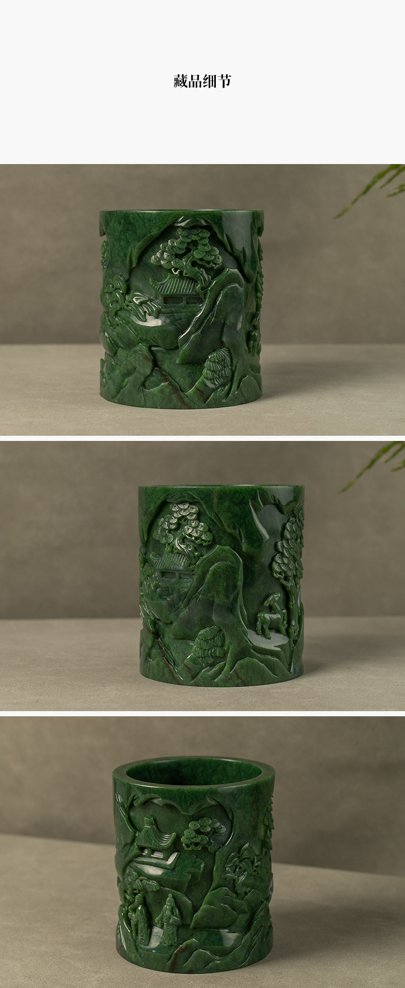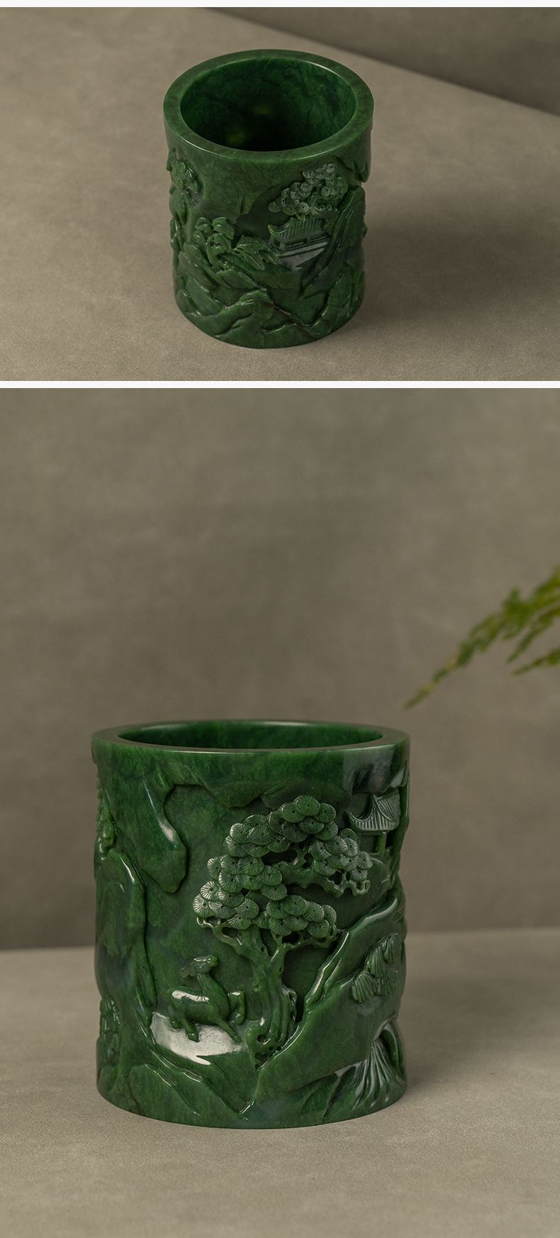 清 碧玉雕山水人物笔筒