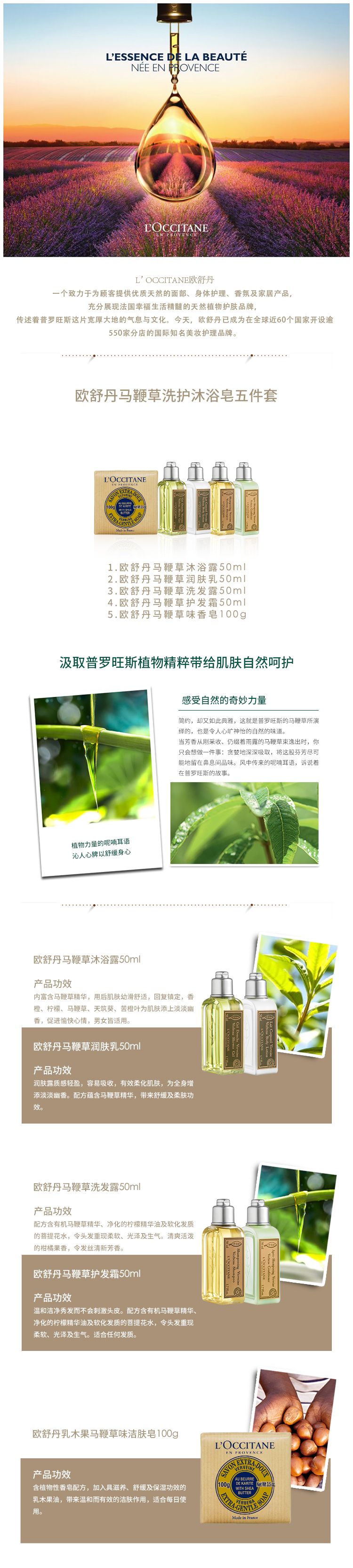 欧舒丹 马鞭草五件套 洗护沐润50ML*4+香皂100G