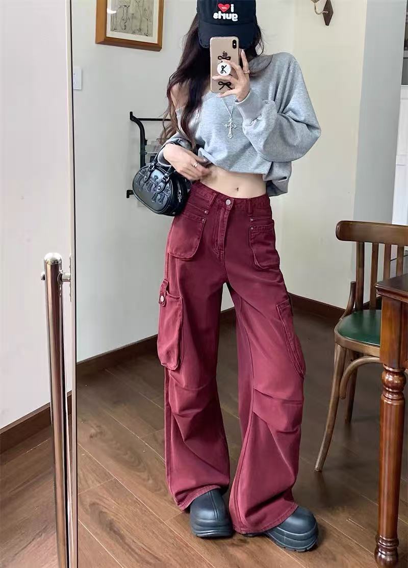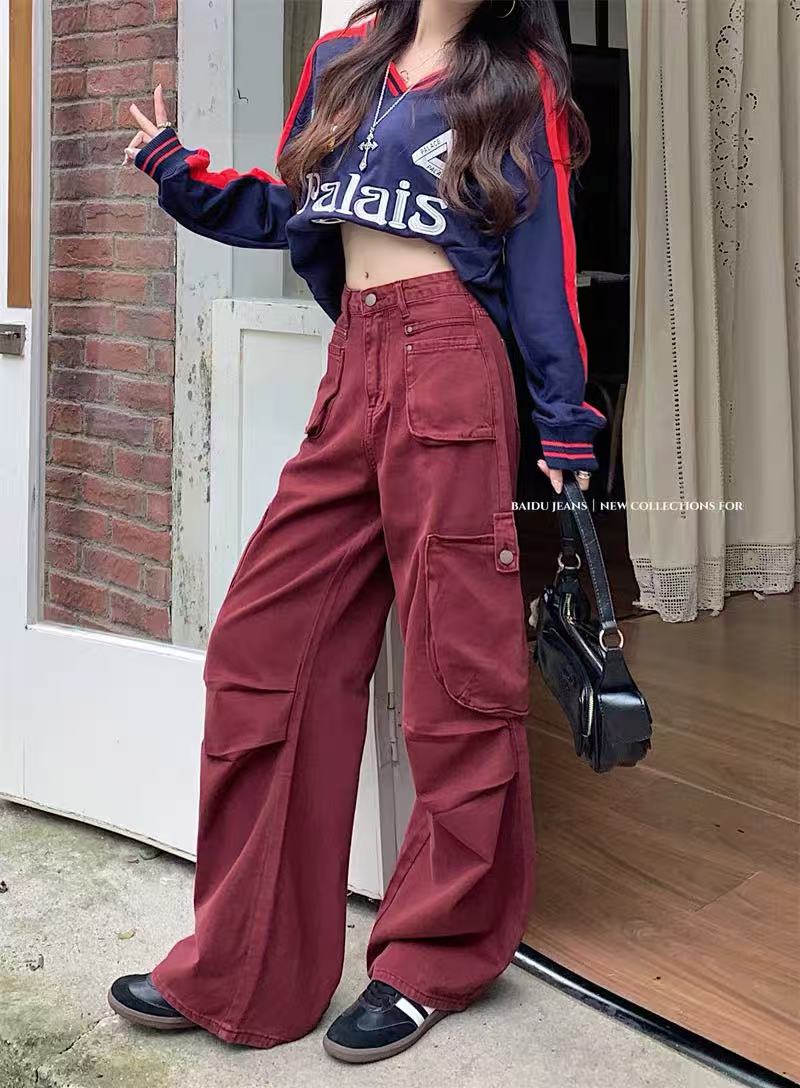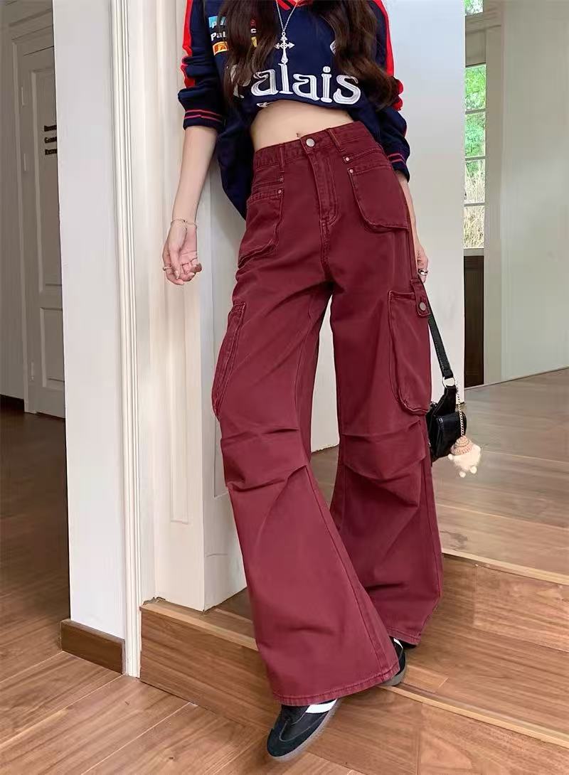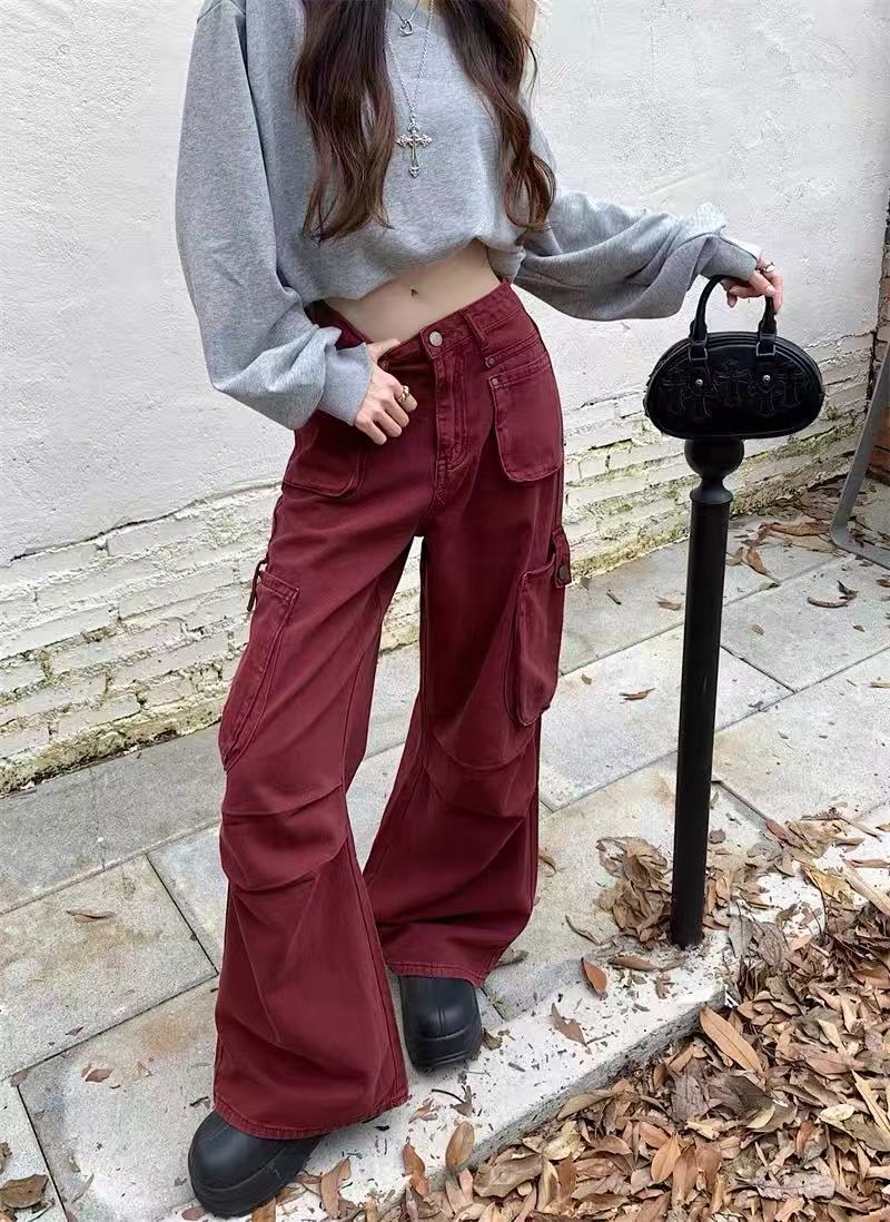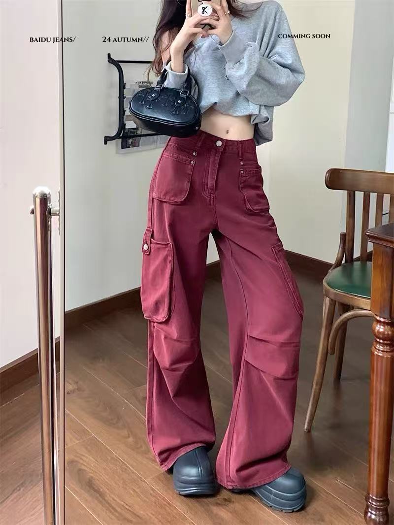 418良粉节|2026 活动爆款 品牌特卖!错过无【自营】衣周期~思美乐牛仔179波尔多红100%棉 多复古工装裤春秋新款穿搭美式阔腿牛仔裤长裤女-喜出