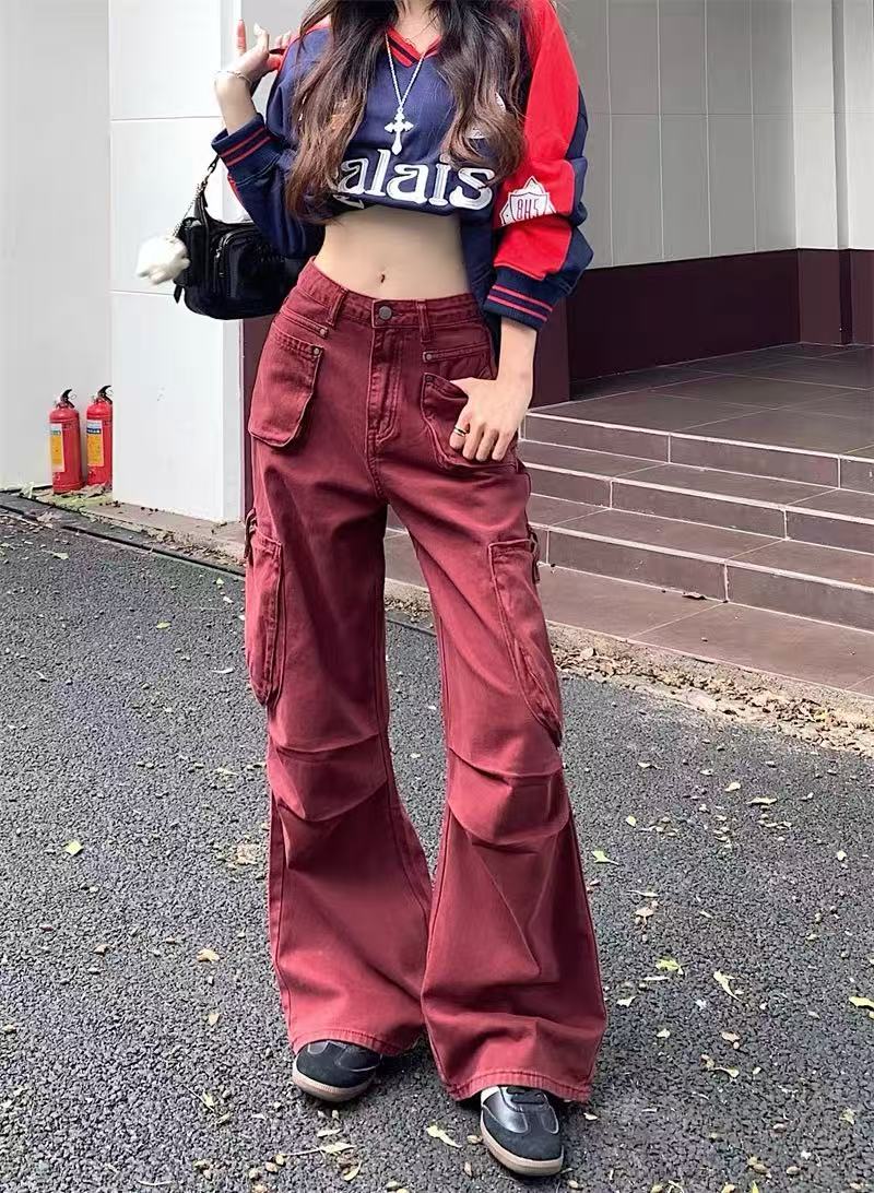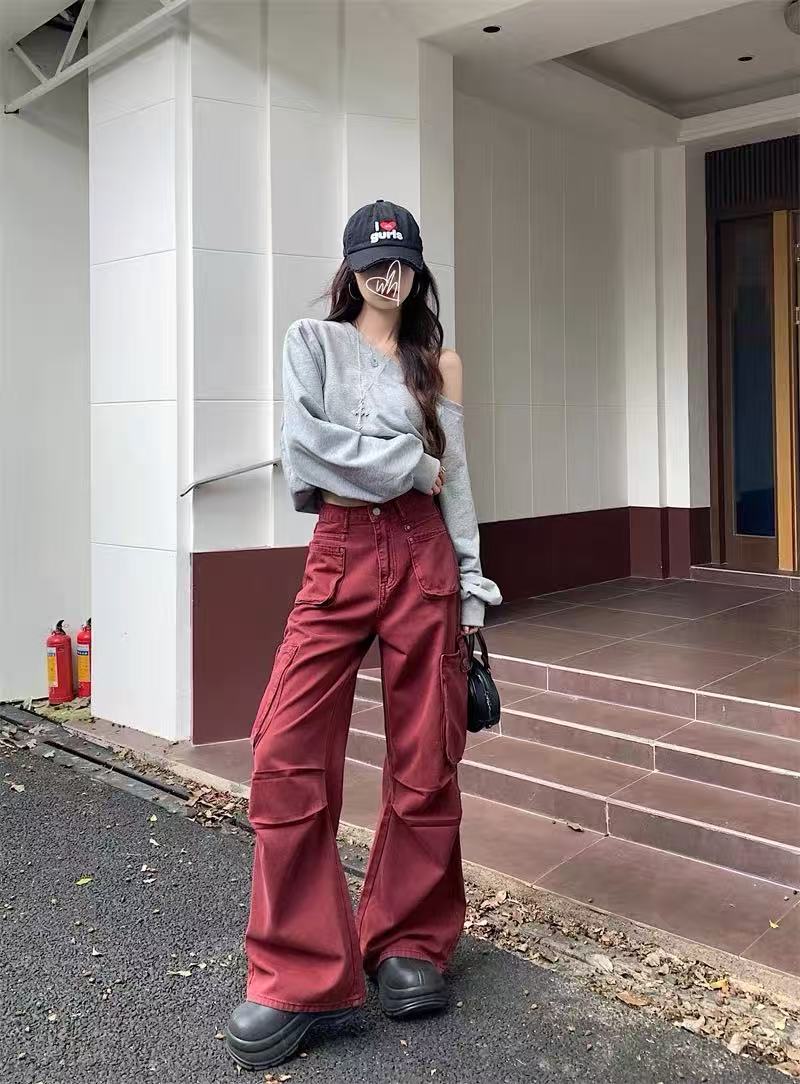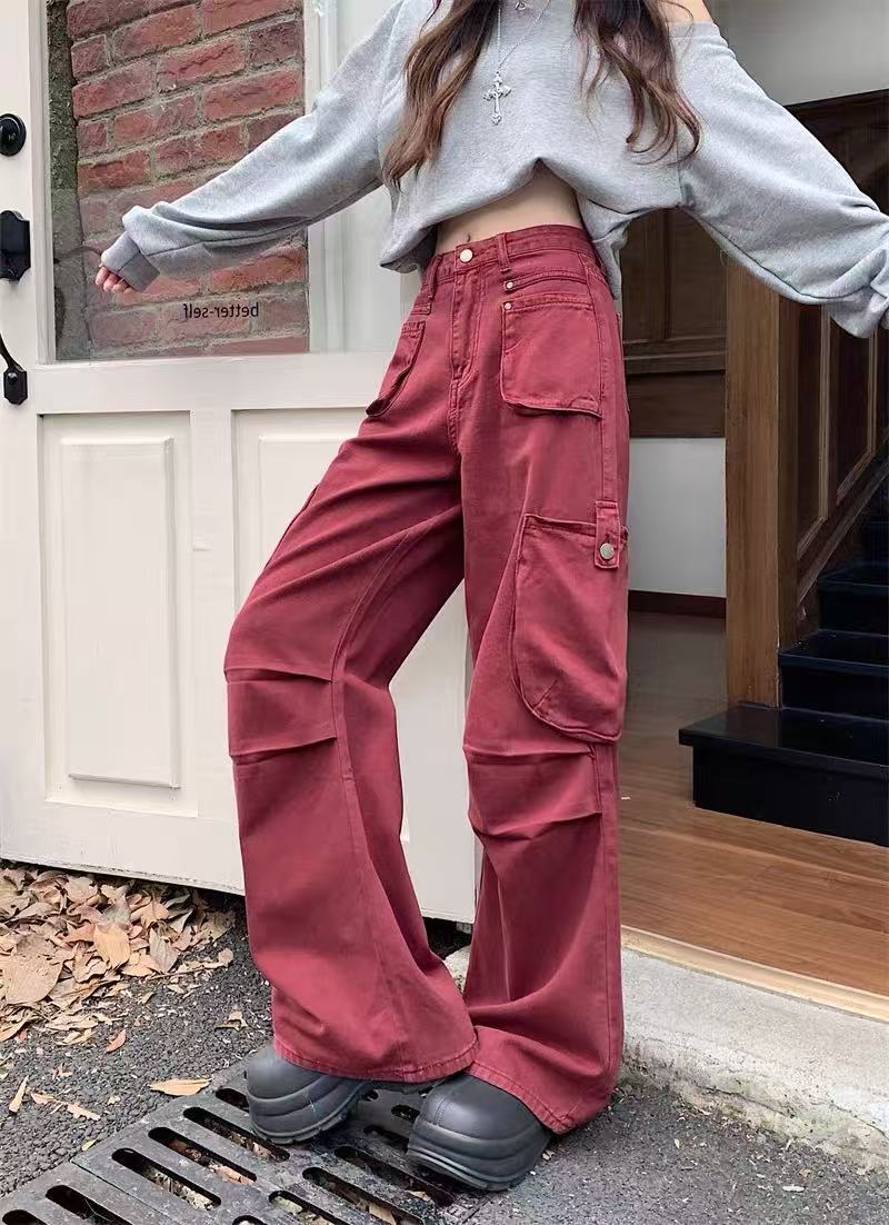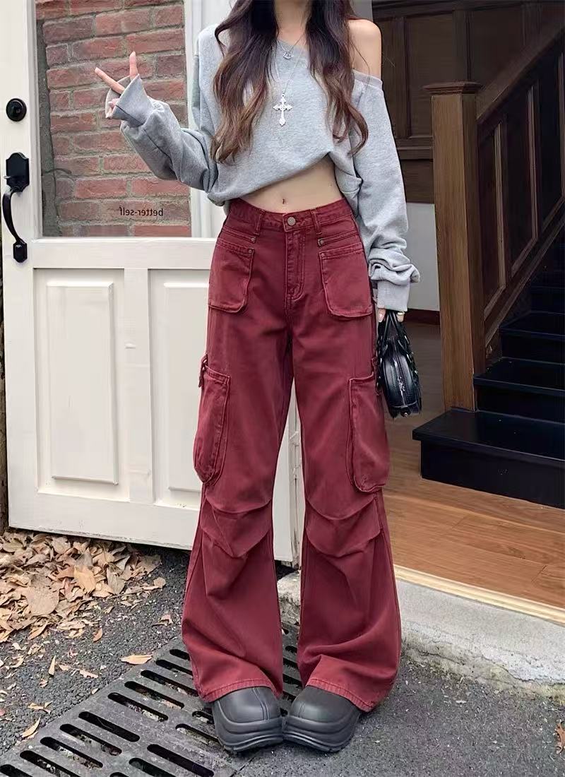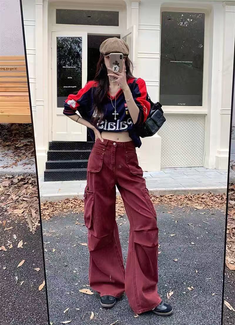 418良粉节|2026 活动爆款 品牌特卖!错过无【自营】衣周期~思美乐牛仔179波尔多红100%棉 多复古工装裤春秋新款穿搭美式阔腿牛仔裤长裤女-喜出