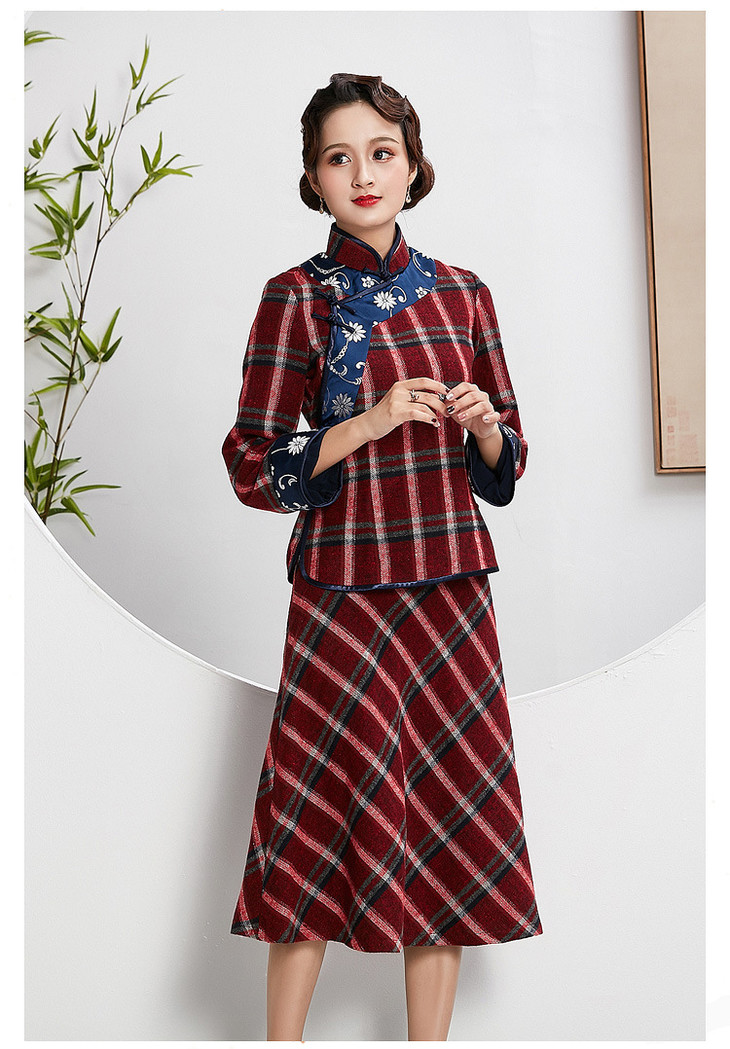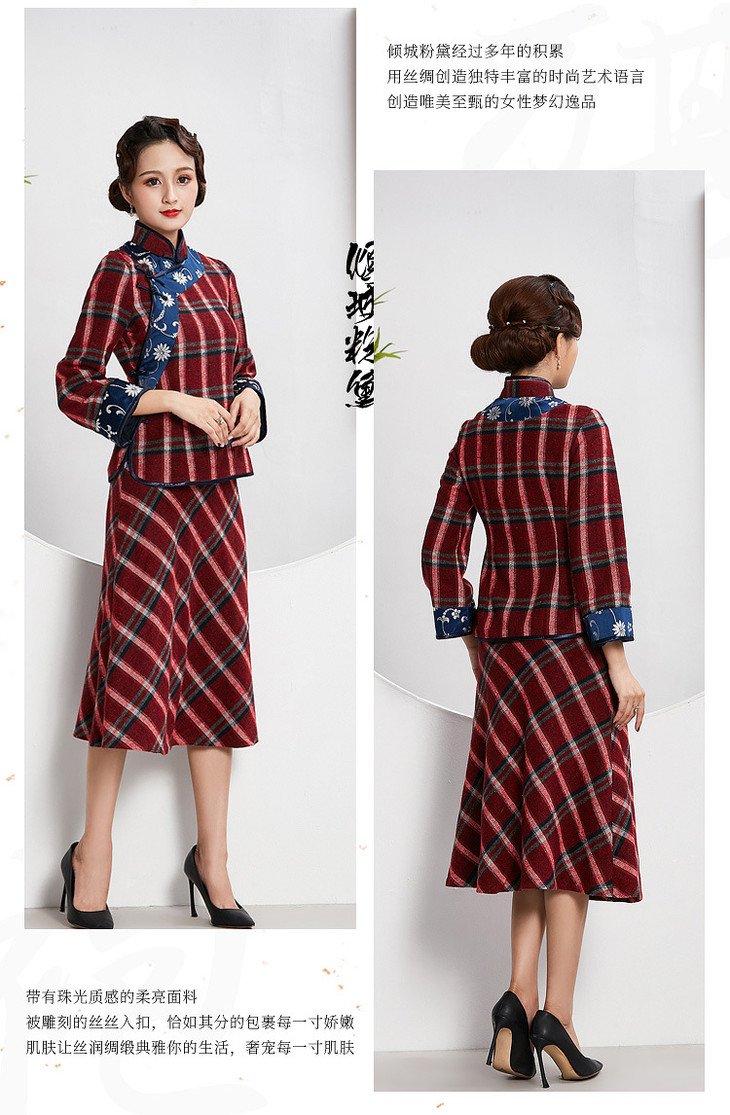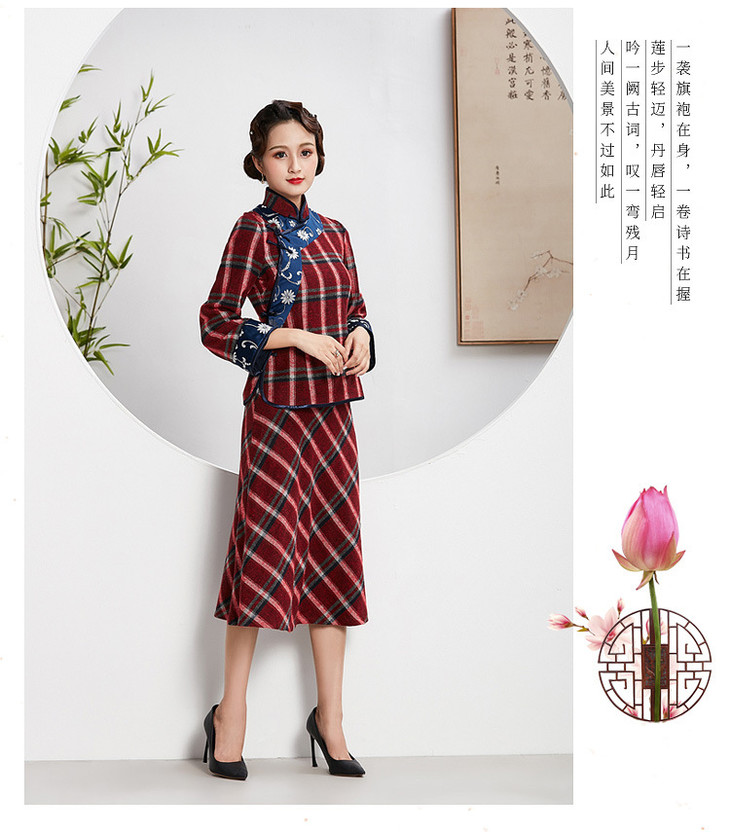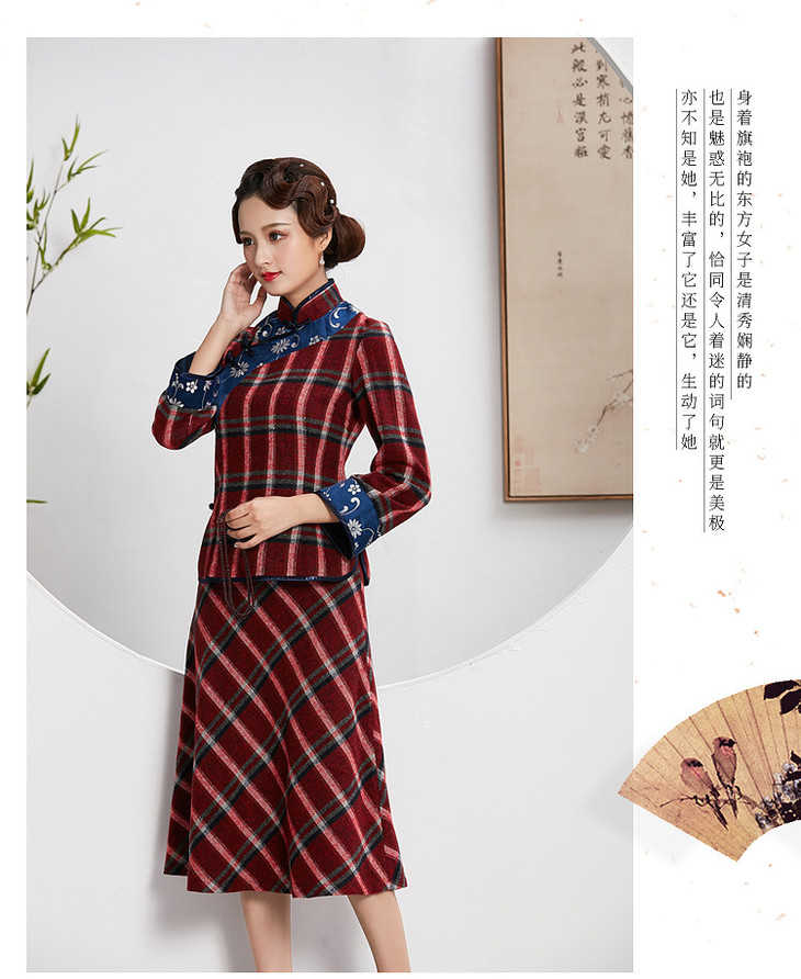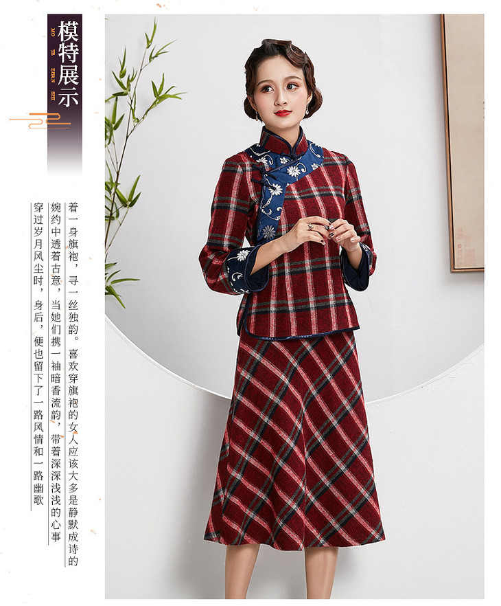 QC1697584 毛呢两件套边手工盘扣长袖旗袍裙礼服2021秋冬新款