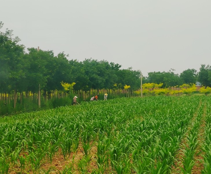 播种后陆续长出的一棵棵青翠欲滴的玉米秆,一眼望过去,生气勃勃,喜人得很。低矮出的绿色是各种杂草,需要人工用锄头慢慢锄掉,锄下来的杂草原地覆盖,经过太阳暴晒后,回归土壤,又是非常好的绿肥。