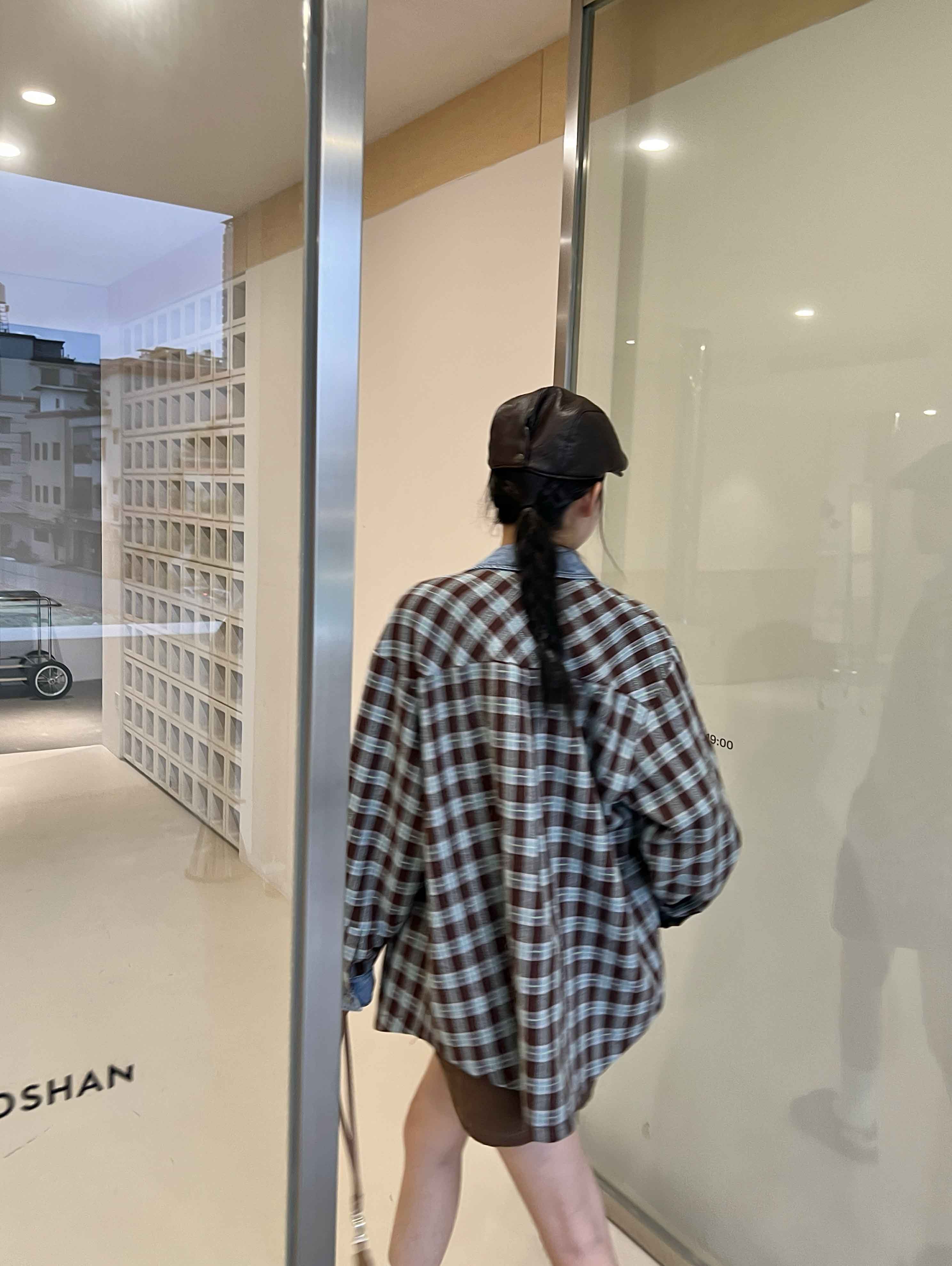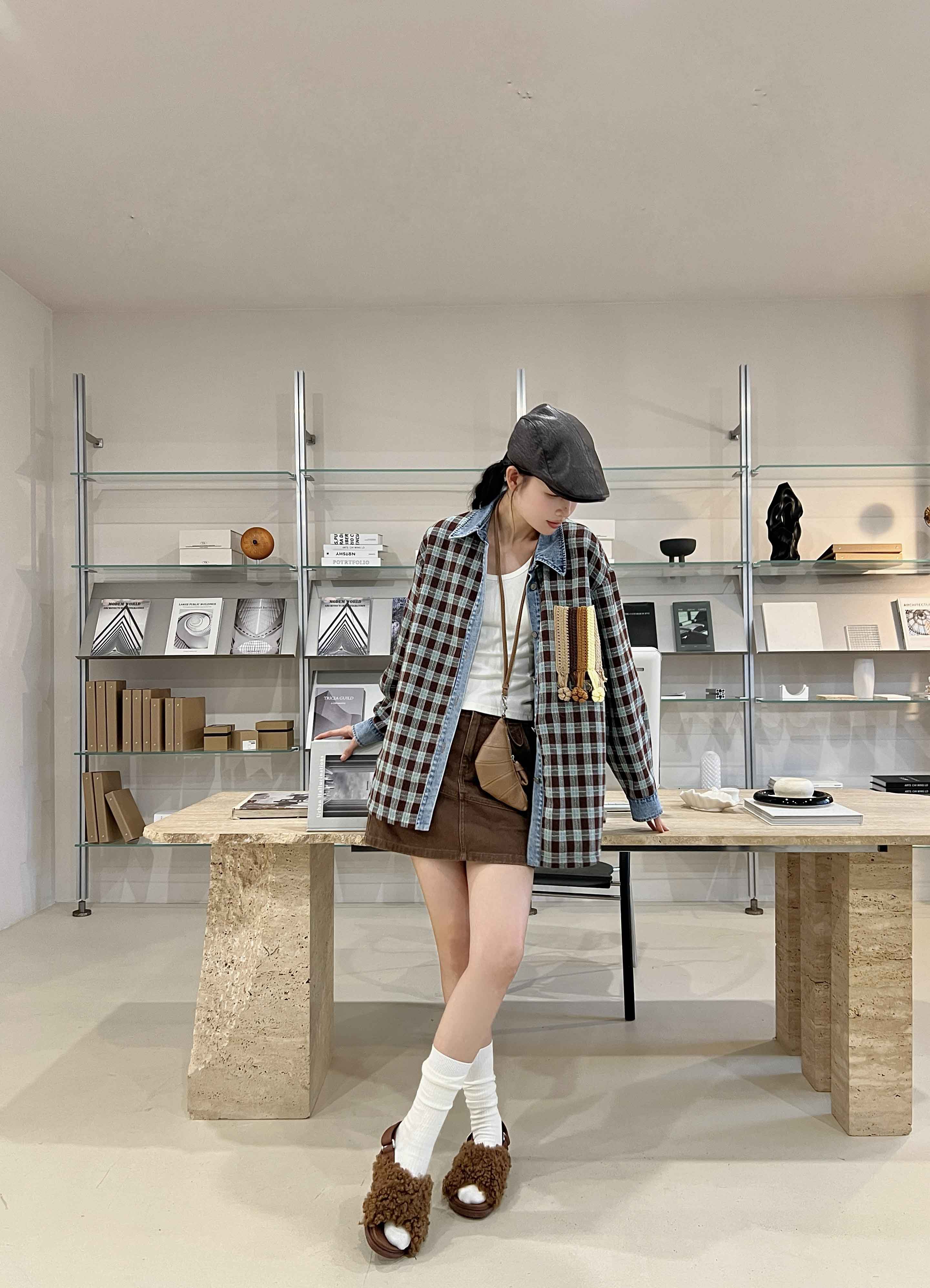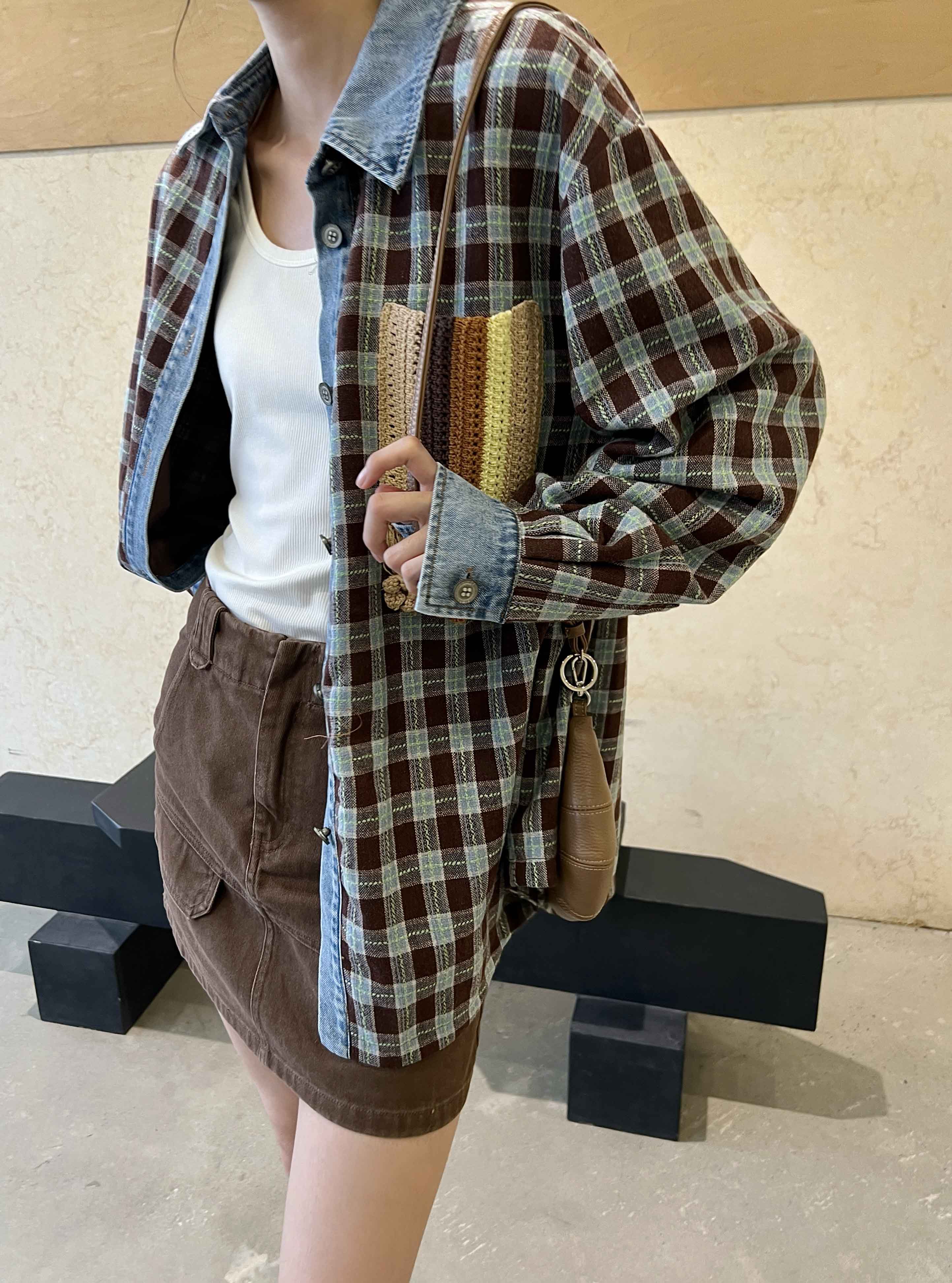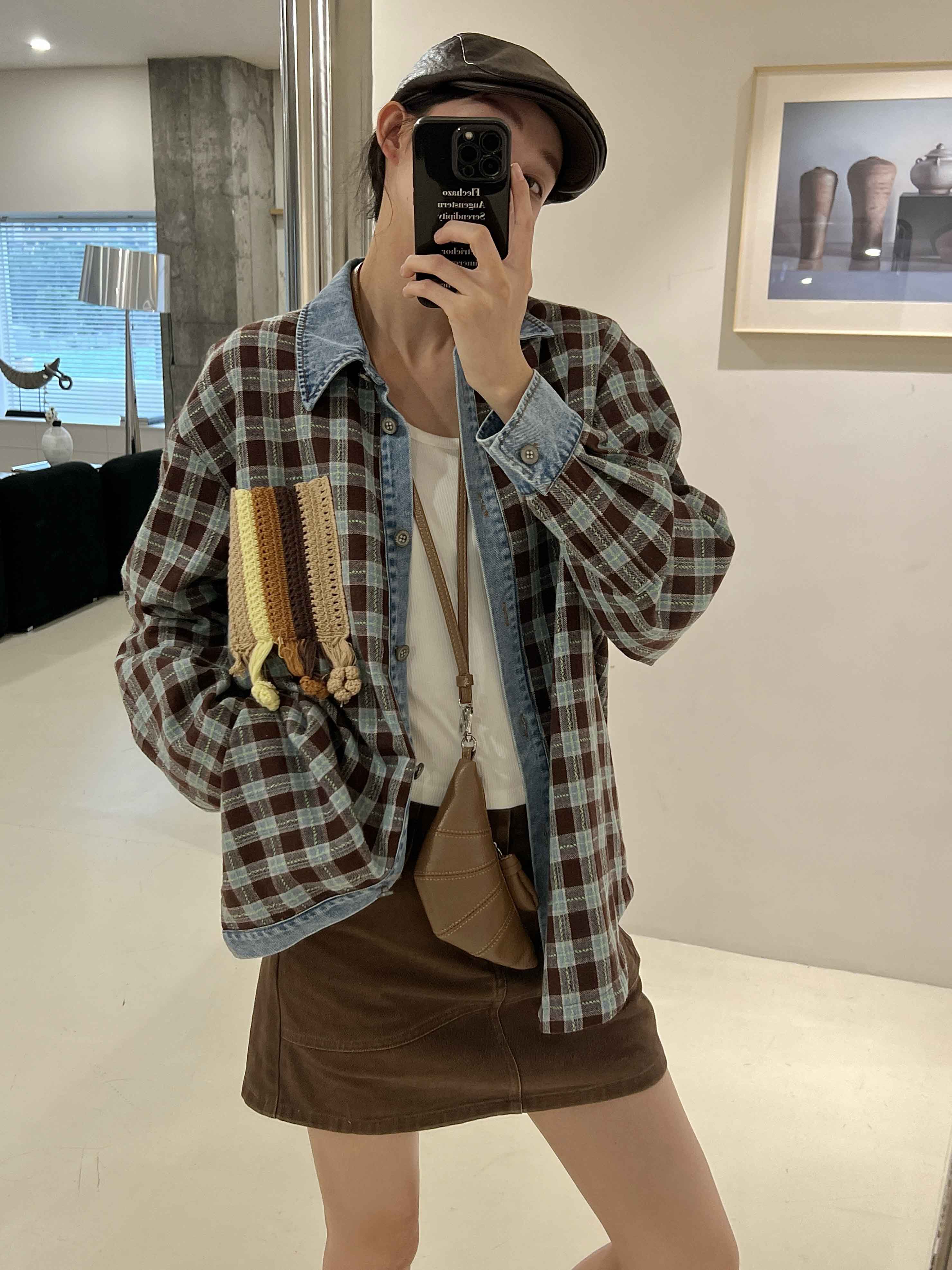 男女同款「美式复古手钩花格纹拼接牛仔廓形羊毛衬衫」开启少年感穿搭~