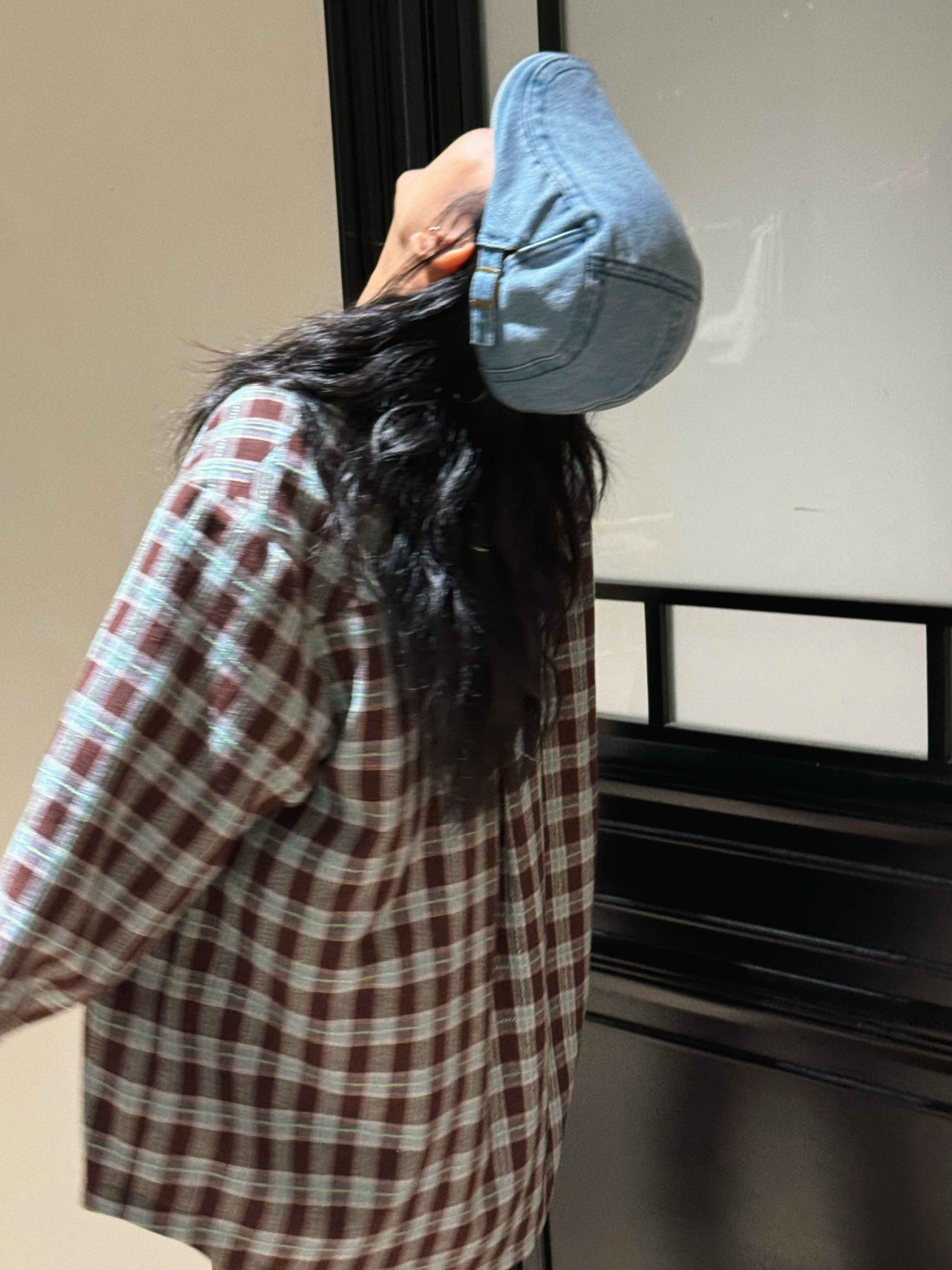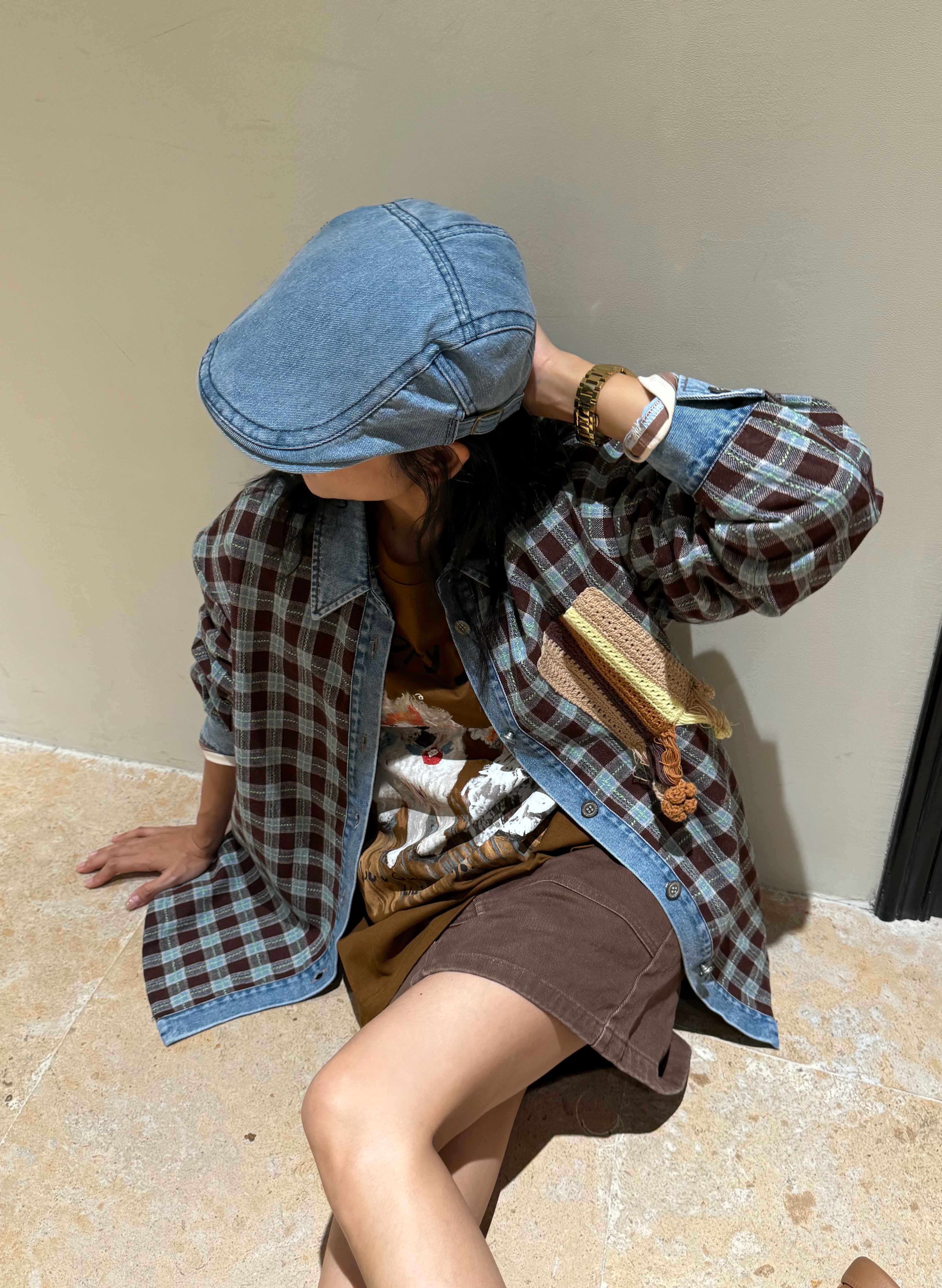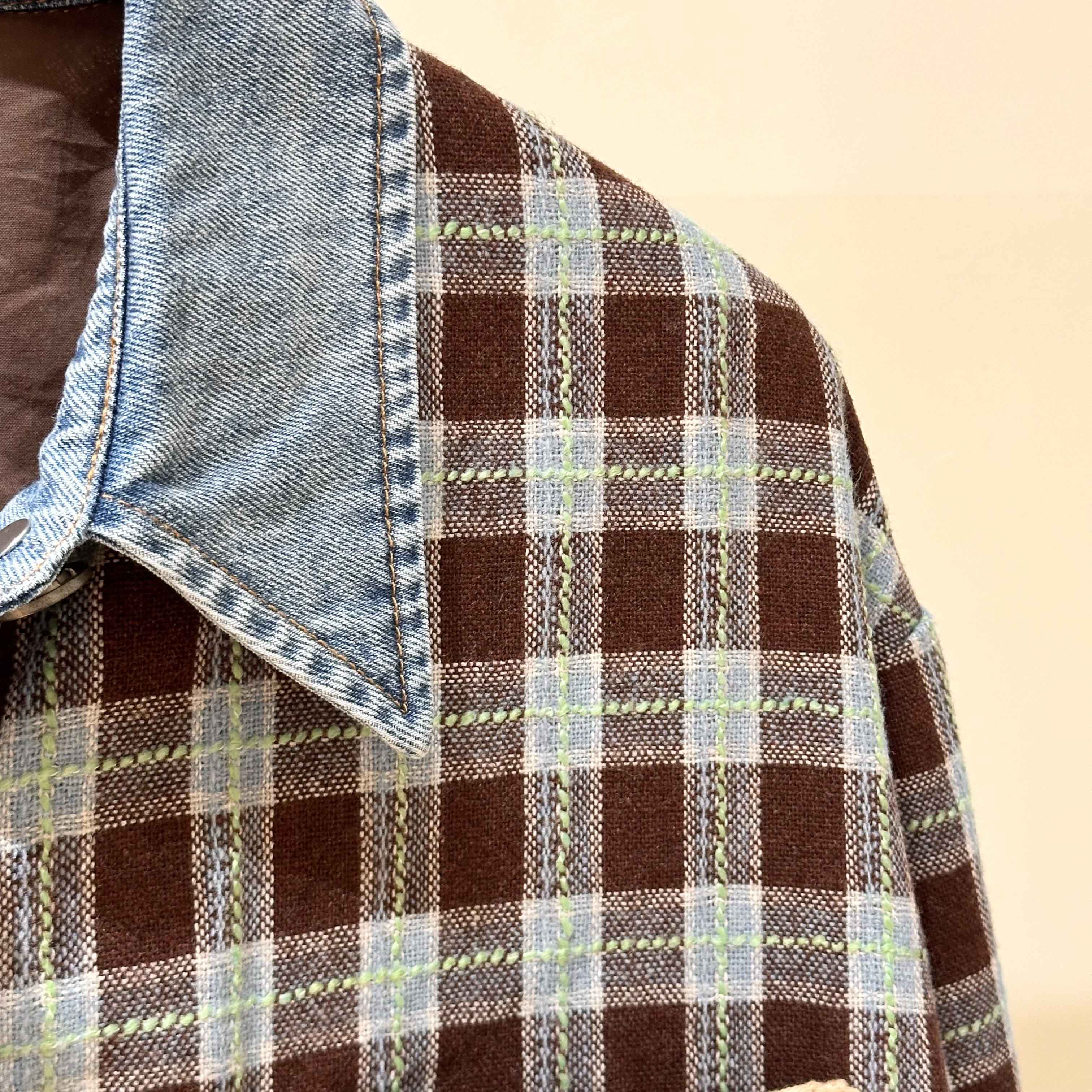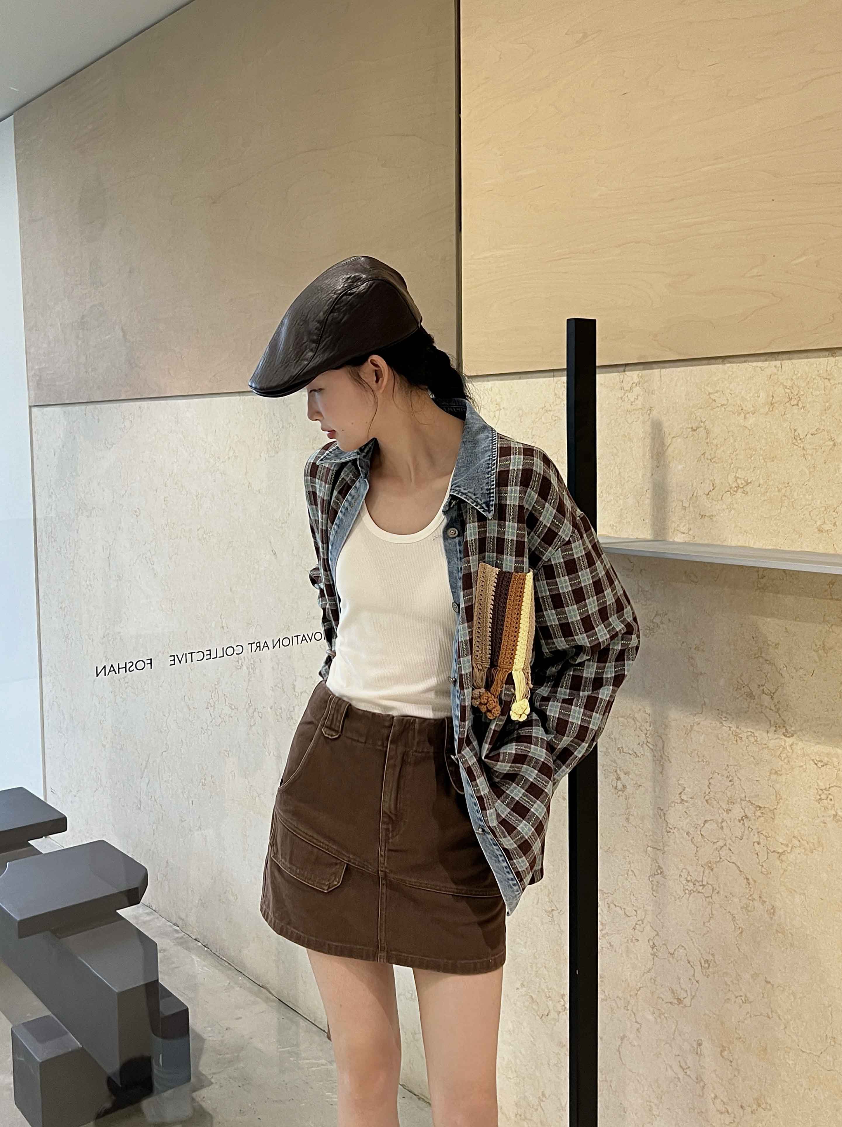 男女同款「美式复古手钩花格纹拼接牛仔廓形羊毛衬衫」开启少年感穿搭~
