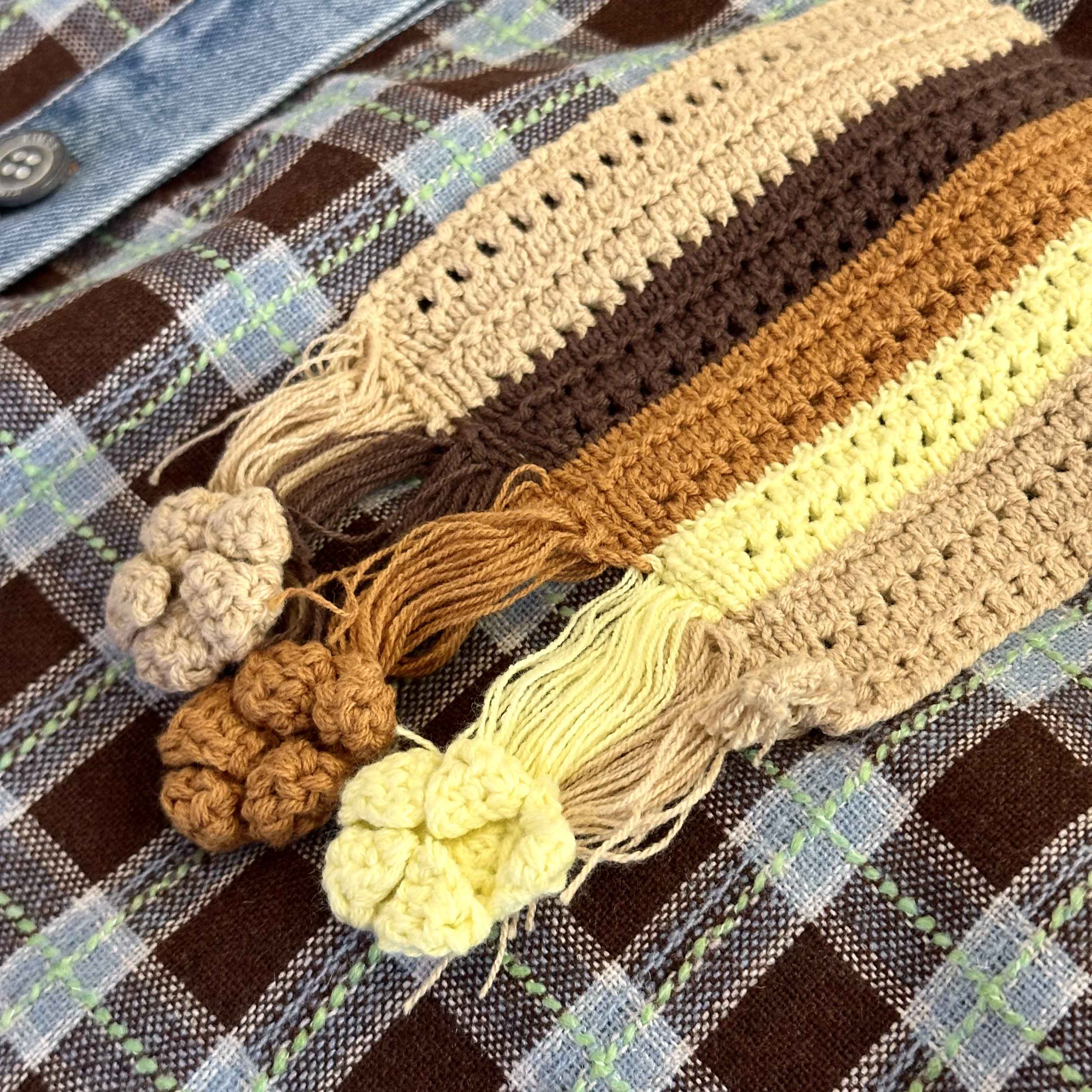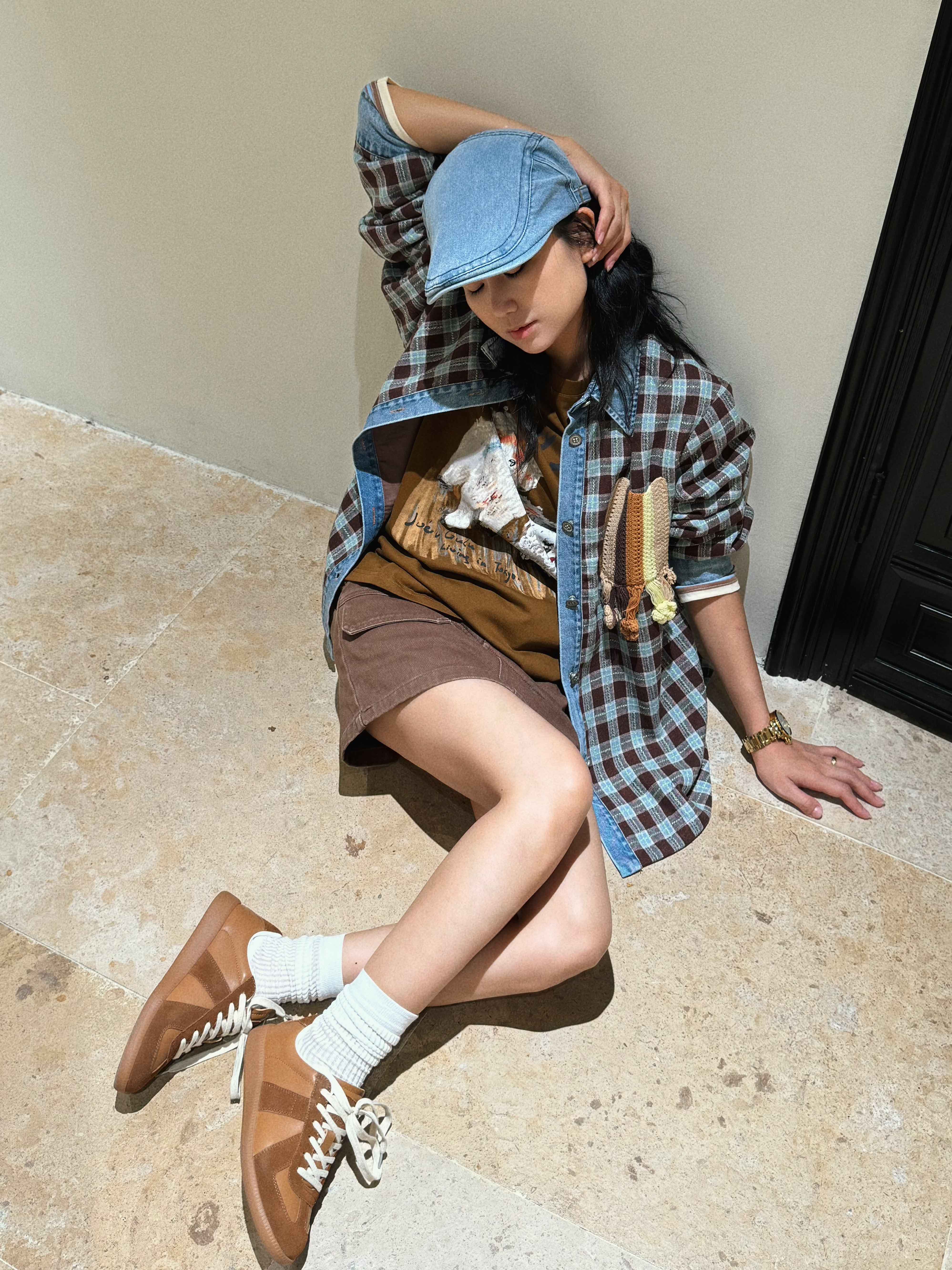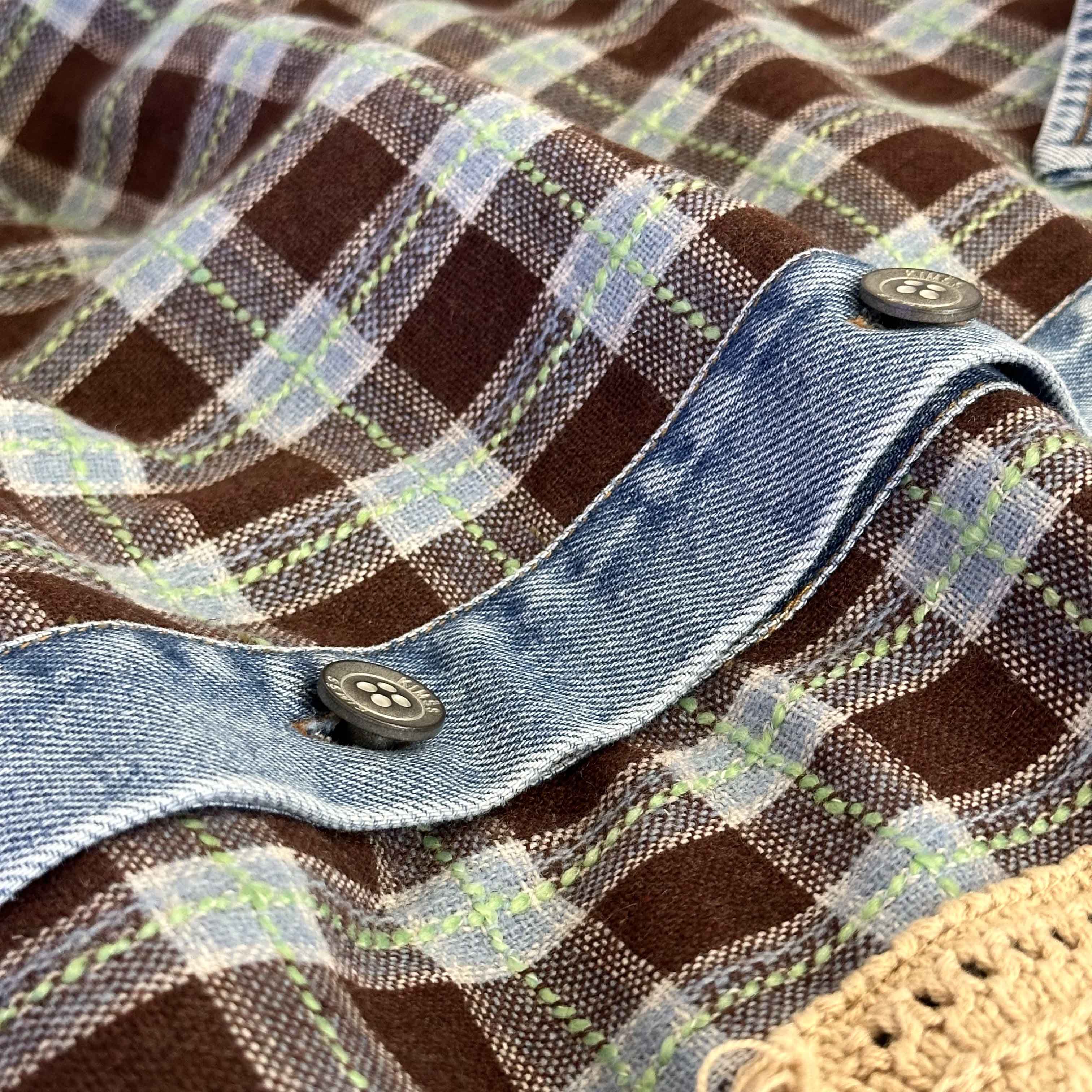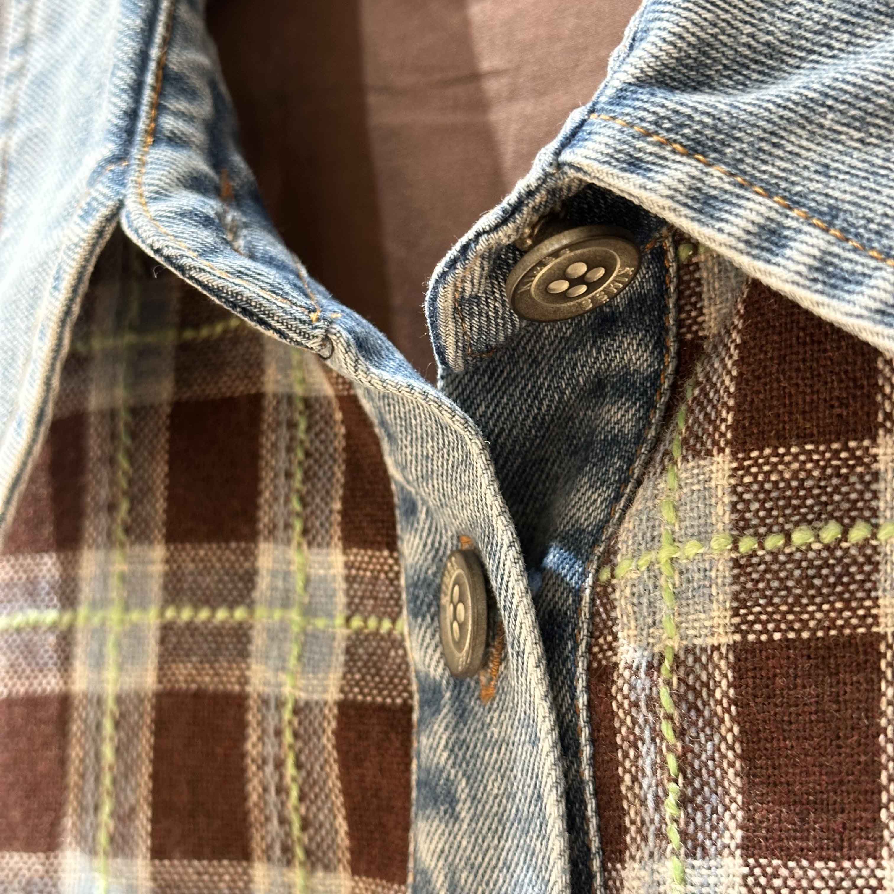 男女同款「美式复古手钩花格纹拼接牛仔廓形羊毛衬衫」开启少年感穿搭~
