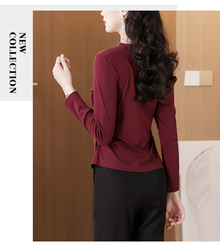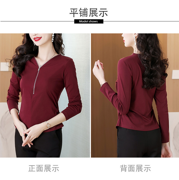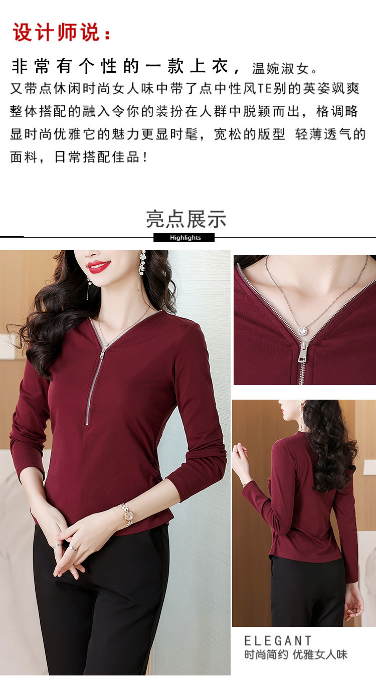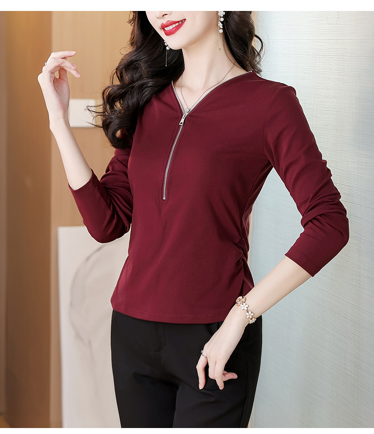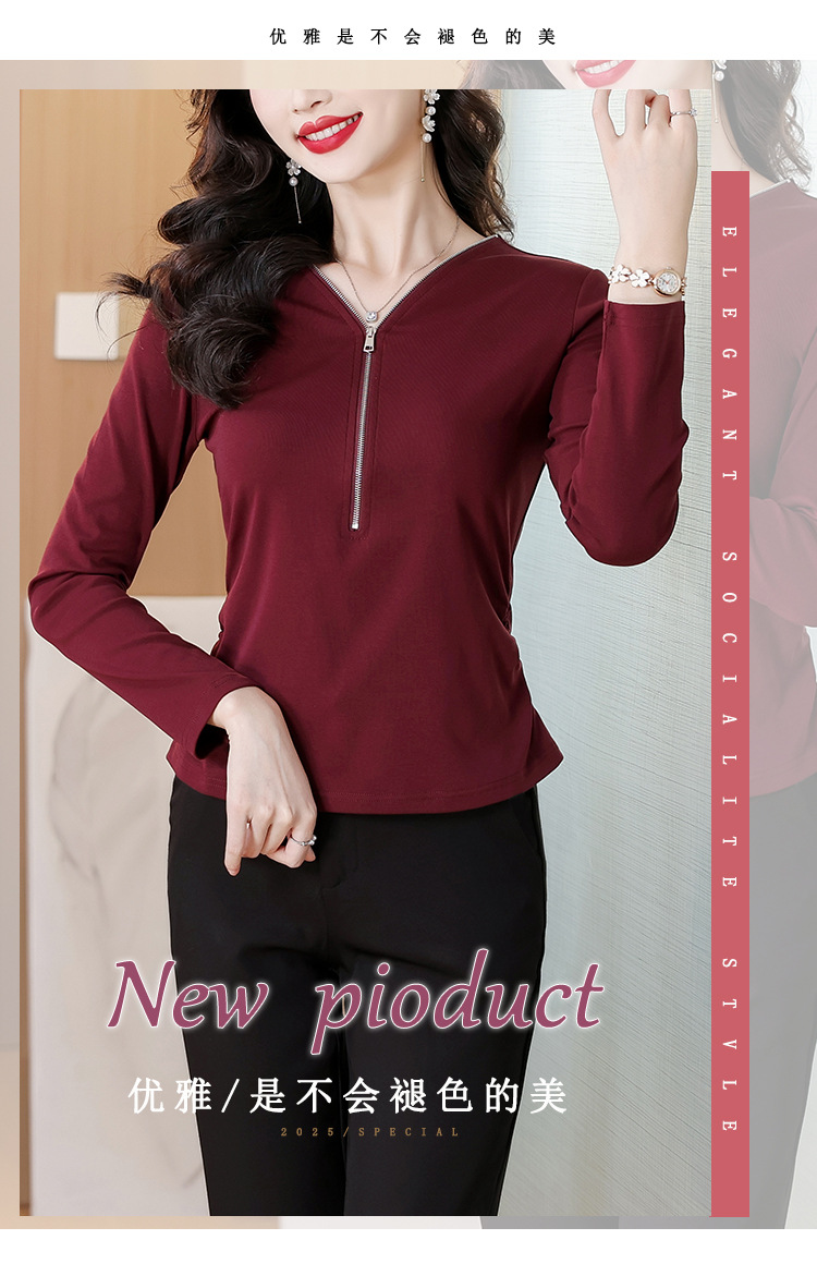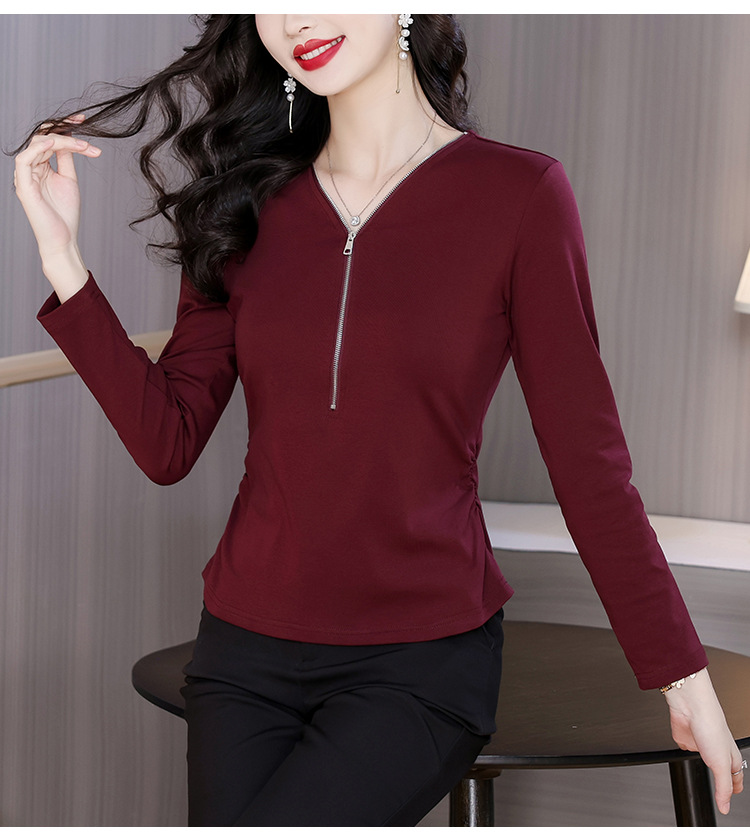 KQL A48N50166纯色V领长袖t恤抽褶修身显瘦拉链上衣