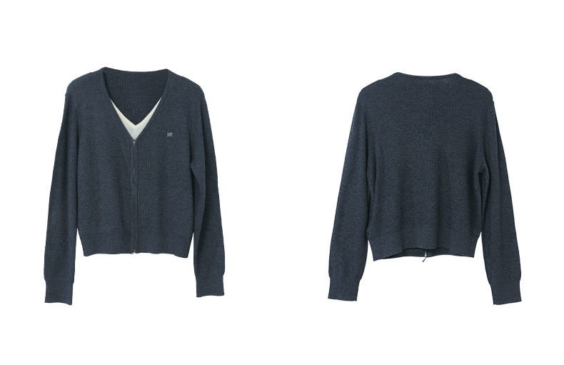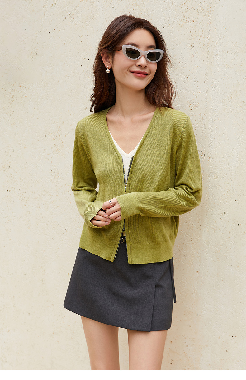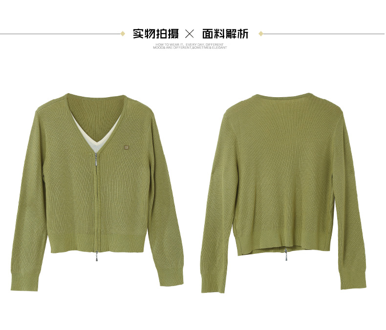 清新牛油果绿 假两件 V 领针织开衫 双拉链设计 短款时髦小外套