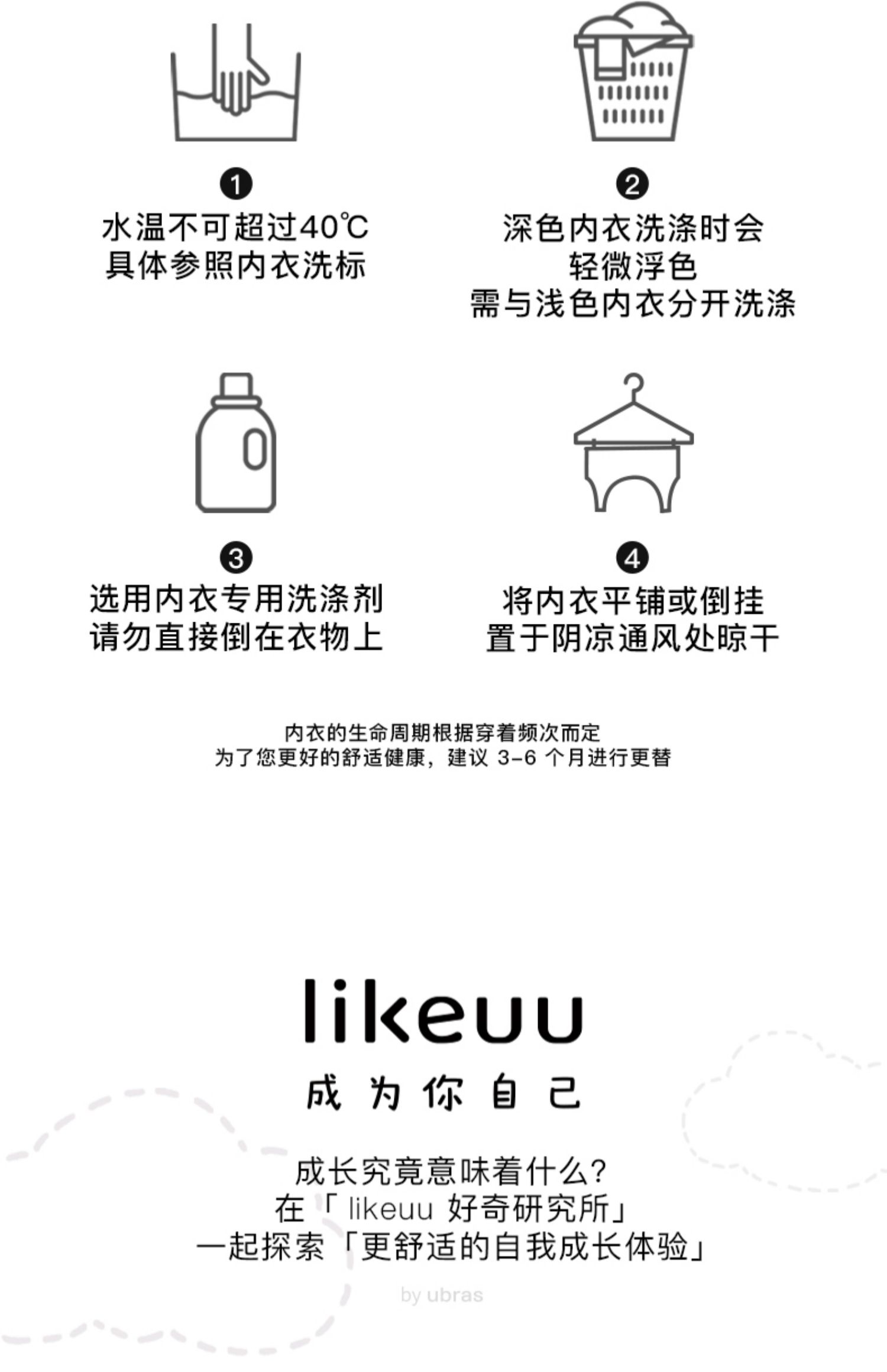 - likeuu是专注于为6~15岁的青少年创造柔软、无束缚的成长体验,以好奇心为灵感的成长发育期贴身衣物品牌。likeuu的产品覆盖内衣、内裤、保暖衣、家居服、运动等品类。