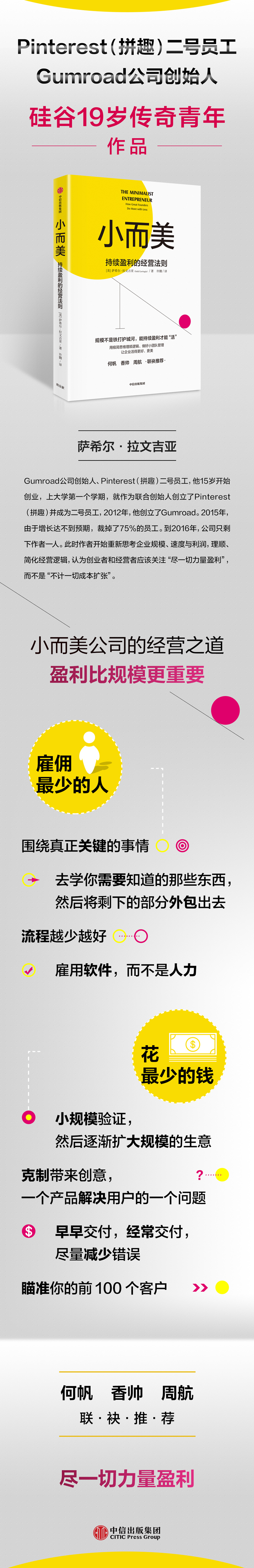 萨希尔•拉文吉亚有着颇为传奇的创业经历:15岁开始创业,上大学一个学期,就作为联合创始人创立了Pinterest(拼趣)并成为二号员工,而后放弃手上期权,开始了他的追逐独角兽之旅。2012年,他创立了Gumroad。2015 年,由于增长达不到预期,裁掉了 75% 的员工,只剩下 5 位核心员工。到 2016 年,公司只剩下作者一人。此时作者开始重新思考企业规模、速度与利润,理顺、简化经营逻辑,提出极简创业经营理念,认为创业者和经营者应该关注“尽一切力量盈利”,而不是不计一切成本扩张,专注解决客户问题,把自己热爱的、世界需要的与能赚钱的和擅长的结合起来,创造持续盈利这一企业生存的要条件。后在作者的经营下,Gumroad“起死回生”,实现超线性增长,重新为投资界所青睐,但作者却改变了思路,不再追求成为独角兽,而专注于企业的持续增长能力。