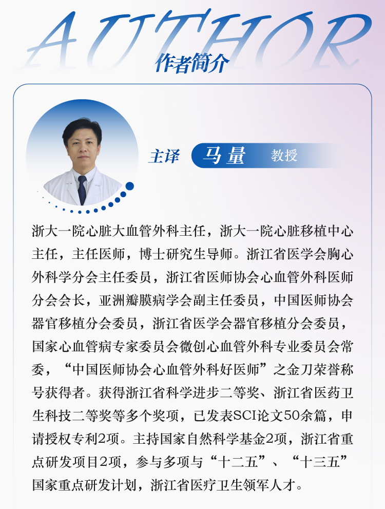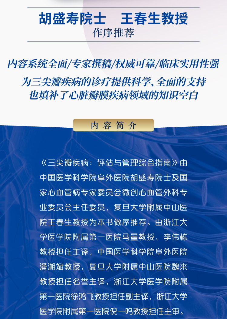 《三尖瓣疾病:评估与管理综合指南》由中国医学科学院阜外医院胡盛寿院士及国家心血管病专家委员会微创心血管外科专业委员会主任委员、复旦大学附属中山医院王春生教授为本书做序推荐。由浙江大学医学院附属第一医院马量教授、李伟栋教授担任主译,中国医学科学院阜外医院潘湘斌教授、复旦大学附属中山医院魏来教授担任名誉主译,浙江大学医学院附属第一医院徐鸿飞教授担任副主译,浙江大学医学院附属第一医院倪一鸣教授担任主审。