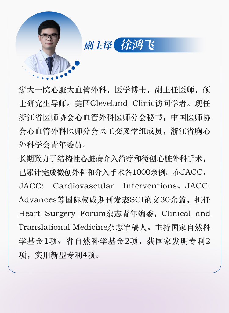 徐鸿飞,浙大一院心脏大血管外科,医学博士,副主任医师,硕士研究生导师。美国?Cleveland Clinic?访问学者。现任浙江省医师协会心血管外科医师分会秘书,中国医师协会心血管外科医师分会医工交叉学组成员,浙江省胸心外科学会青年委员。