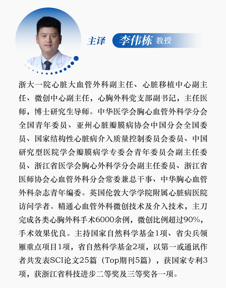 李伟栋教授,浙大一院心脏大血管外科副主任、心脏移植中心副主任、微创中心副主任,心胸外科党支部副书记,主任医师,博士研究生导师。中华医学会胸心血管外科学分会全国青年委员、亚州心脏瓣膜病协会中国分会全国委员、国家结构性心脏病介入质量控制委员会委员、中国研究型医院学会瓣膜病学专委会青年委员会副主任委员、浙江省医学会胸心外科学分会副主任委员、浙江省医师协会心血管外科分会常委兼总干事、中华胸心血管外科杂志青年编委。英国伦敦大学学院附属心脏病医院访问学者。精通心血管外科微创技术及介入技术,主刀完成各类心胸外科手术6000余例,微创比例超过90%,手术效果优良。主持国家自然科学基金1项、省尖兵领雁重点项目1项,省自然科学基金2项,以di一或通讯作者共发表SCI论文25篇(Top期刊5篇),获国家专利3项,获浙江省科技进步二等奖及三等奖各一项。