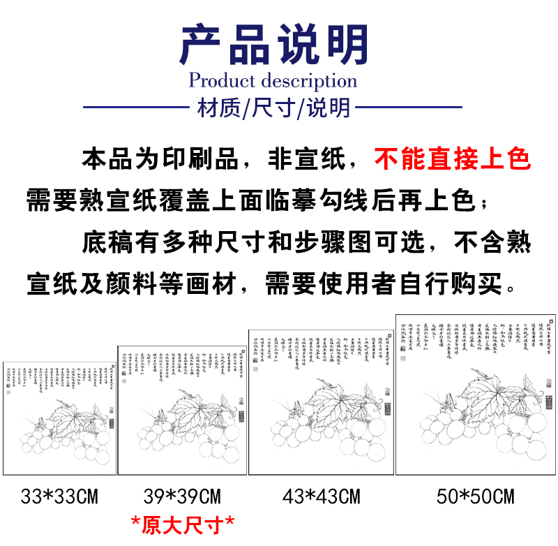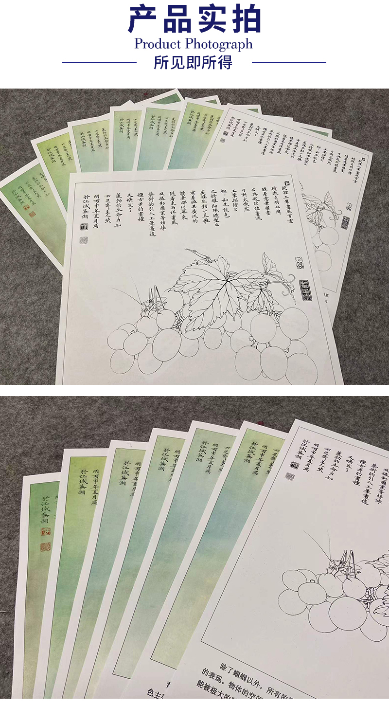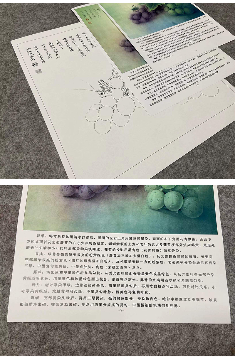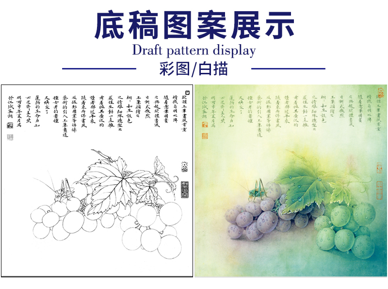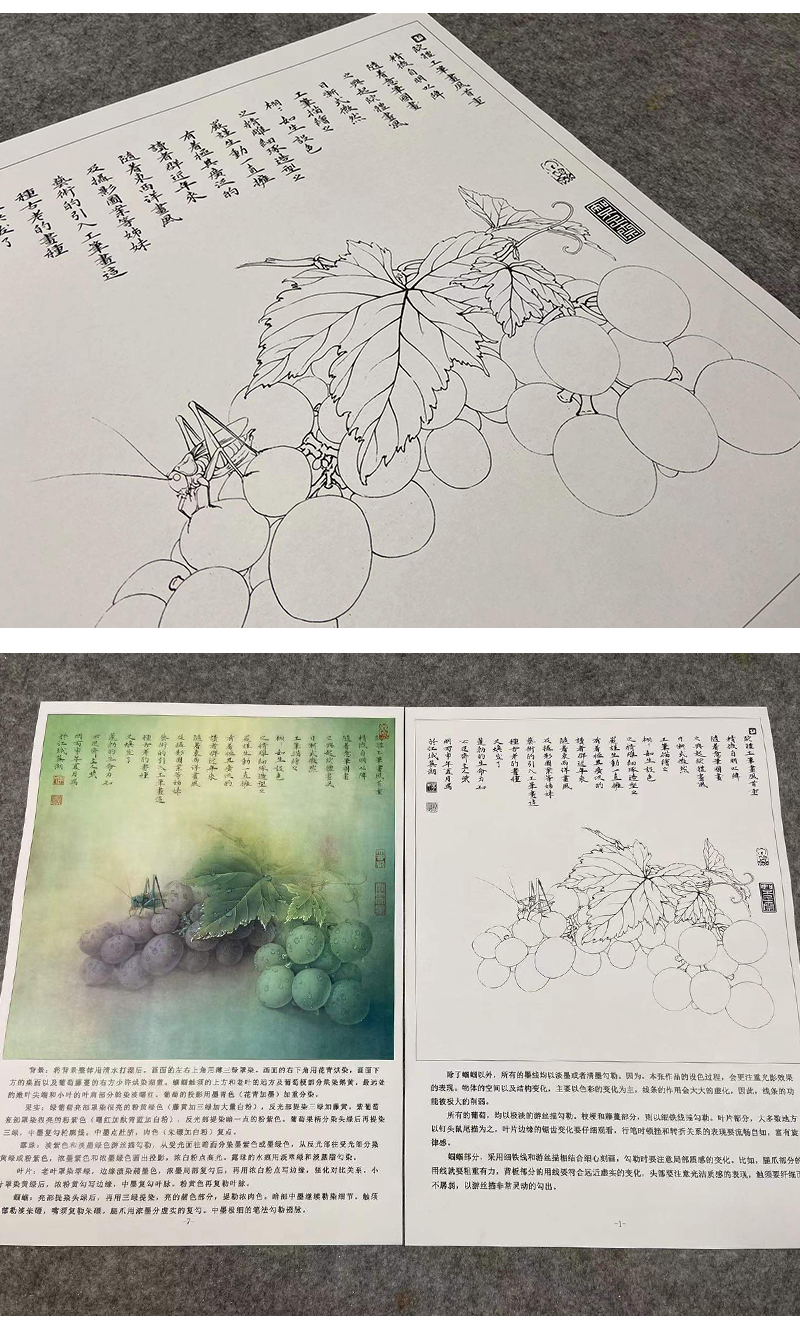 【有步骤、大彩图】李晓明工笔画白描底稿斗方小品《葡萄螽斯图》葡萄初学者临摹勾线花鸟线稿KA11