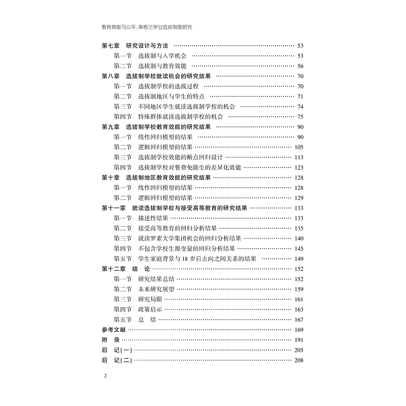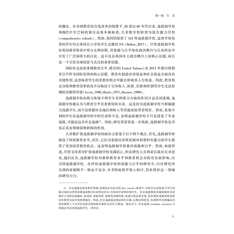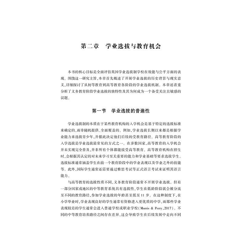 本书为作者的博士学位论文,曾获英国教育学会2021年博士论文奖(仅两名)。本书考察了学业选拔制度对教育公平与效能的影响,考虑选拔制学校的扩张或取消是否会带来一个更公平、更有效的教育系统。着眼于学业选拔制系统下教育资源的分配情况,并考察其与学生家庭背景之间的关系,分析学业选拔制度是否会强化学生个人的家庭背景及其未来教育路径之间的关联。在教育效能方面,根据学生的学业成绩和高等教育参与模式,运用增值评价的方式,通过断点回归等模型对选拔制学校的教育效能进行评价。