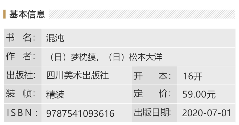 梦枕貘充满节奏的文字,松本大洋兼具怀旧感和新鲜感的插画,激发了读者对“混沌”这种生物的兴趣和想象。仿佛一阵新鲜而温柔的风,在不知不觉间吹入了我们平淡的日常。请一定要和可爱的“混沌”在这本书中见面。——日刊工业新闻