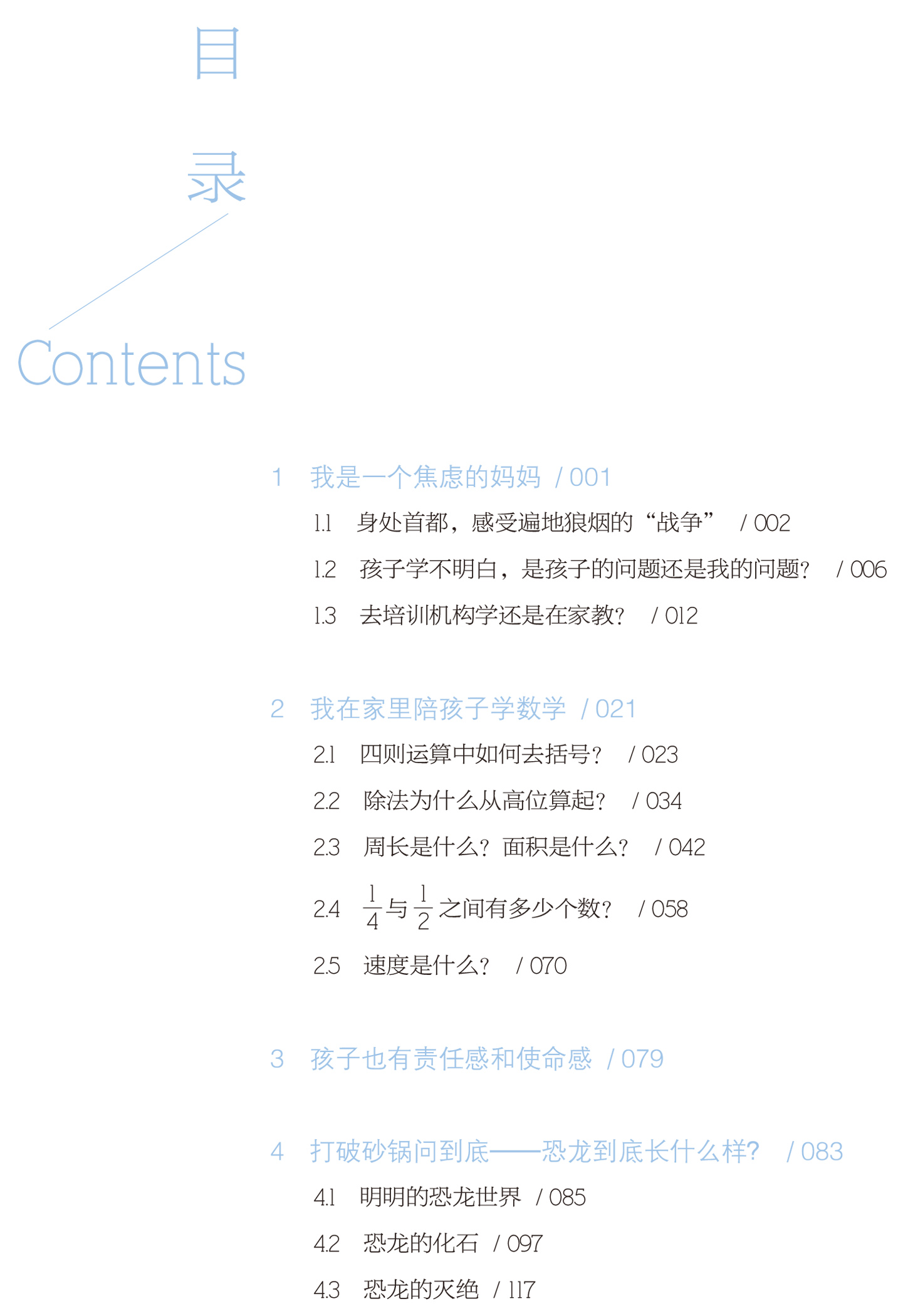 本书基本上是按时间顺序来写的,涉及的面较为宽泛,讲了数学,讲了科学,还讲了需要培养孩子的责任心、科学精神和终身学习的态度等。只要稍微仔细阅读全文,我们就不难发现作者在引导孩子学习数学知识和科普知识的过程中努力培养孩子的责任心、使命感、科学精神和终身学习的态度,这些能力和生活态度都是我们孩子未来走入社会中最需要的品质和能力,作者却在与孩子的互动学习中“润物细无声”地把这些传递给孩子,影响着孩子。在内容选取上,作者也是颇有用心。比如说“打破砂锅问到底——恐龙到底长成什么样”这一章,作者是从孩子感兴趣的恐龙开始谈起,通过逐步提问,深入地把各种深奥难懂的相关知识联系起来,让孩子了解知识的同时,培养了孩子的好奇心。接下来的“让孩子通过认识事物本质去理解知识”又是比之前的“好奇心”更深入一步的能力培养,同样又是深入浅出地引导孩子如何理解和学习知识。最后的跨界思维能力的培养和科学精神以及终身学习意识的培养,更是把孩子各种“能力”培养的渐进关系讲述得清楚明了,非常之用心!