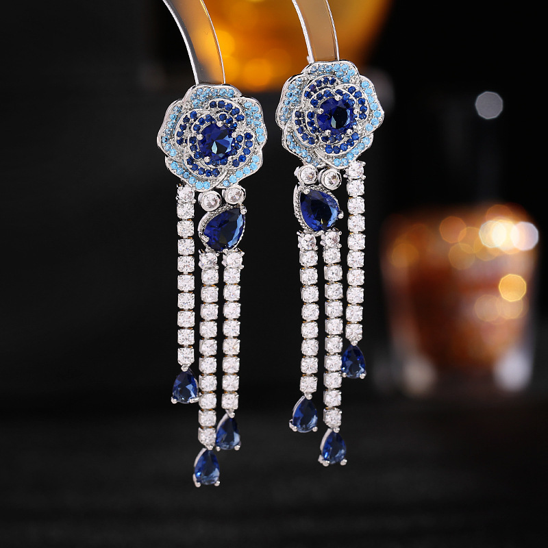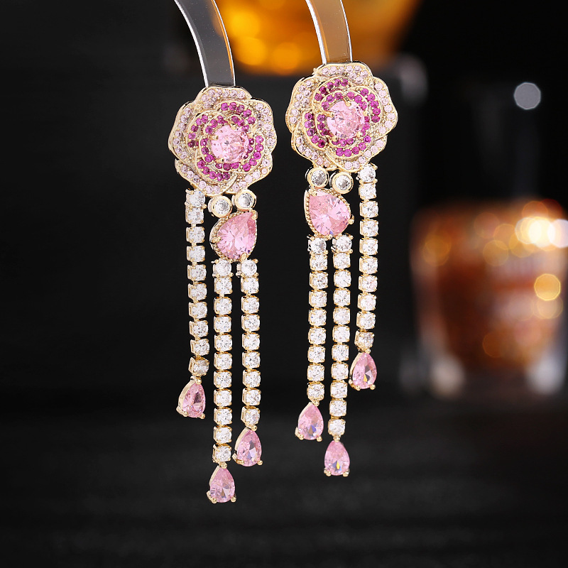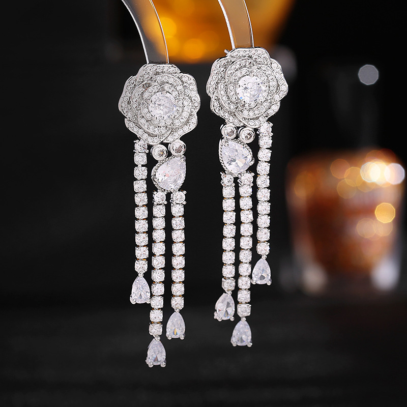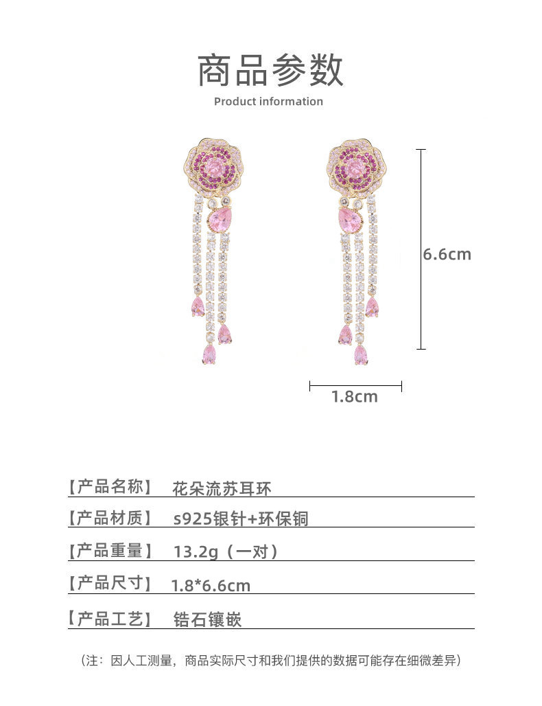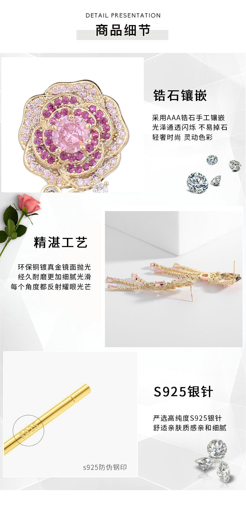 s925银针山茶花耳饰重工轻奢玫瑰花长款流苏耳环LY