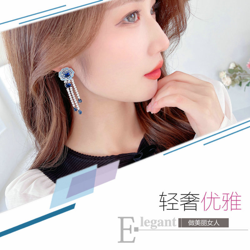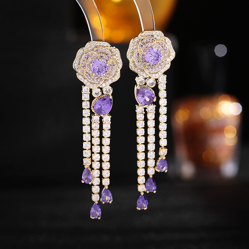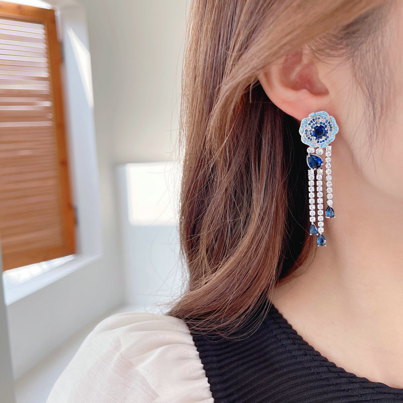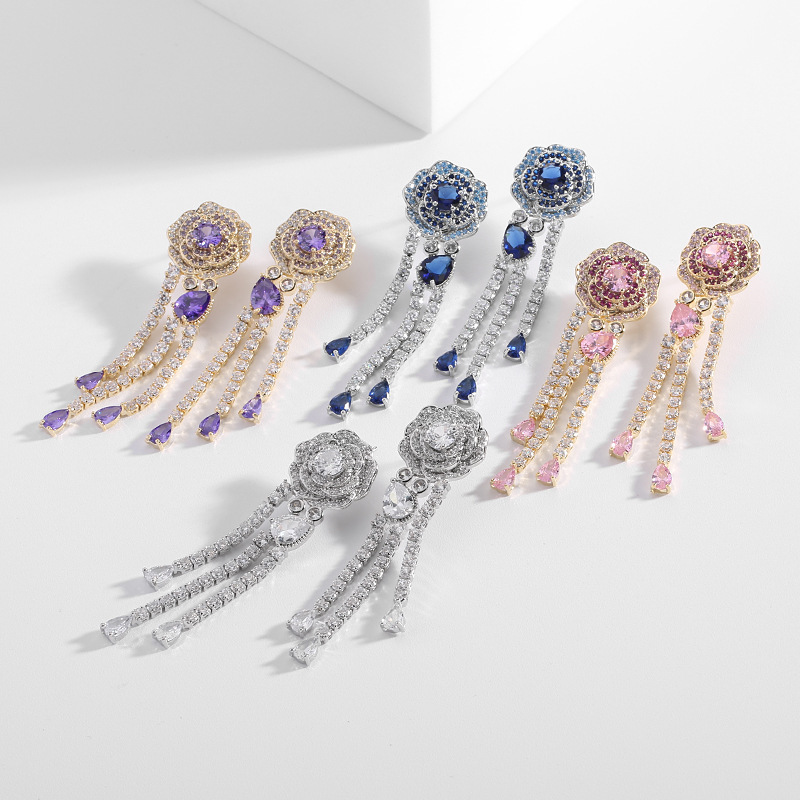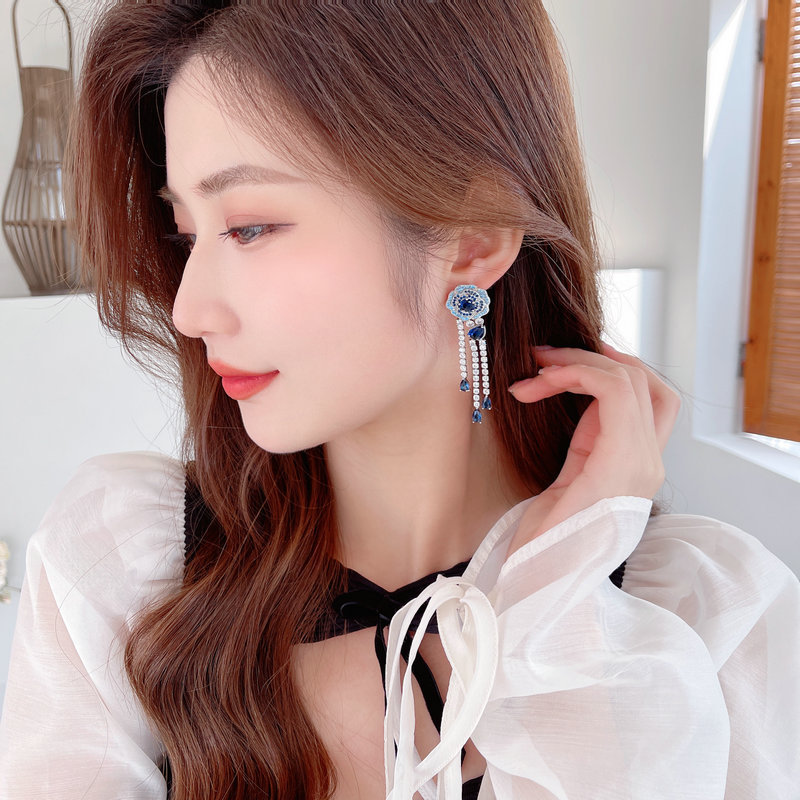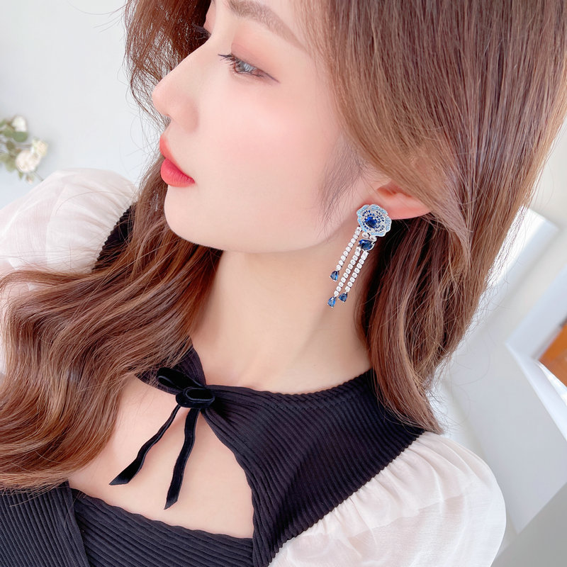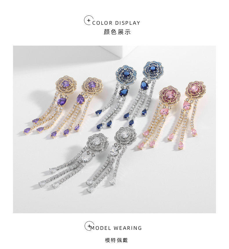 s925银针山茶花耳饰重工轻奢玫瑰花长款流苏耳环LY